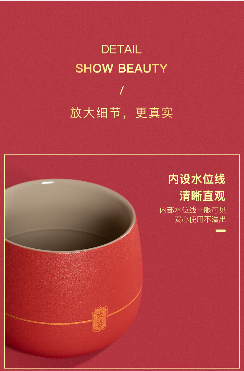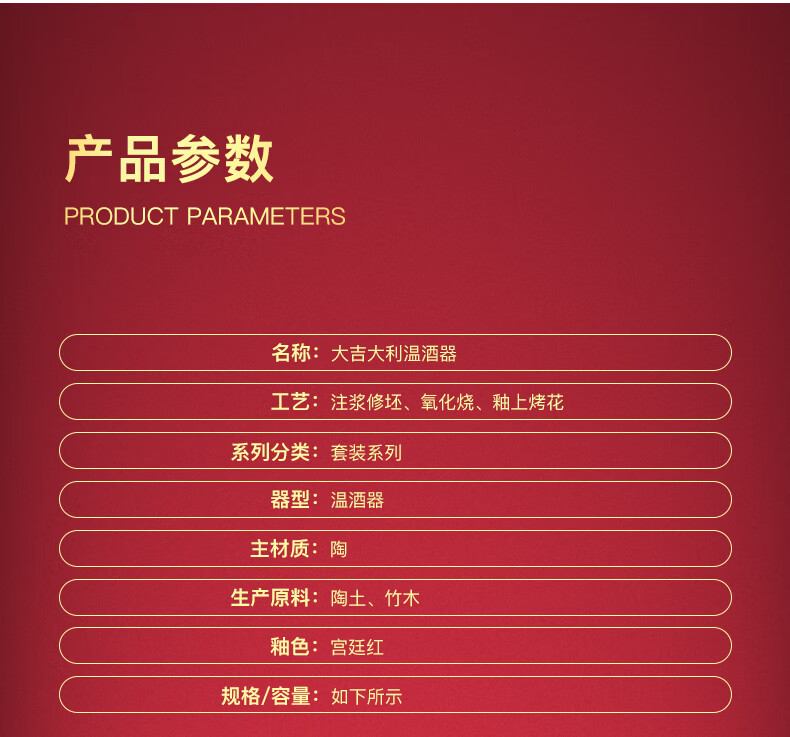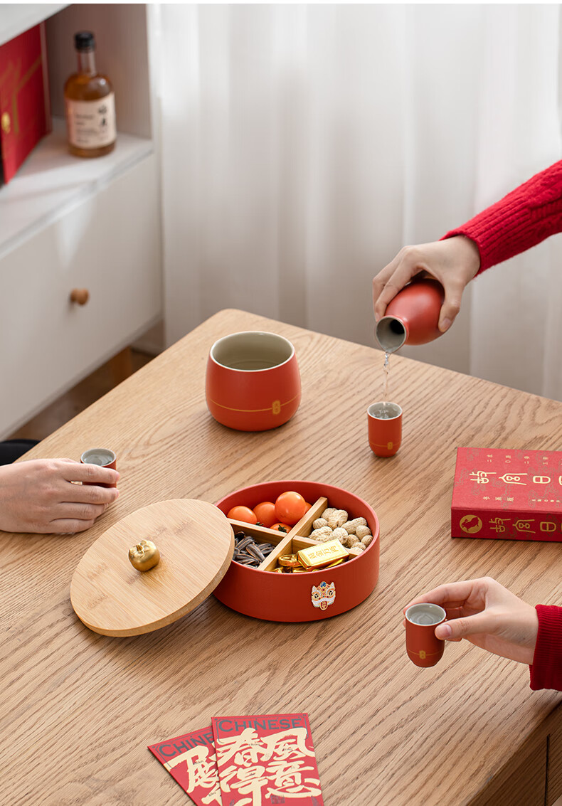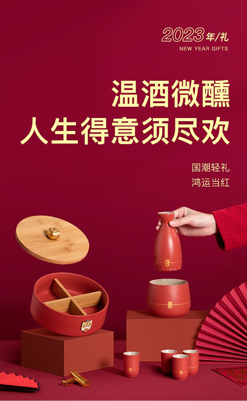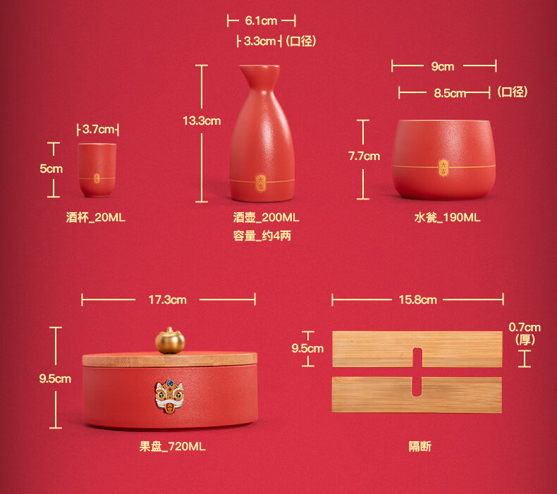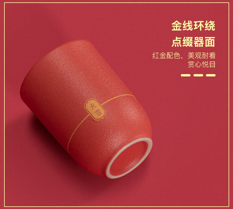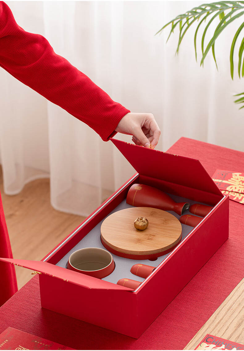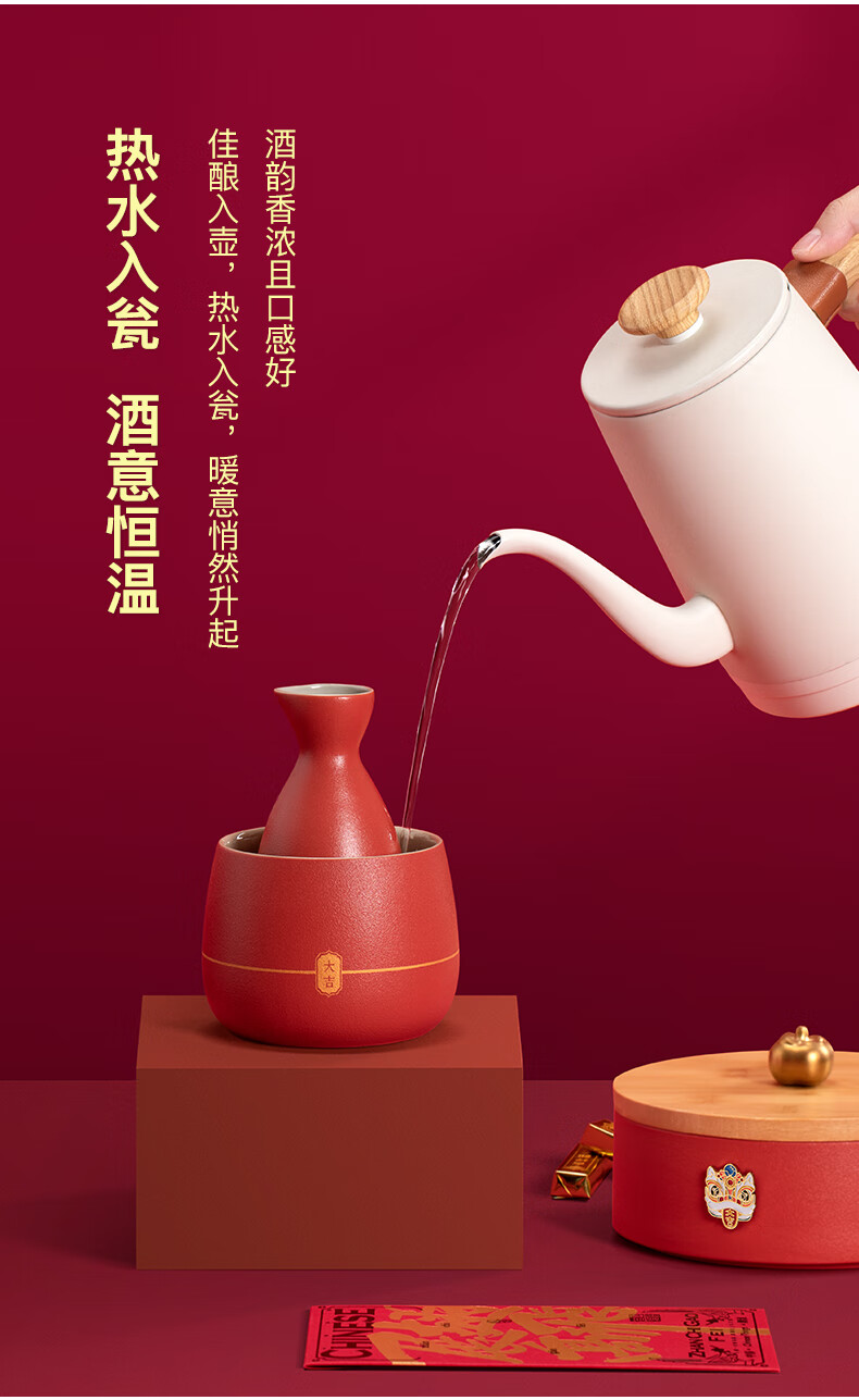 束口造型,持握省力,温热小酒好斟倒;酒具内施透明釉,光滑不吸味,喝遍各种佳酿;中国红,礼盒装,美好更上一层佳节礼赠,情谊满满。