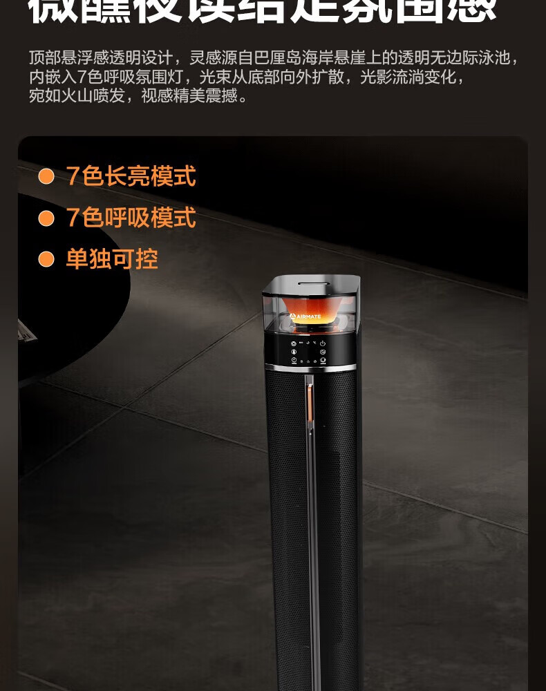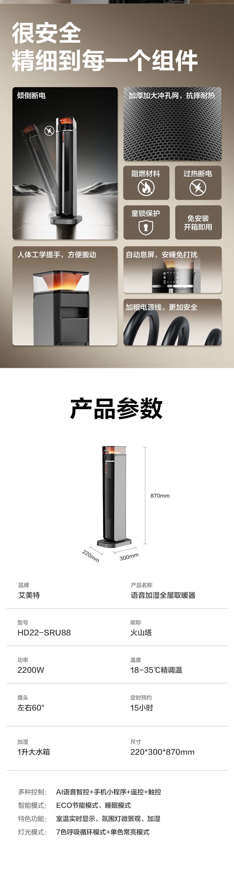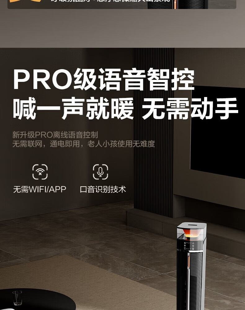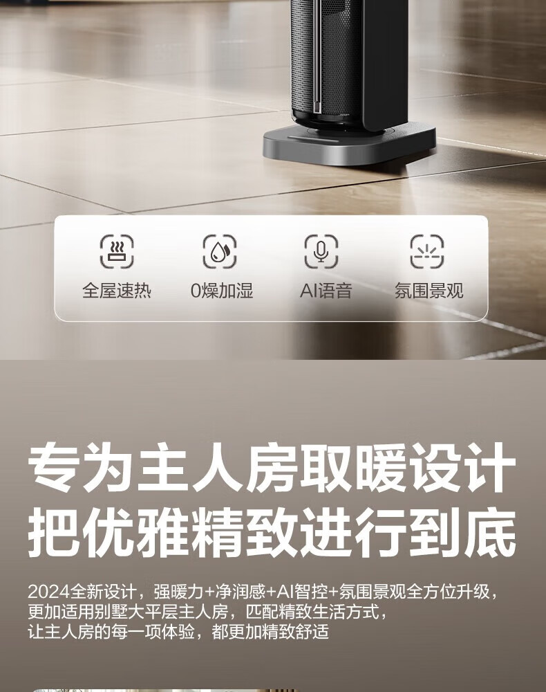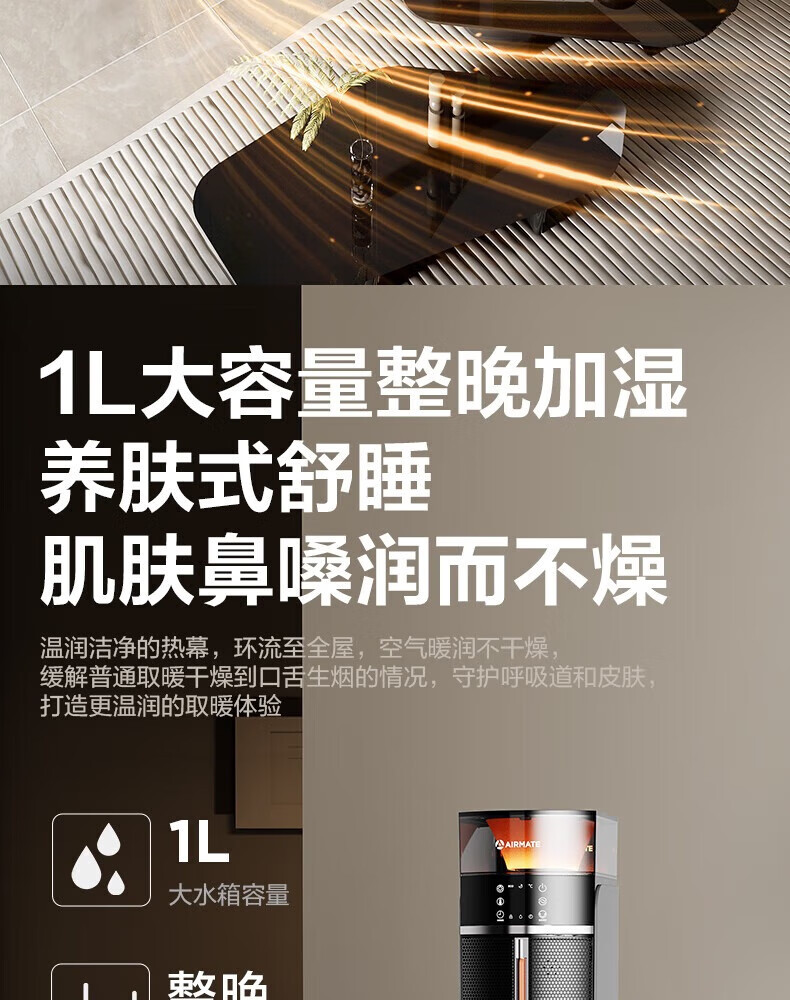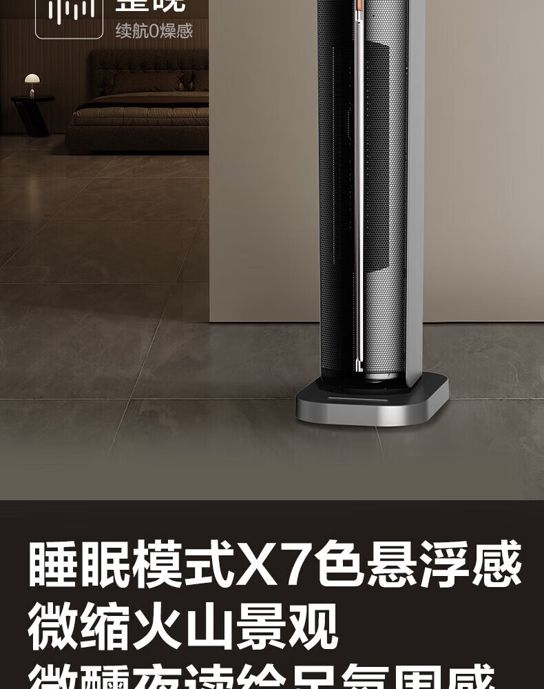 AI语音大平层取暖器,七色氛围灯;2200W大功率,高870mm;三档控温,80度宽域摆头,1L大容量水箱