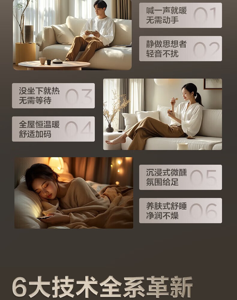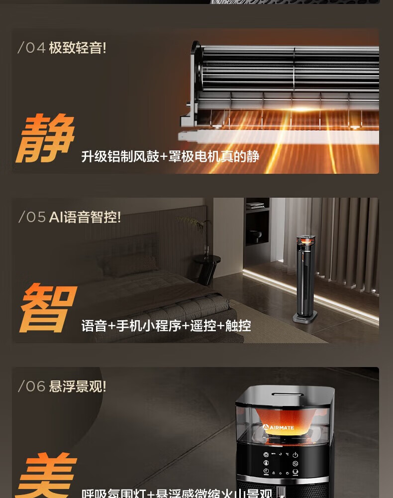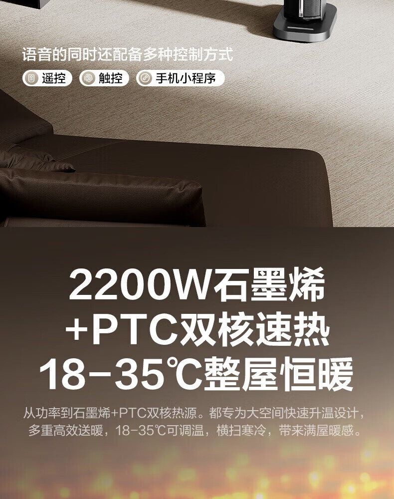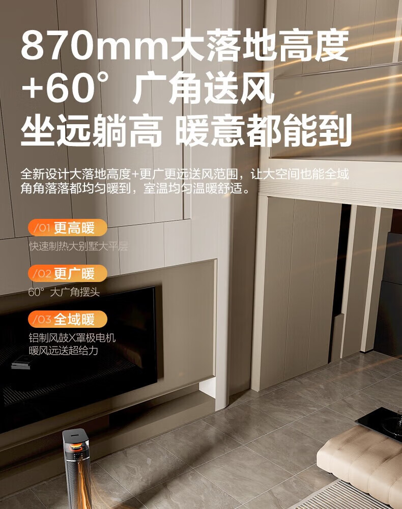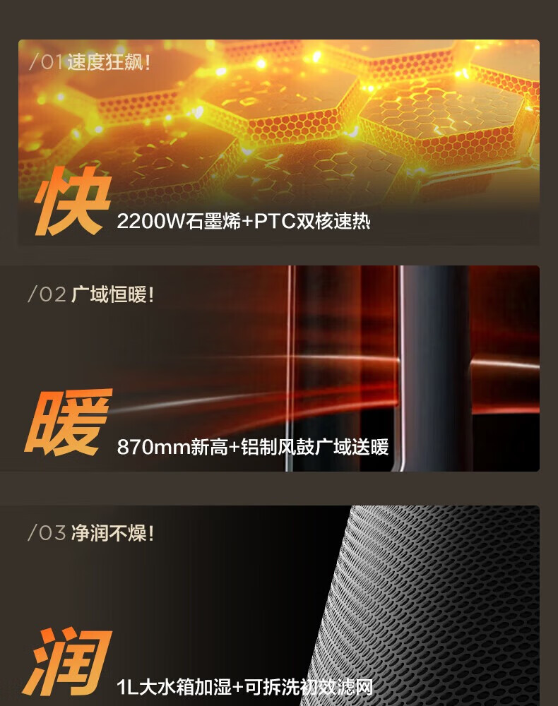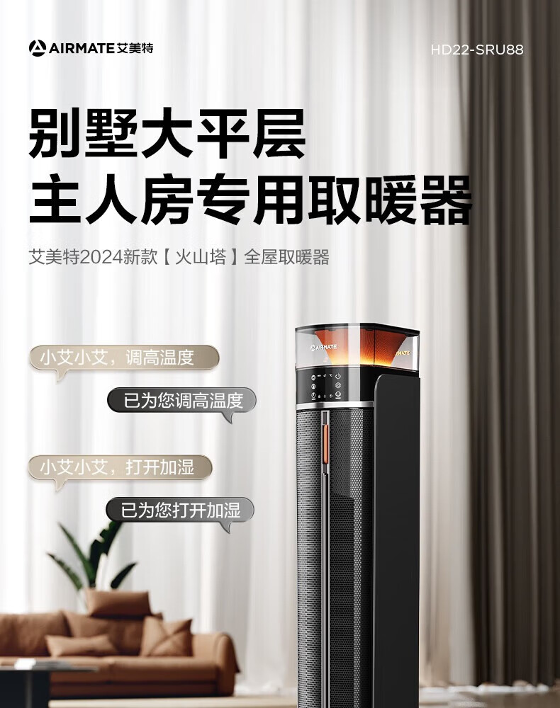 AI语音大平层取暖器,七色氛围灯;2200W大功率,高870mm;三档控温,80度宽域摆头,1L大容量水箱