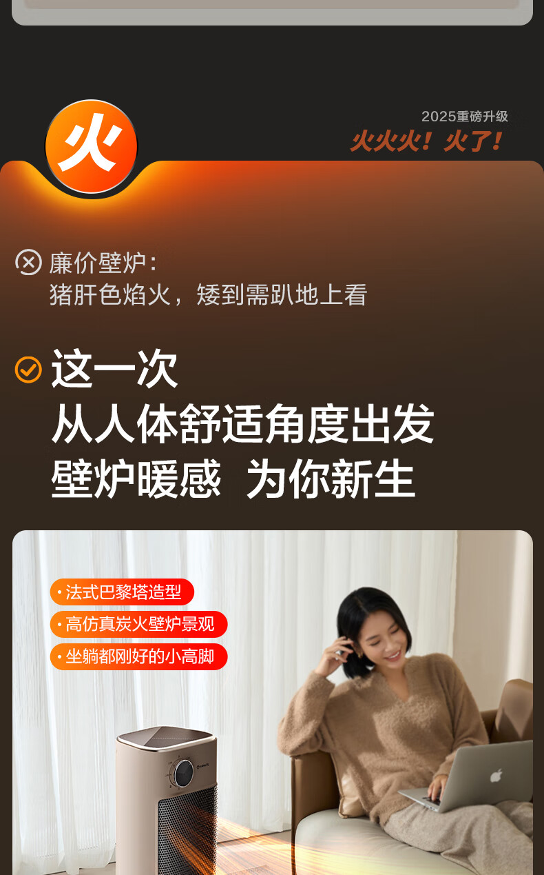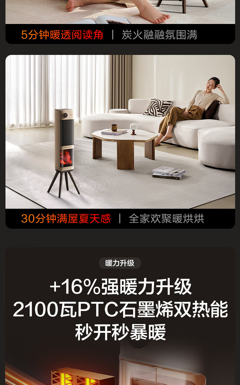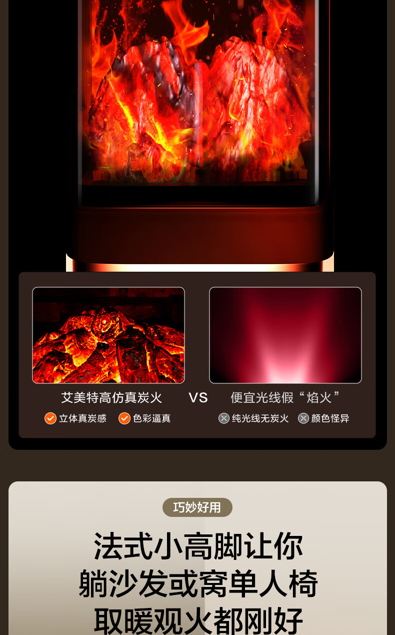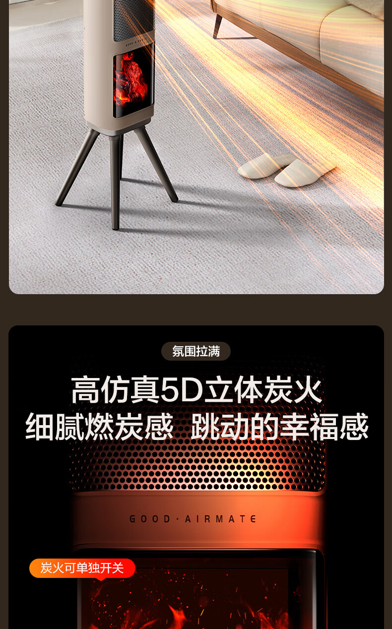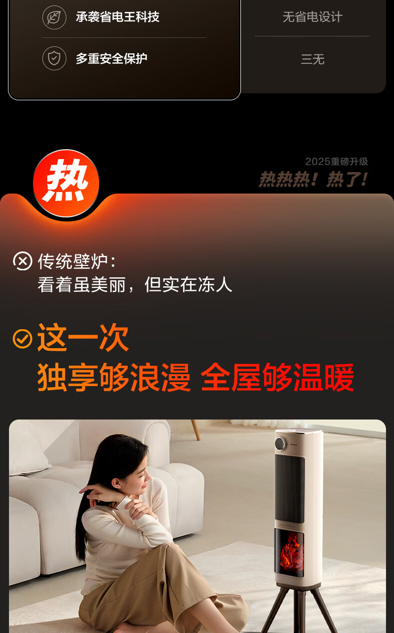2025【火热】双升级炭火融融 全屋暴暖;3000转直流风轮超4倍暖力 暖得远还静谧;抗菌石墨烯热能 暖得健康又透彻;高仿真5D立体炭火细腻燃炭感 跳动的幸褔感;法式小高脚让你躺沙发或窝单人椅取暖观火都刚好
