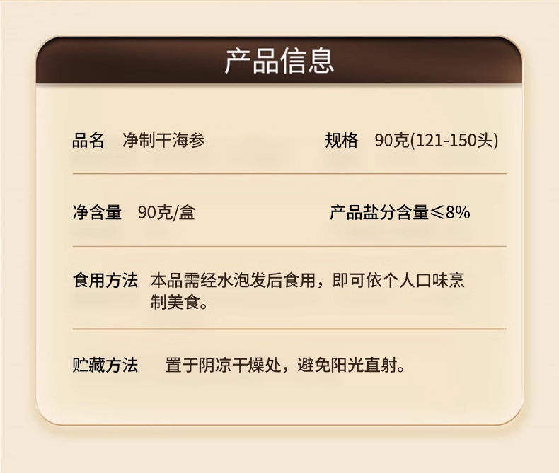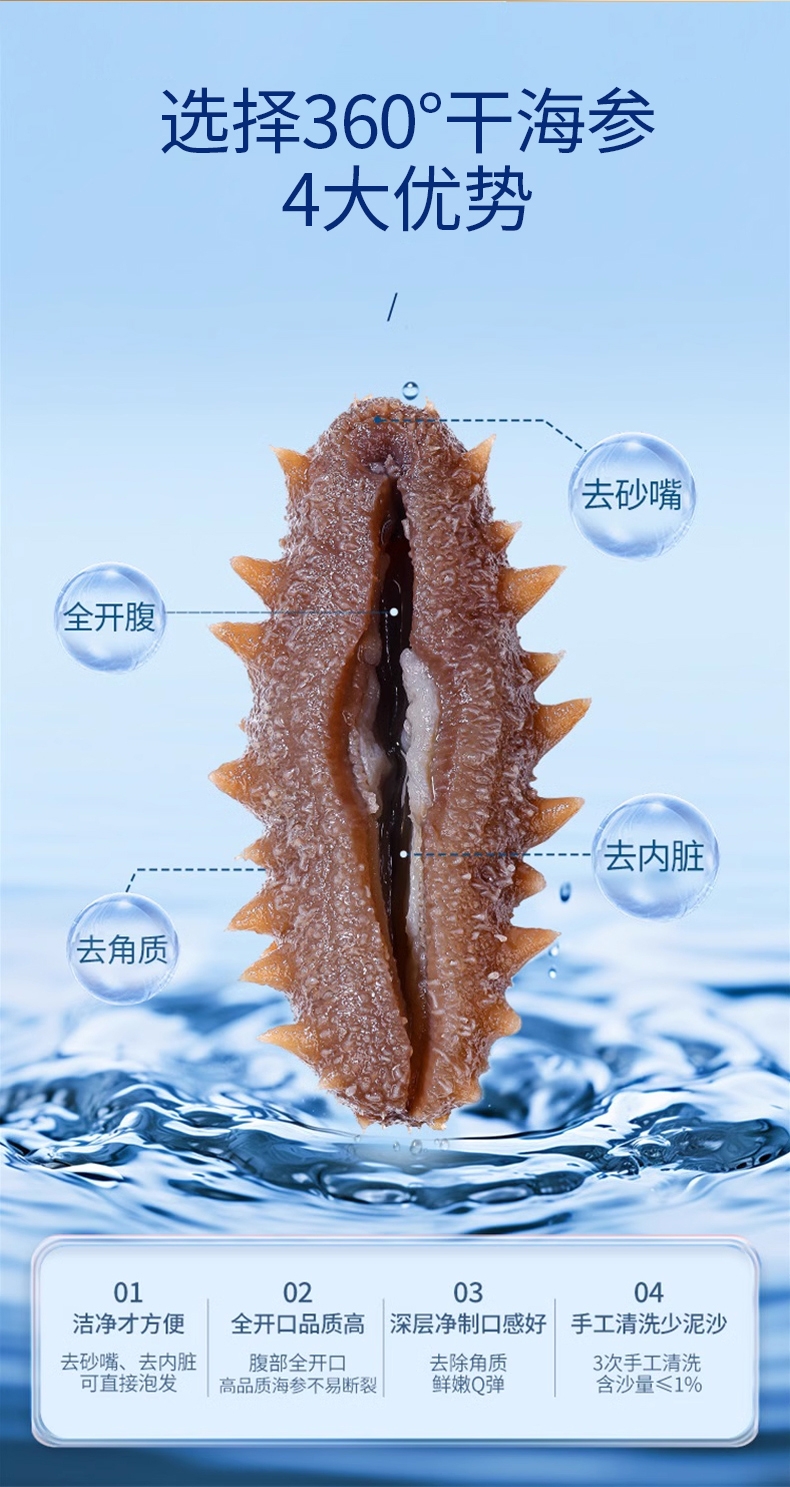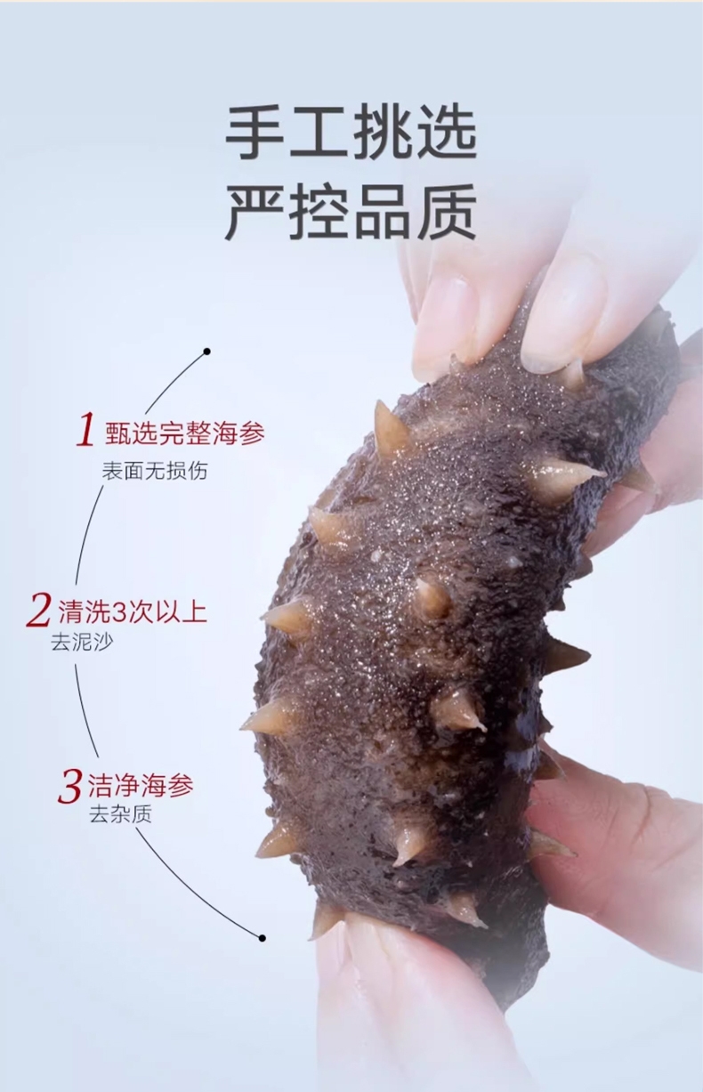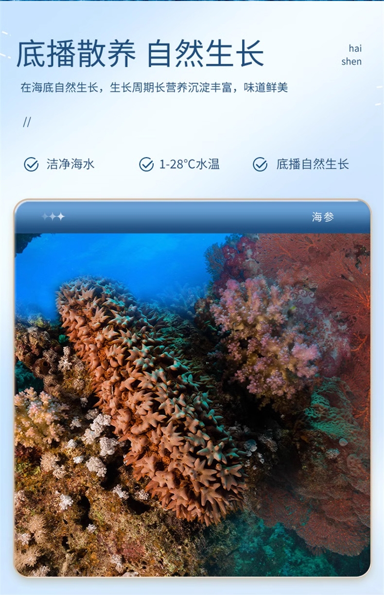 天然海场,精挑海参,肉壁厚实;参筋洁白粗壮、优选纯正大连海参;海参富含58种营养成分18种氨基酸