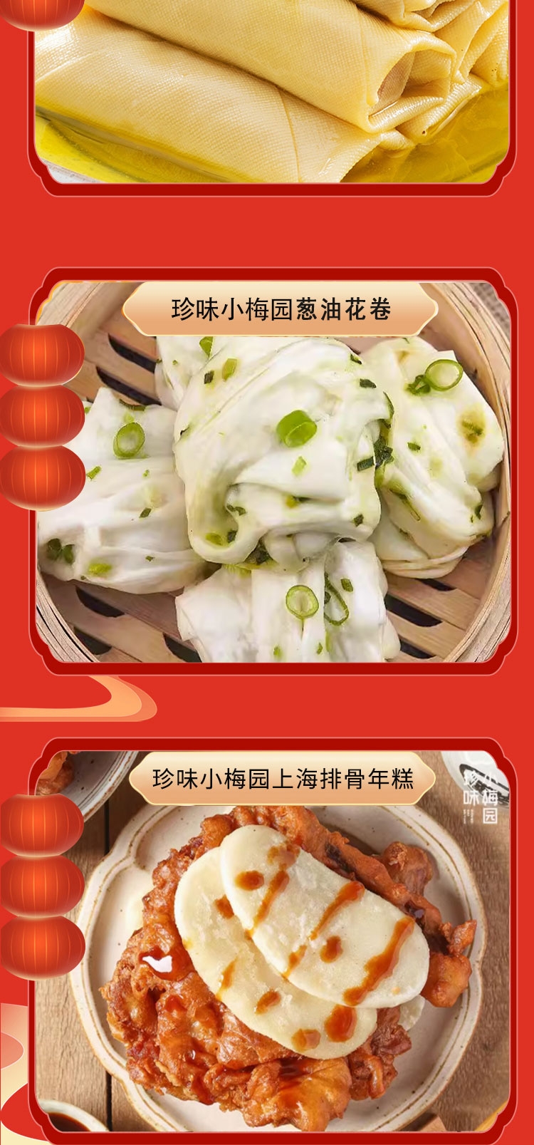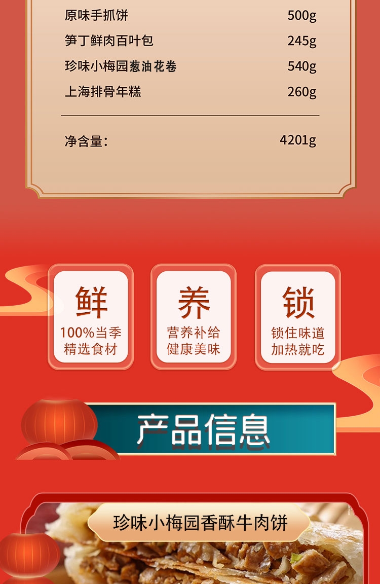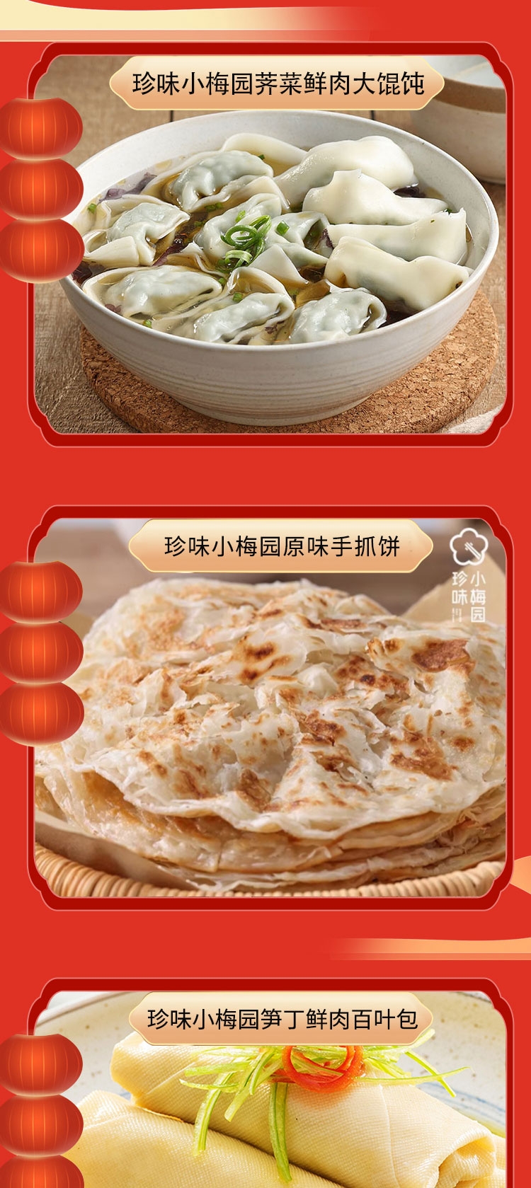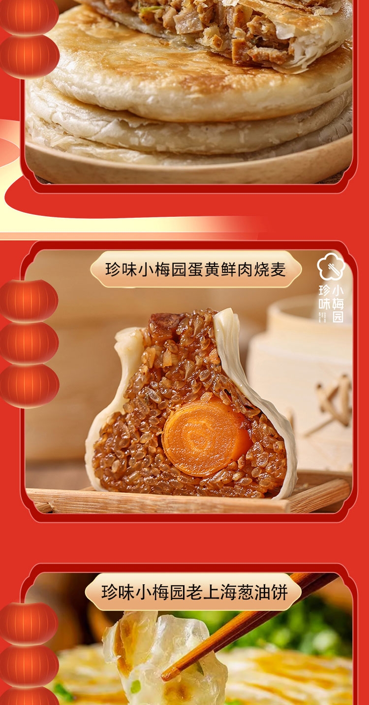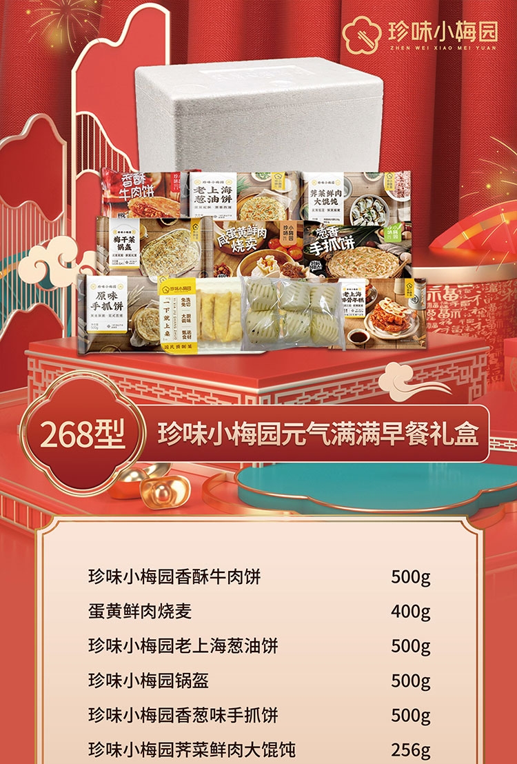 配置:珍味小梅园香酥牛肉饼500g 珍味小梅园蛋黄鲜肉烧麦400g 珍味小梅园老上海葱油饼500g 珍味小梅园锅盔500g 珍味小梅园香葱味手抓饼500g 珍味小梅园荠菜鲜肉大馄饨256g 珍味小梅园原味手抓饼500g 珍味小梅园笋丁鲜肉百叶包245g(6个) 珍味小梅园杂粮煎饼450g 珍味小梅园上海排骨年糕260g