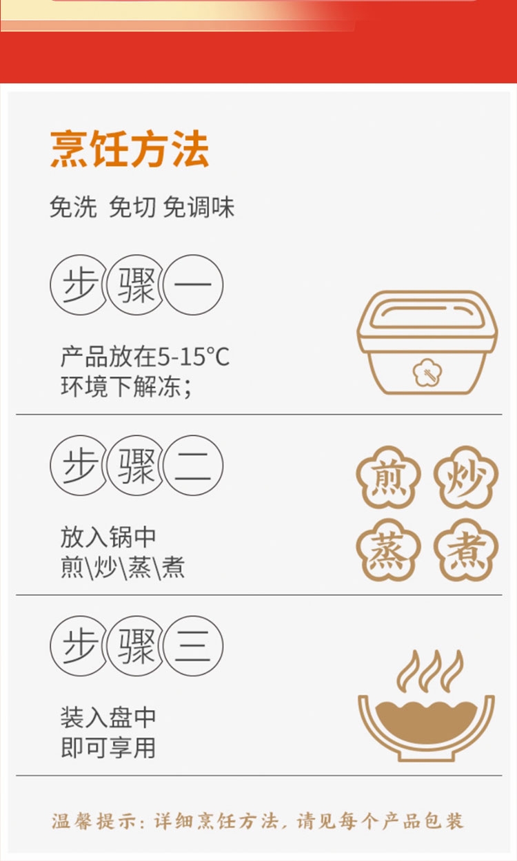 多样组合;免洗、免切、免调味;煎炒蒸煮
