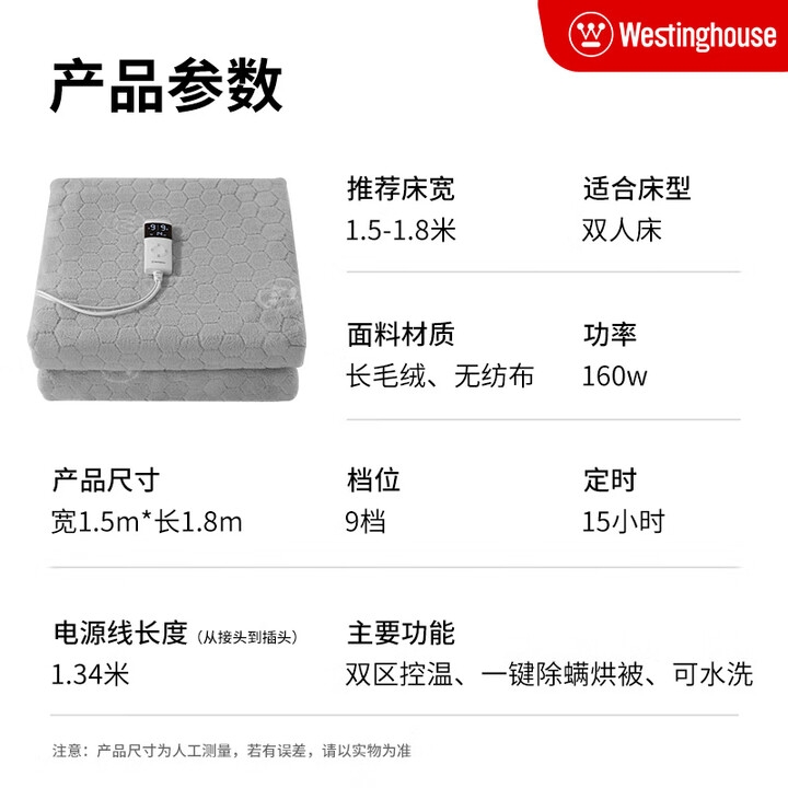 西屋 双控水洗电热毯1.5*1.8mWTH-1815