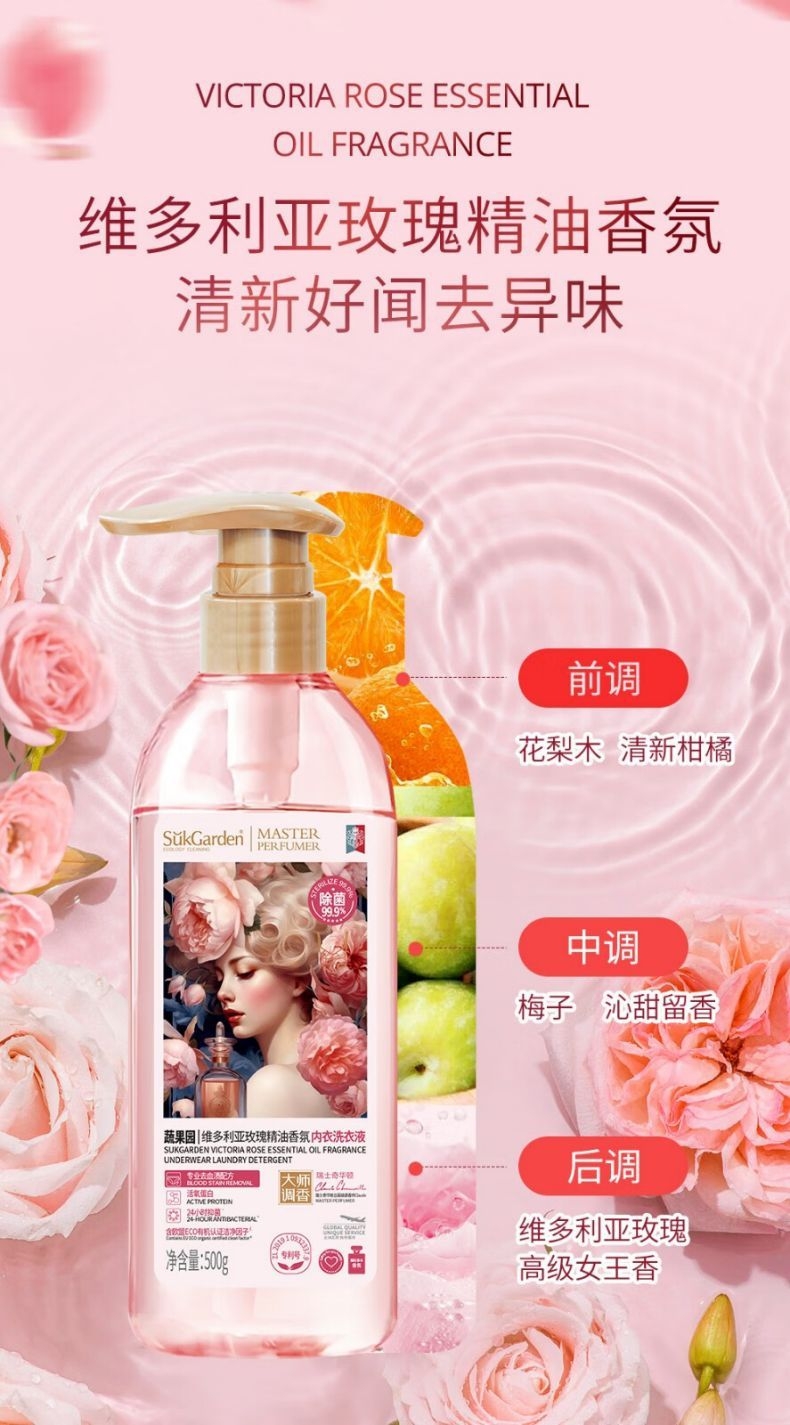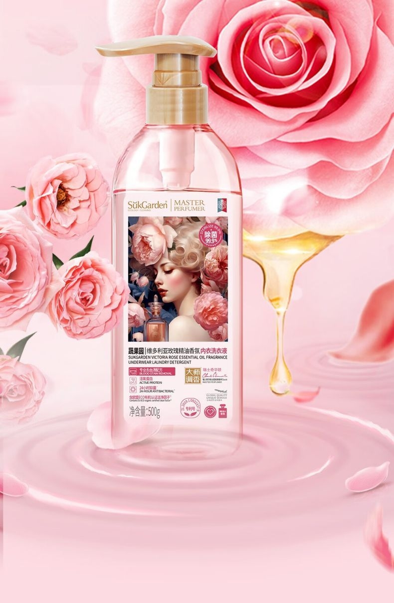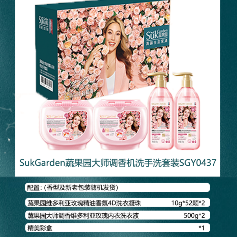 配置清单:SukGarden蔬果园天然玫瑰精油香氛4D洗衣凝珠10g*52颗*2(零售价89元*2) SukGarden蔬果园维多利亚玫瑰精油香氛内衣洗衣液500g*2(零售价39元*2)