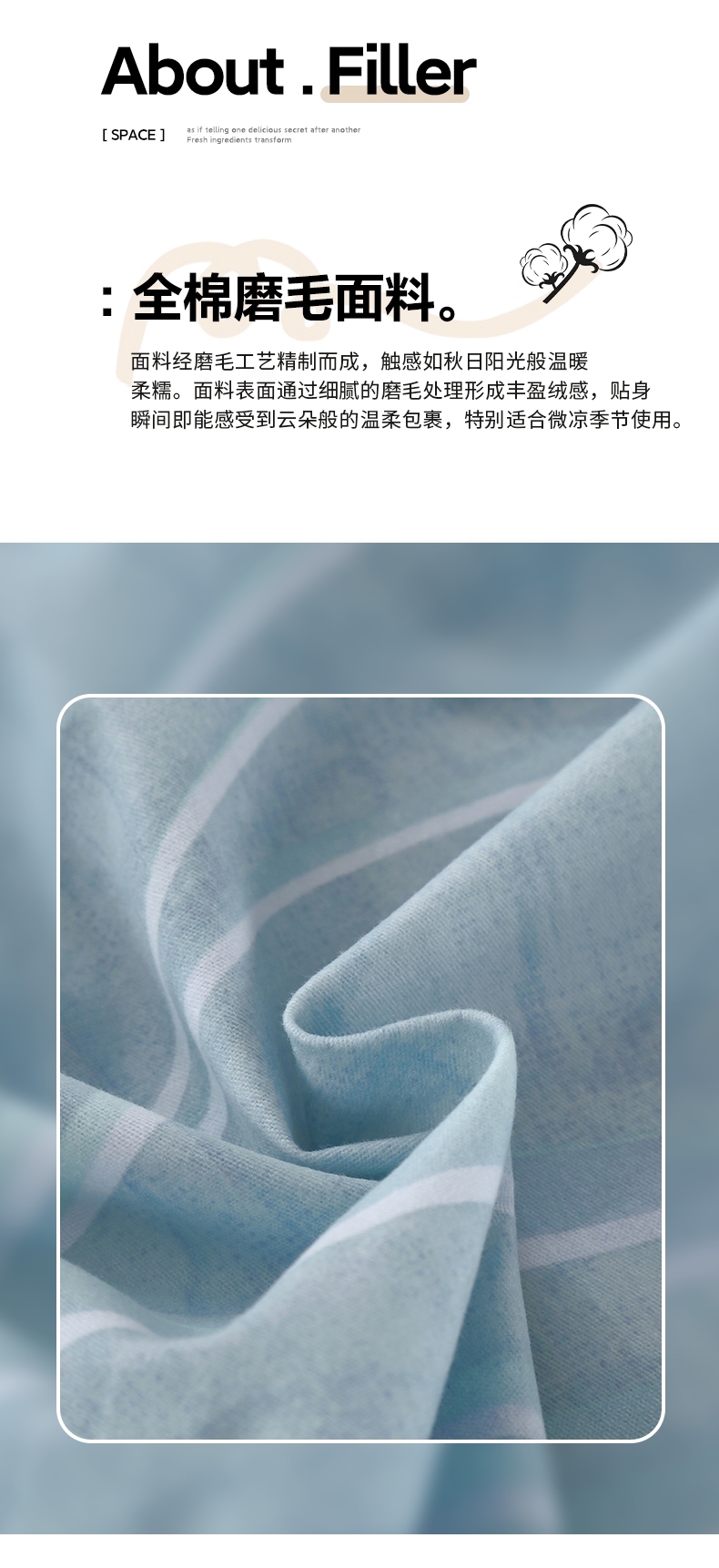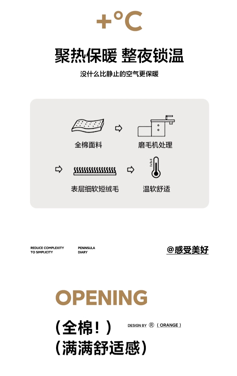 面料经磨毛工艺精制而成,触感如秋日阳光般温暖;面料表面通过细腻的磨毛处理形成丰盈绒感;贴身瞬间即能感受到云朵般的温柔包裹