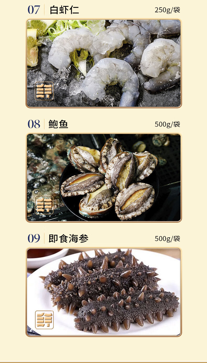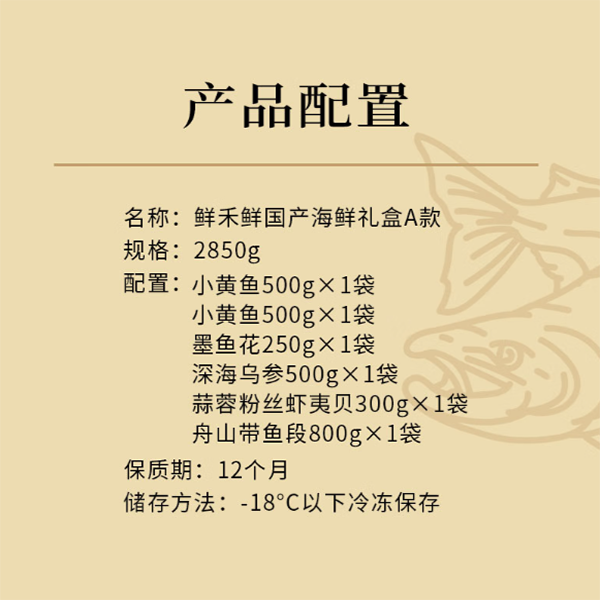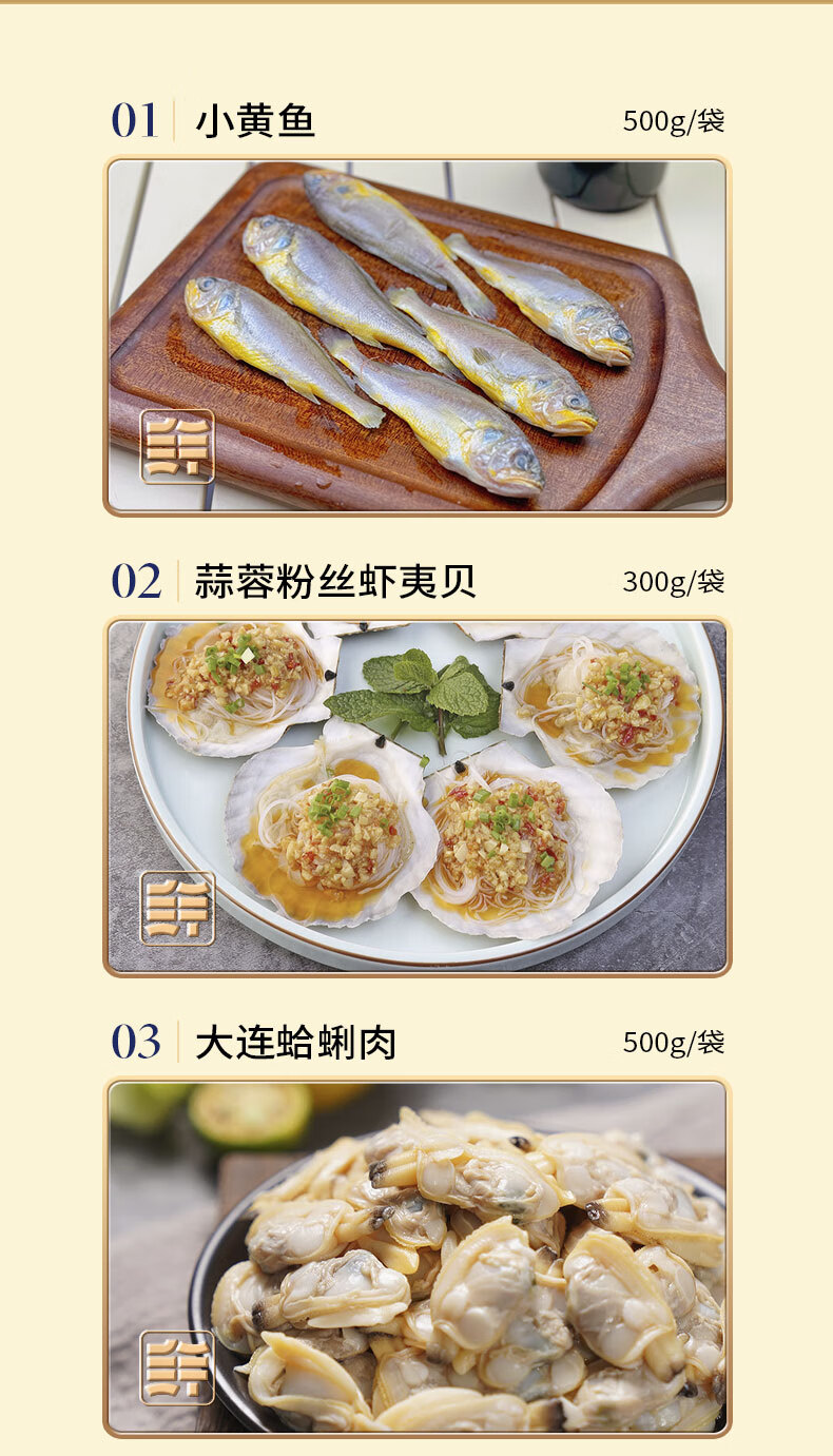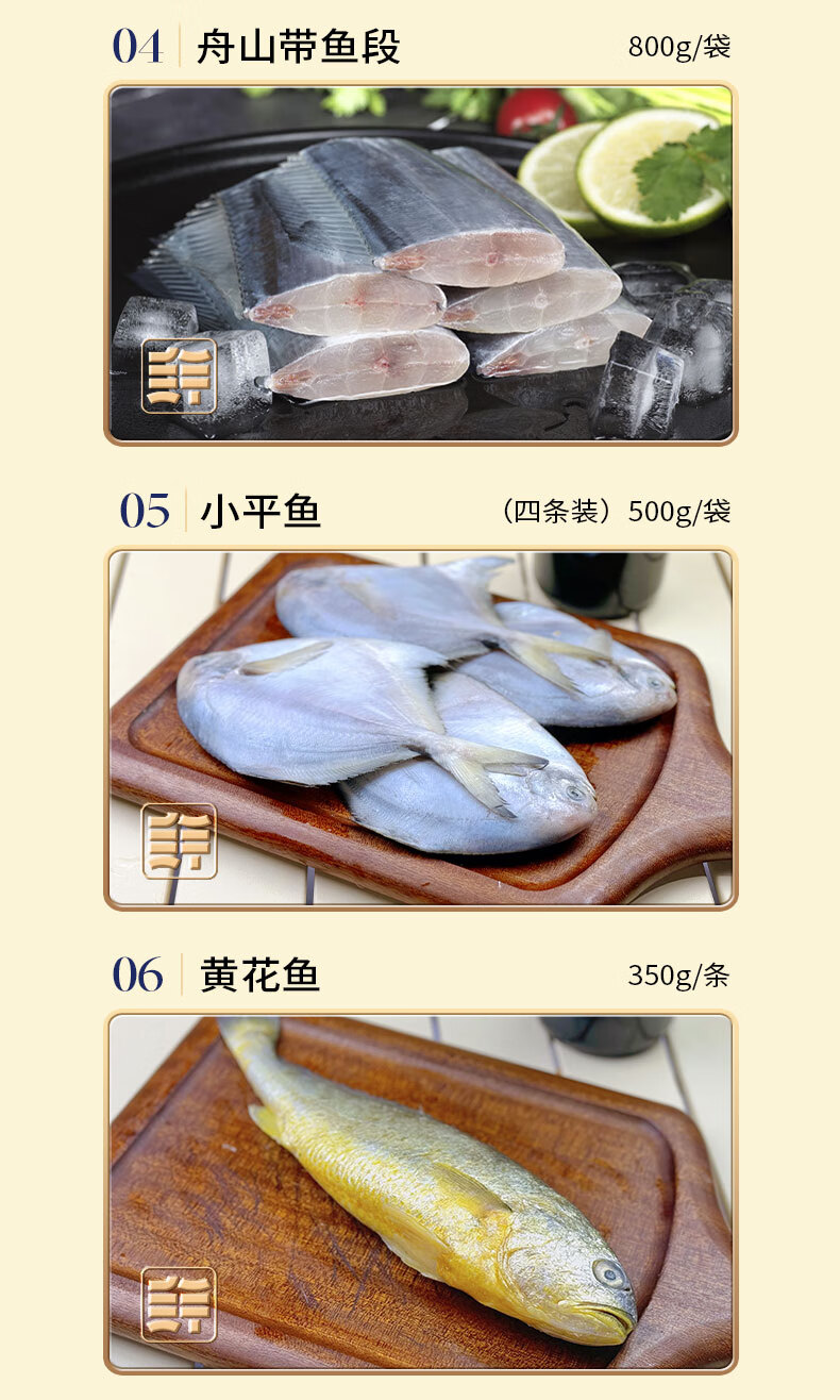 配置:小黄鱼500g*2袋 墨鱼花250g×1袋 深海乌参500g×1袋 蒜蓉粉丝虾夷贝300g×1袋 舟山带鱼段800g×1袋