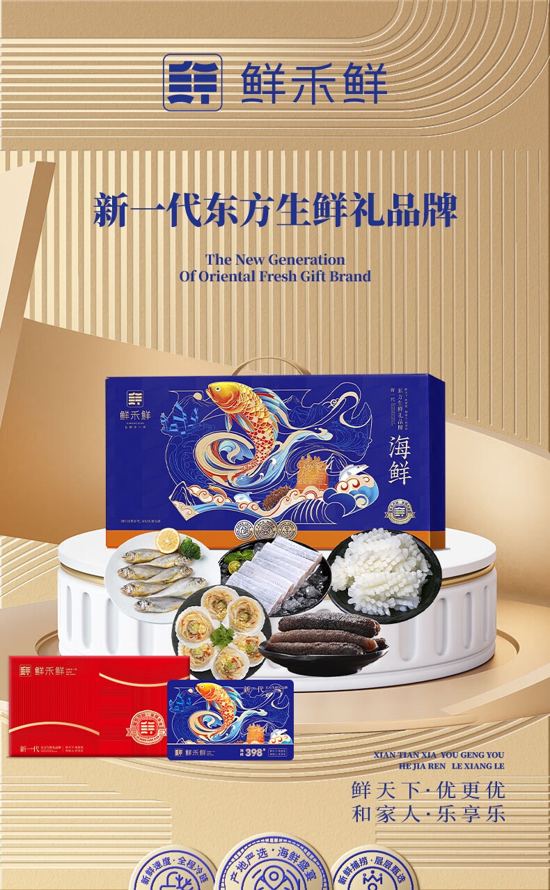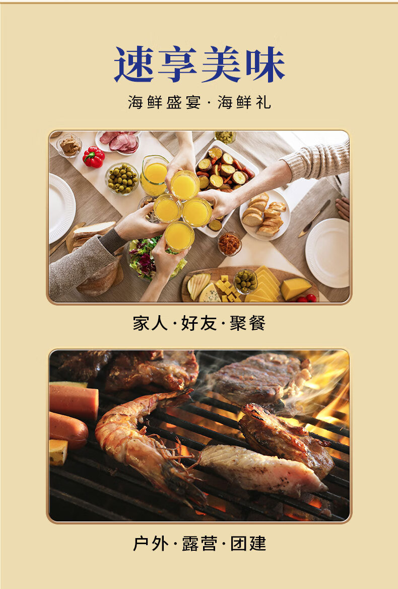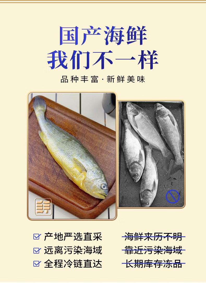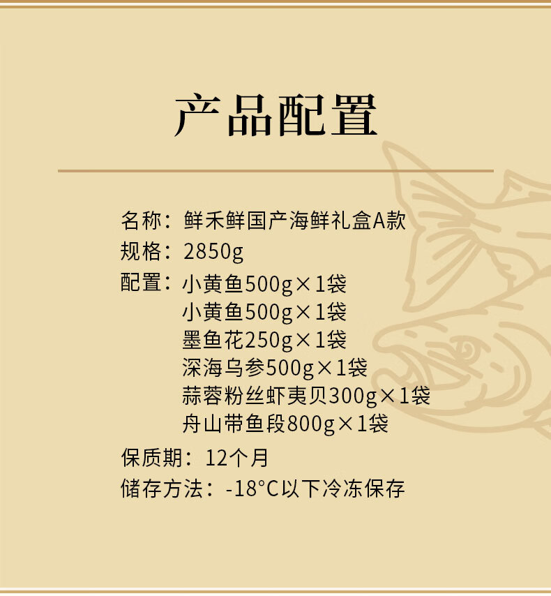 配置:小黄鱼500g*2袋 墨鱼花250g×1袋 深海乌参500g×1袋 蒜蓉粉丝虾夷贝300g×1袋 舟山带鱼段800g×1袋