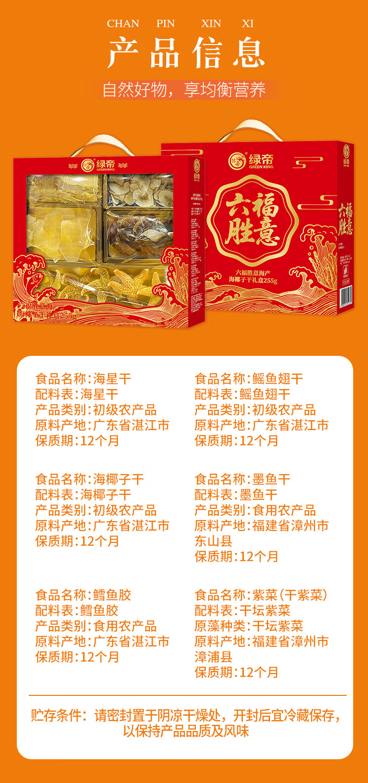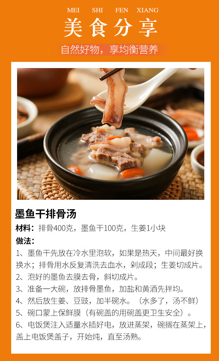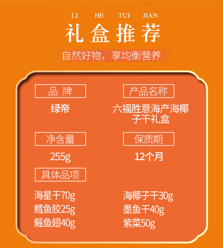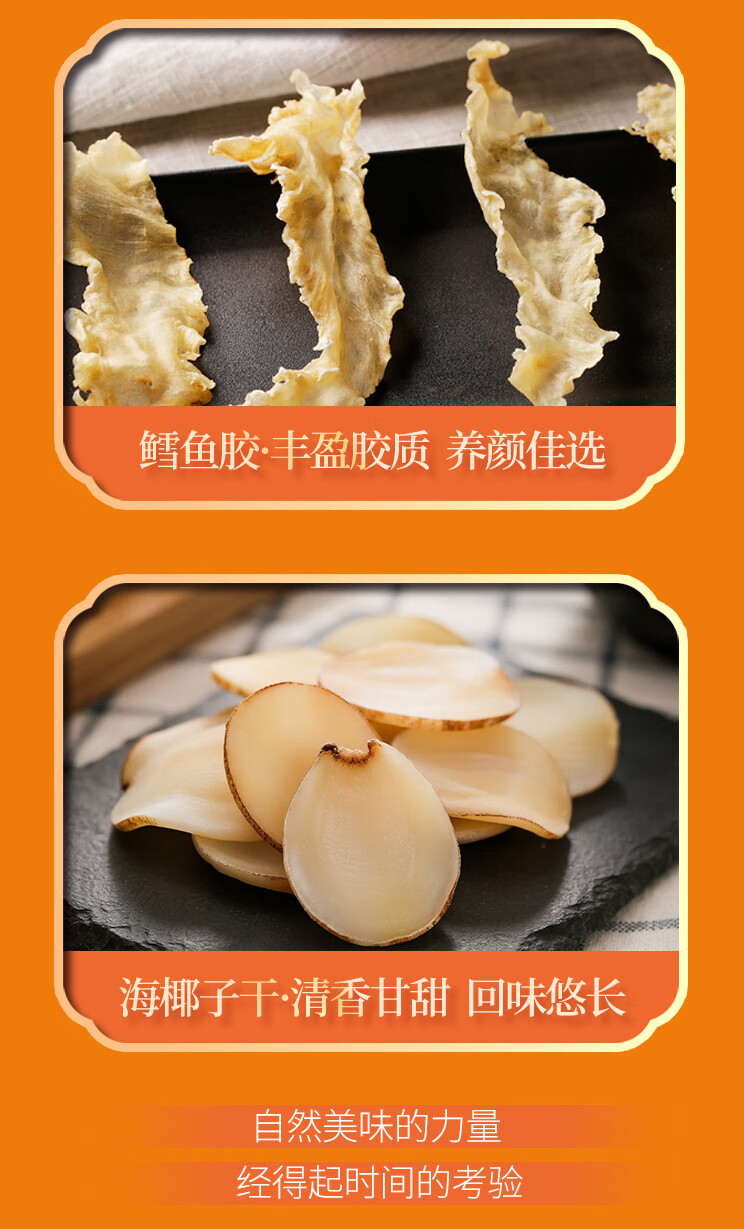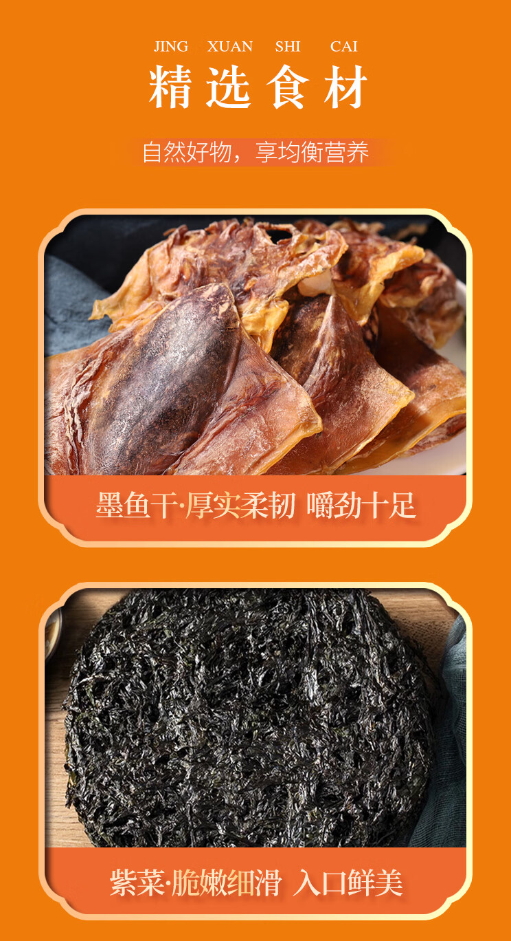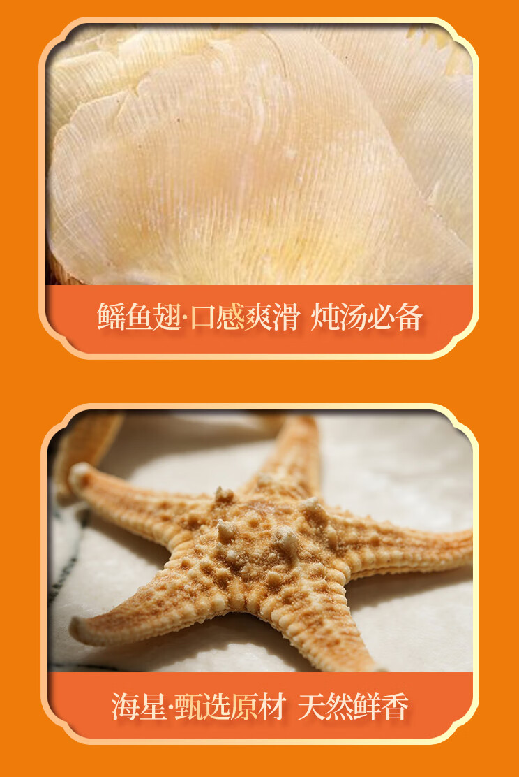 配置:鳕鱼胶25g、鳐鱼翅40g(3片)、墨鱼40g(3头)、海底椰30g、海星70g、紫菜50g