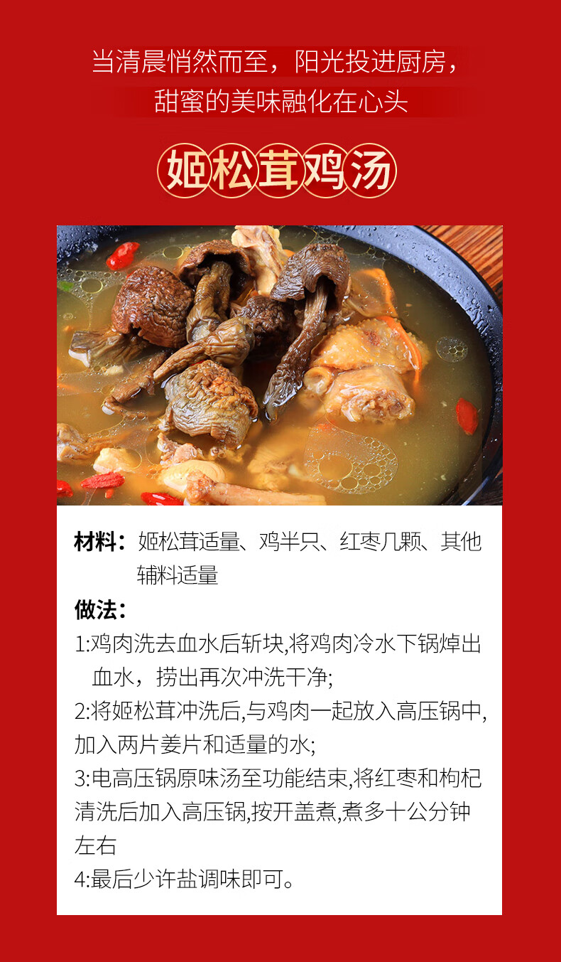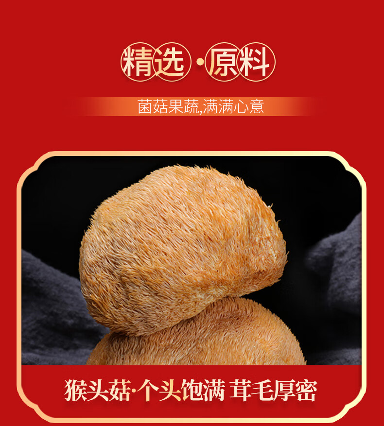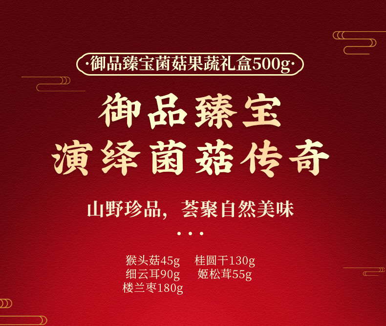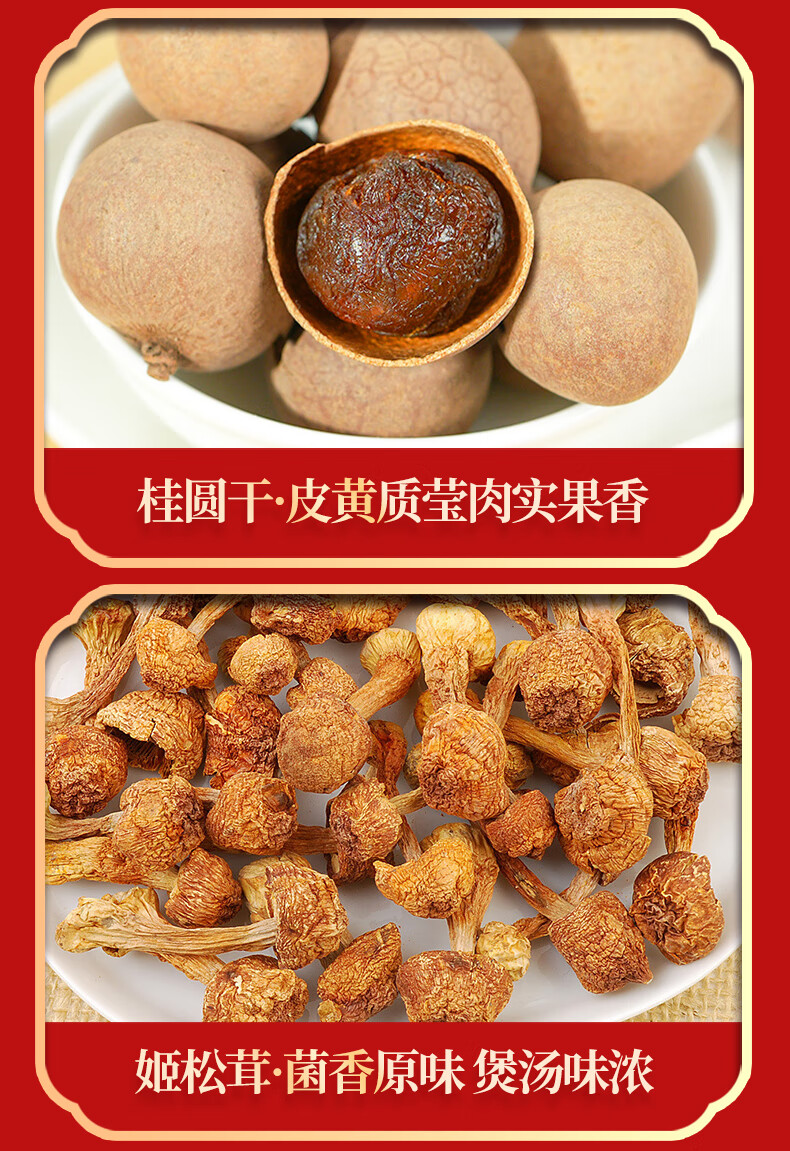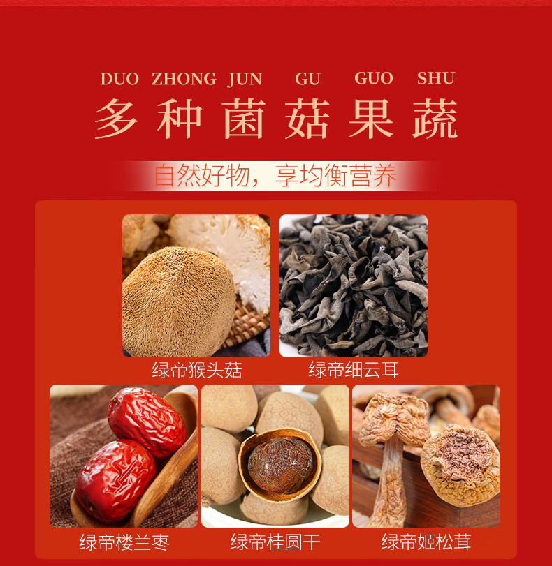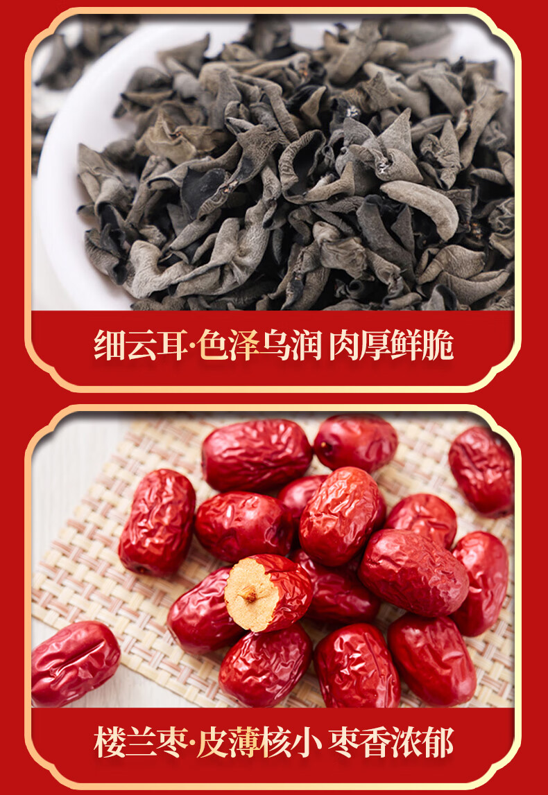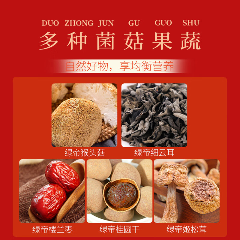 配置:猴头菇45g、细云耳90g、楼兰枣180g、桂圆干130g、姬松茸55g