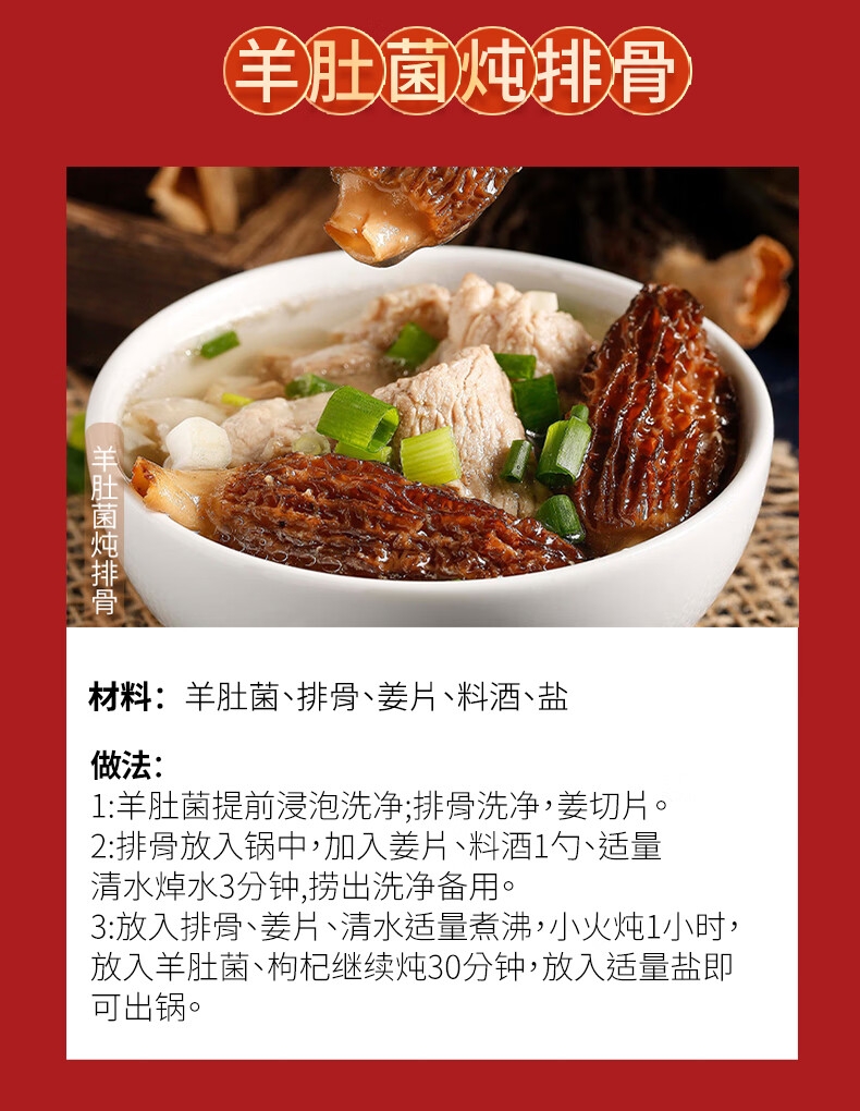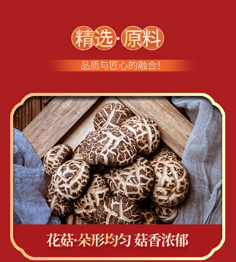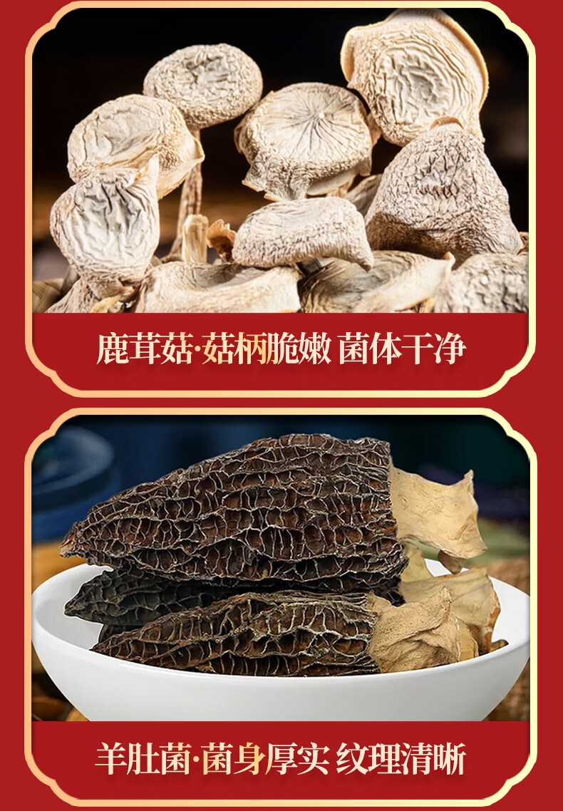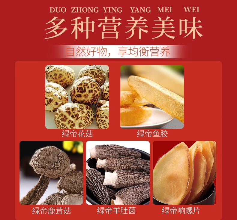 配置:响螺片135g、鱼胶15g、鹿茸菇65g、花菇70g、羊肚菌40g