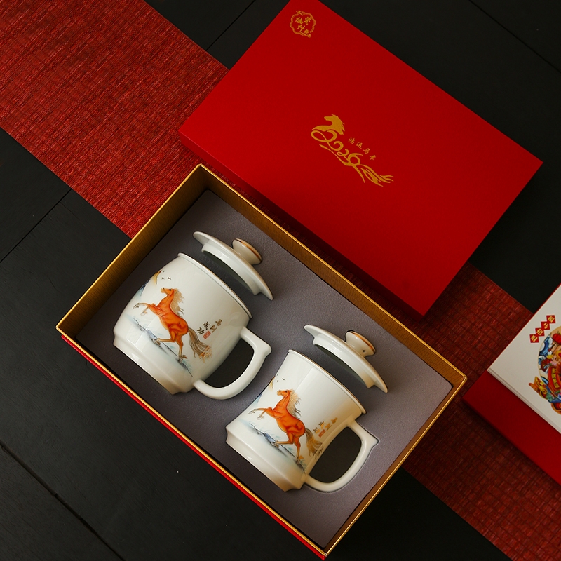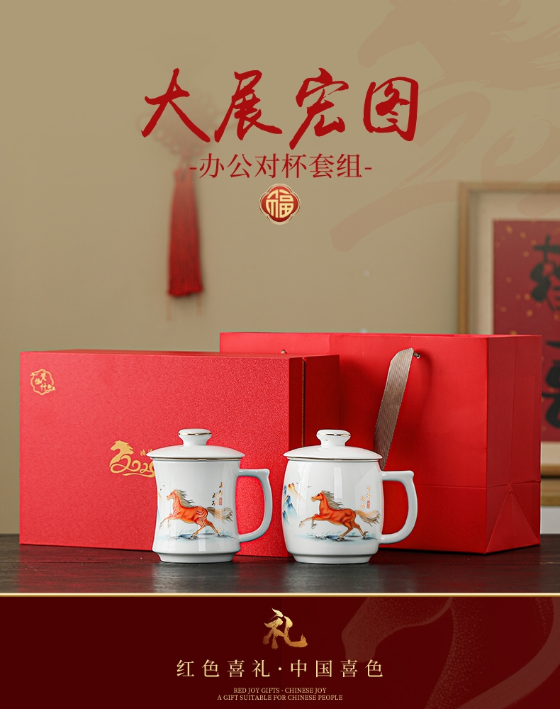羊脂玉瓷,高温烧制,器型经典,美观实用。;吉祥大气马到成功图案,金丝飞扬意气风发,满满祝福。;搭配吉祥喜气、应季产品台历,开门红实用优选组合。;礼盒时尚设计,经典中国红,送礼更自带喜气。