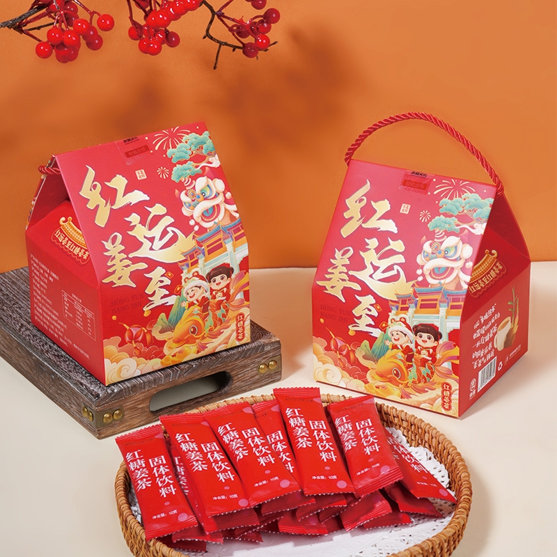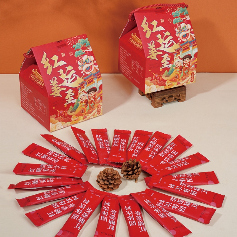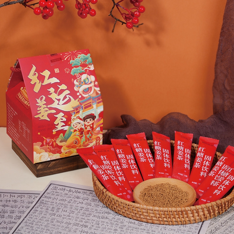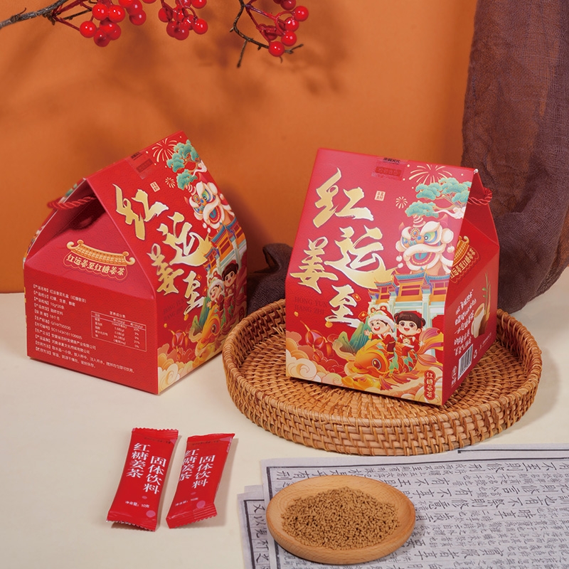 特色三角礼盒,国潮喜庆风格,鸿运将至好寓意;红糖姜茶,暖身更暖心,给客户更多的温暖与陪伴;只需10秒,一冲一拌,一杯暖暖的姜茶即刻呈现