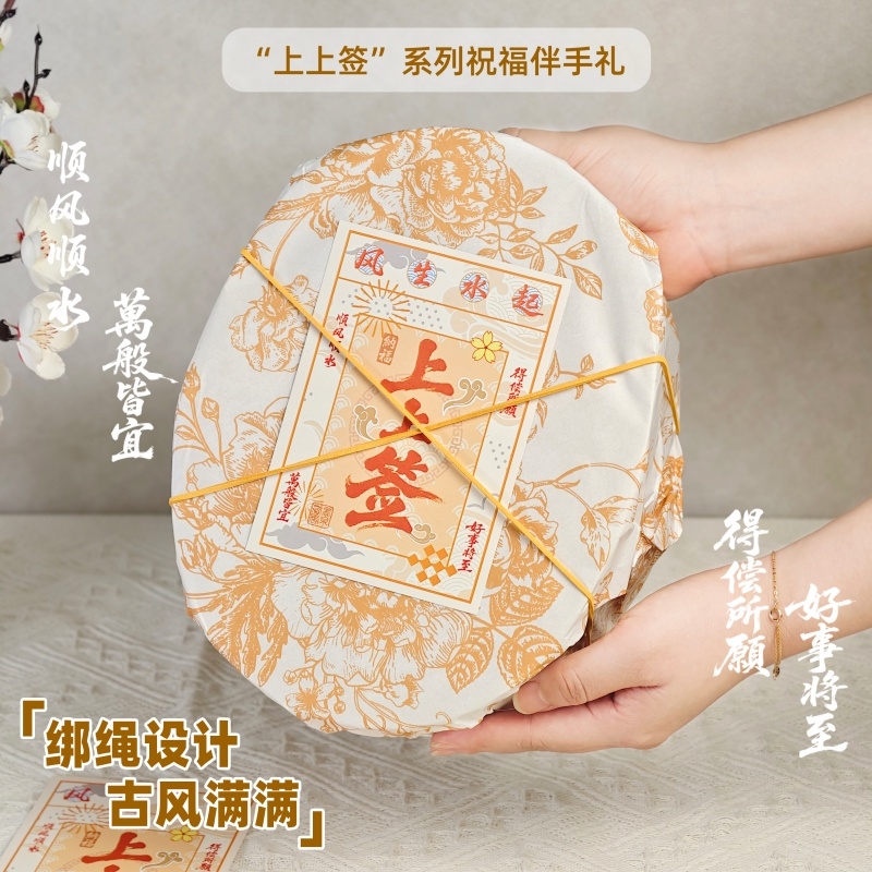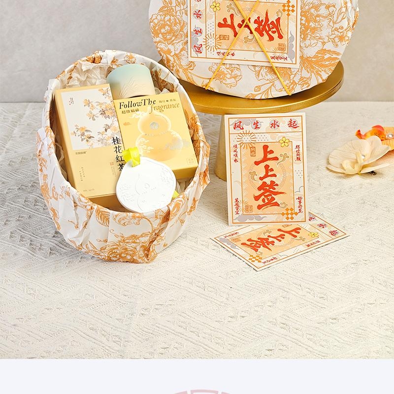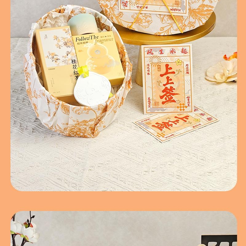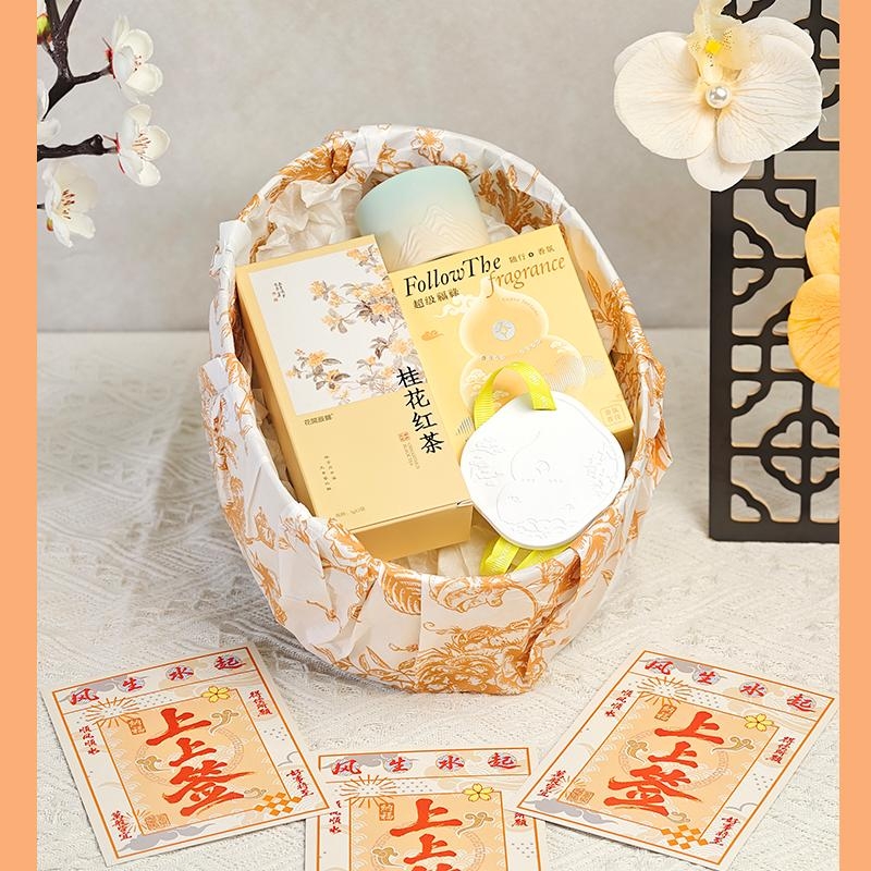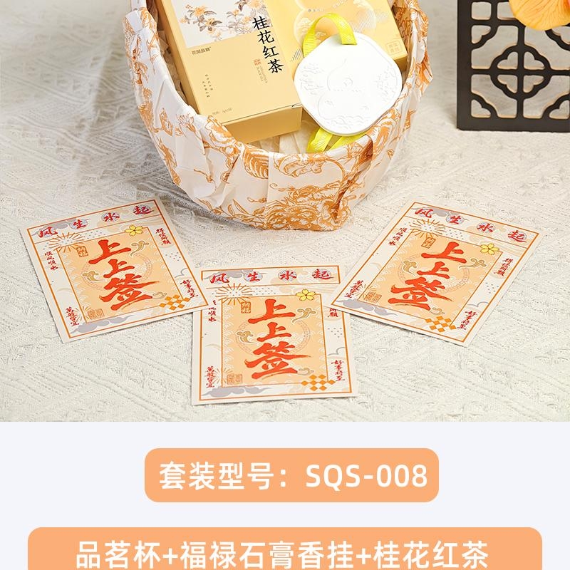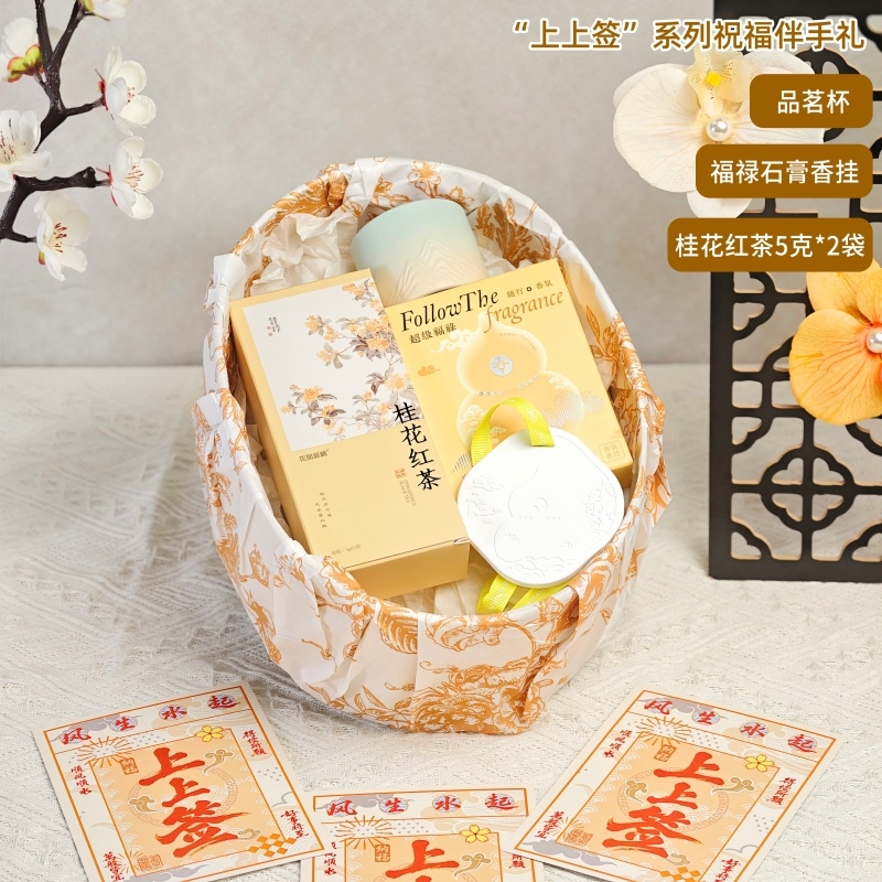 组合:品茗杯、福禄石膏香挂、花开辰锦桂花红茶5g*2袋、古风绑绳礼盒+上上签贺卡