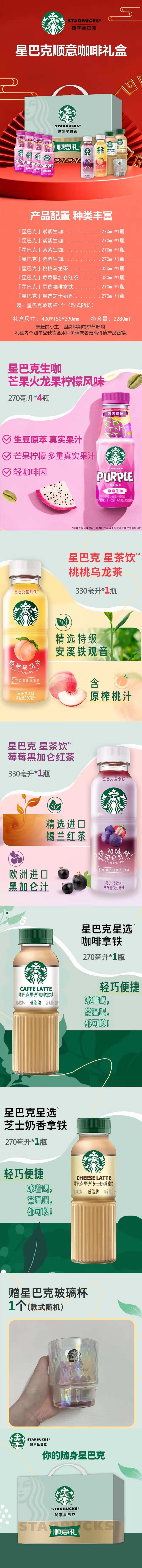 配置:「星巴克」紫紫生咖270ml 「星巴克」紫紫生咖270ml 「星巴克」紫紫生咖270ml 「星巴克」紫紫生咖270ml 「星巴克」桃桃乌龙茶330ml 「星巴克」莓莓黑加仑红茶330ml 「星巴克」星选咖啡拿铁270ml 「星巴克」星选芝士奶香270ml 赠:星巴克玻璃杯1个(款式随机)