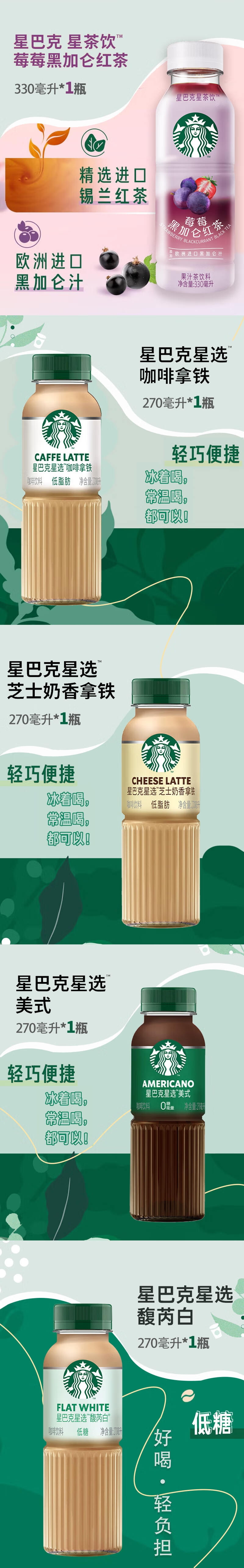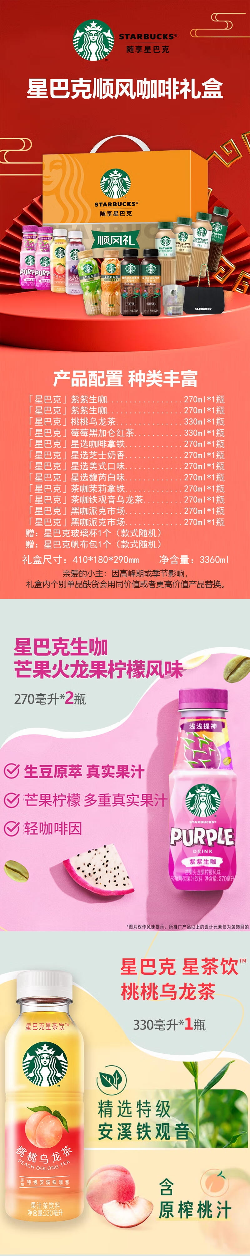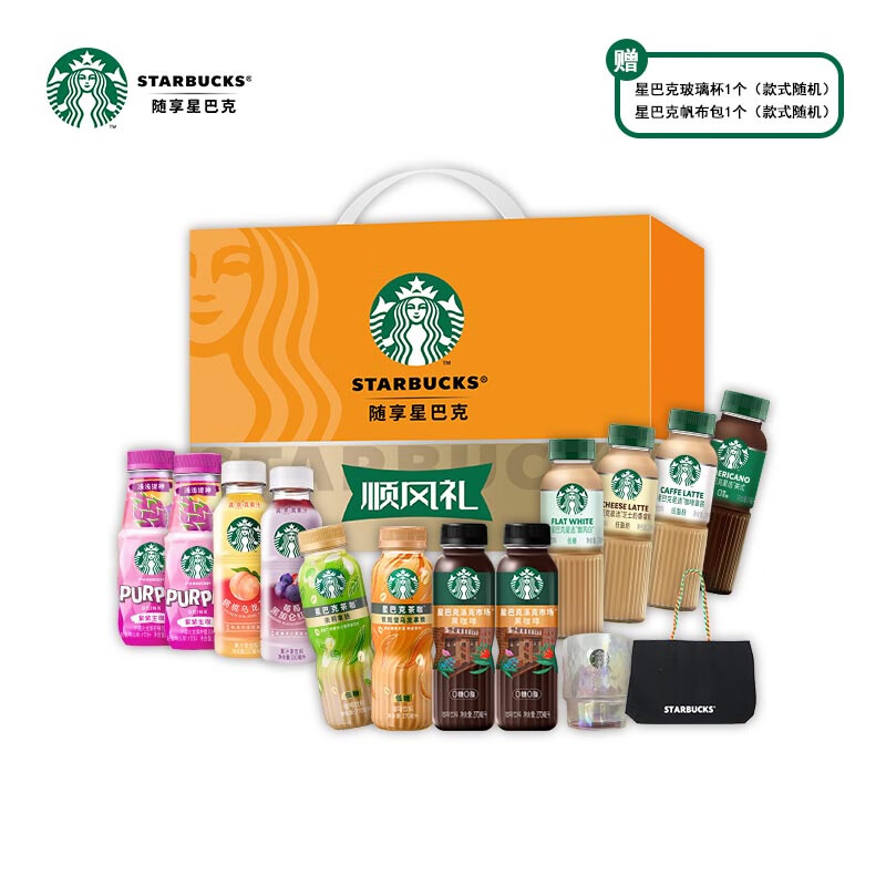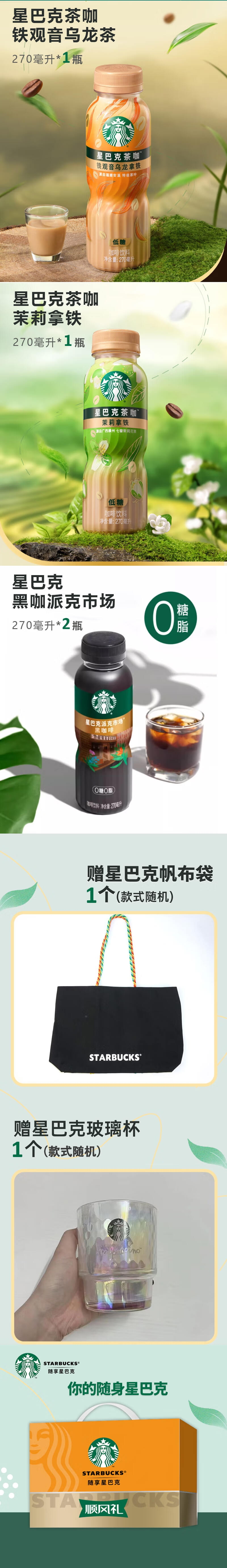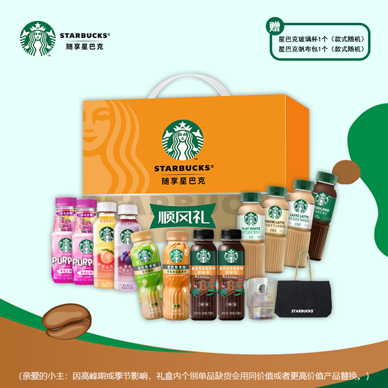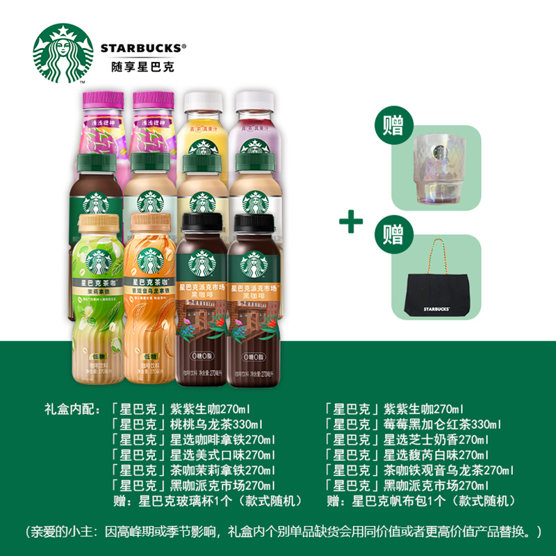 配置:「星巴克」紫紫生咖270ml 「星巴克」紫紫生咖270ml 「星巴克」桃桃乌龙茶330ml 「星巴克」莓莓黑加仑红茶330ml 「星巴克」星选咖啡拿铁270ml 「星巴克」星选芝士奶香270ml 「星巴克」星选美式口味270ml 「星巴克」星选馥芮白味270ml 「星巴克」茶咖茉莉拿铁270ml 「星巴克」茶咖铁观音乌龙茶270ml 「星巴克」黑咖派克市场270ml 「星巴克」黑咖派克市场270ml 赠:星巴克玻璃杯1个(款式随机) 赠:星巴克帆布包1个(款式随机)
