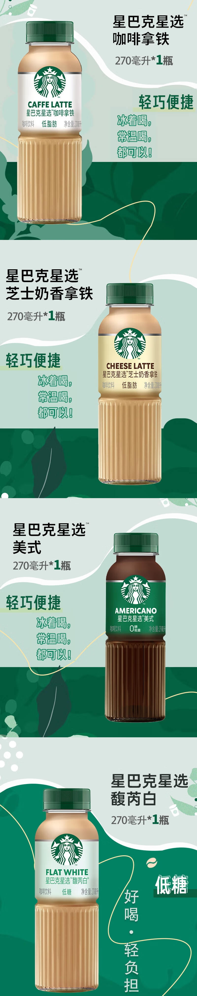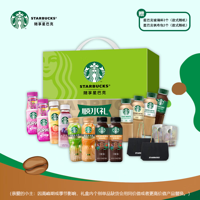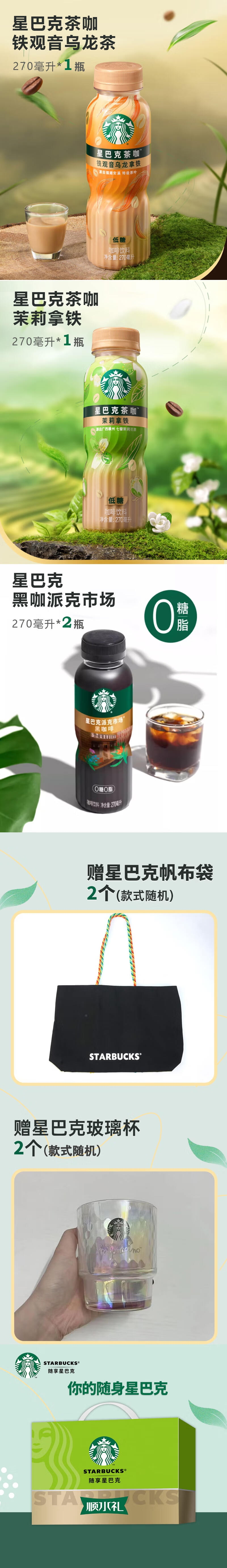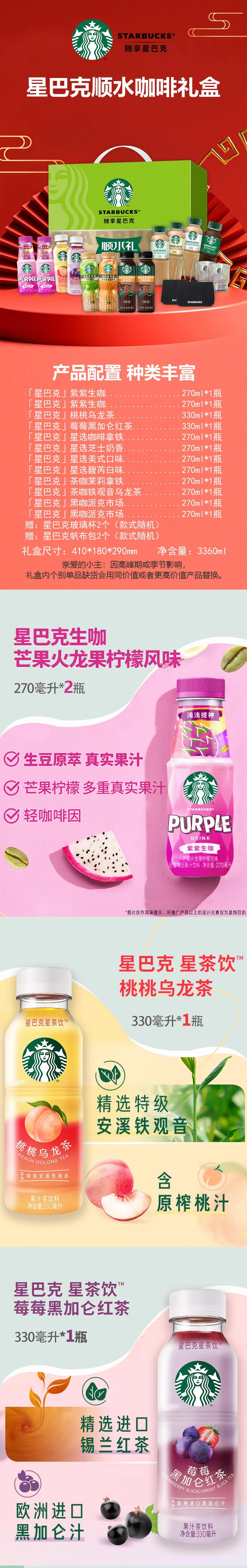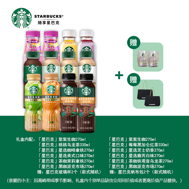配置:「星巴克」紫紫生咖270ml 「星巴克」紫紫生咖270ml 「星巴克」桃桃乌龙茶330ml 「星巴克」莓莓黑加仑红茶330ml 「星巴克」星选咖啡拿铁270ml 「星巴克」星选芝士奶香270ml 「星巴克」星选美式口味270ml 「星巴克」星选馥芮白味270ml 「星巴克」茶咖茉莉拿铁270ml 「星巴克」茶咖铁观音乌龙茶270ml 「星巴克」黑咖派克市场270ml 「星巴克」黑咖派克市场270ml 赠:星巴克玻璃杯2个(款式随机) 赠:星巴克帆布包2个(款式随机)