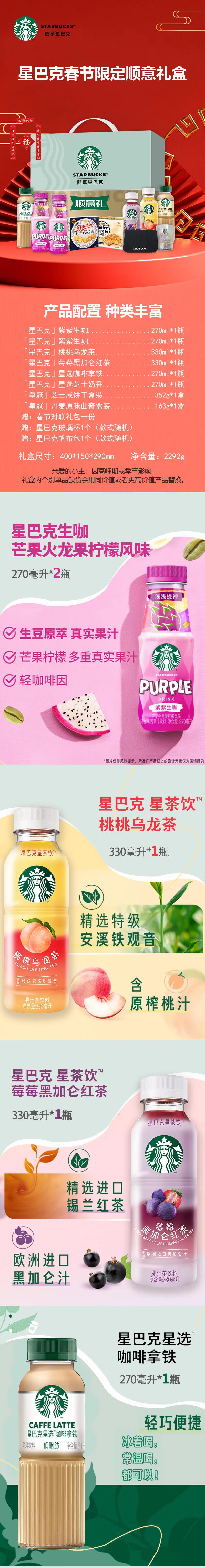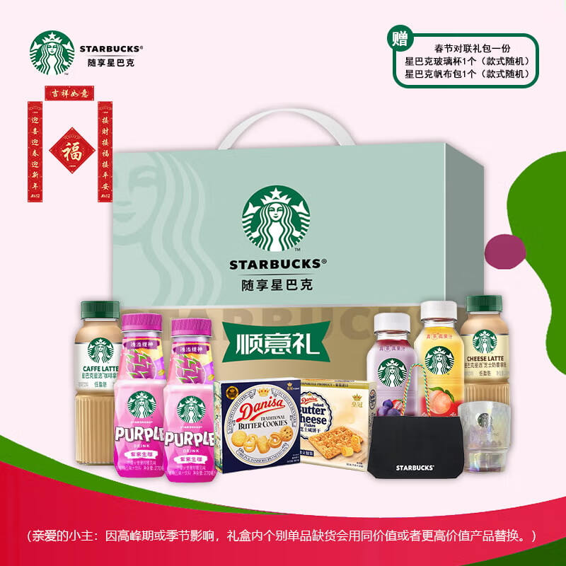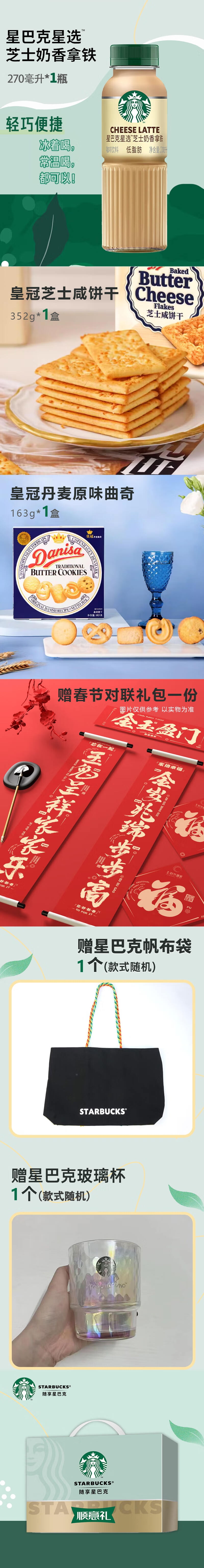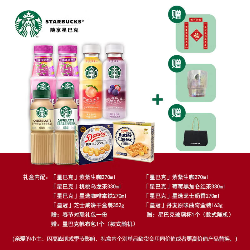 配置:「星巴克」紫紫生咖270ml 「星巴克」紫紫生咖270ml 「星巴克」桃桃乌龙茶330ml 「星巴克」莓莓黑加仑红茶330ml 「星巴克」星选咖啡拿铁270ml 「星巴克」星选芝士奶香270ml 「皇冠」芝士咸饼干盒装352g 「皇冠」丹麦原味曲奇盒装163g 赠:春节对联礼包一份 赠:星巴克玻璃杯1个(款式随机) 赠:星巴克帆布包1个(款式随机)