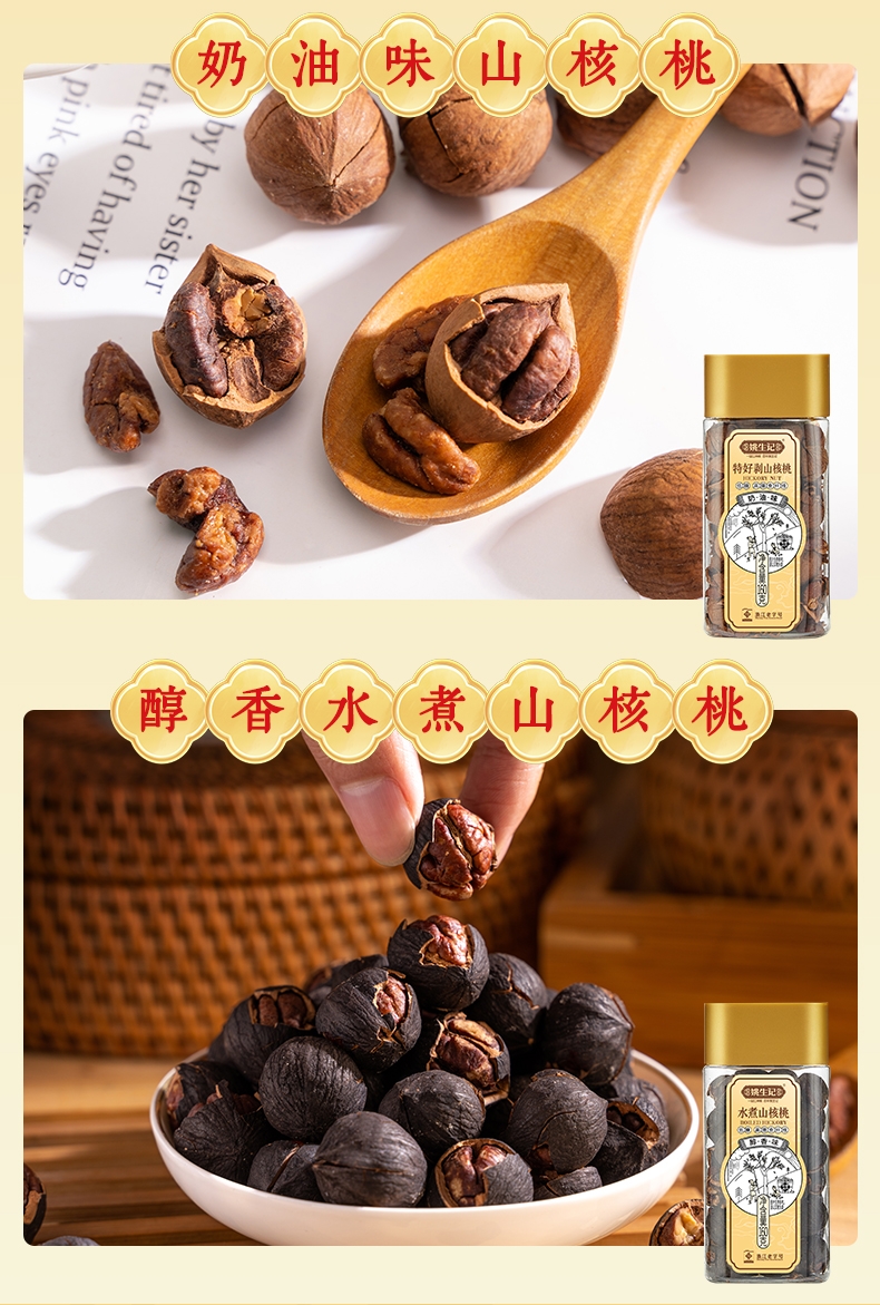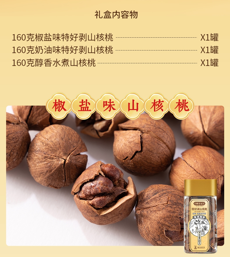配置清单:160克临安核心产区椒盐味特好剥山核桃/方形罐*2 160克临安核心产区奶油味特好剥山核桃/方形罐*2 160克临安核心产区水煮山核桃/方形罐*2