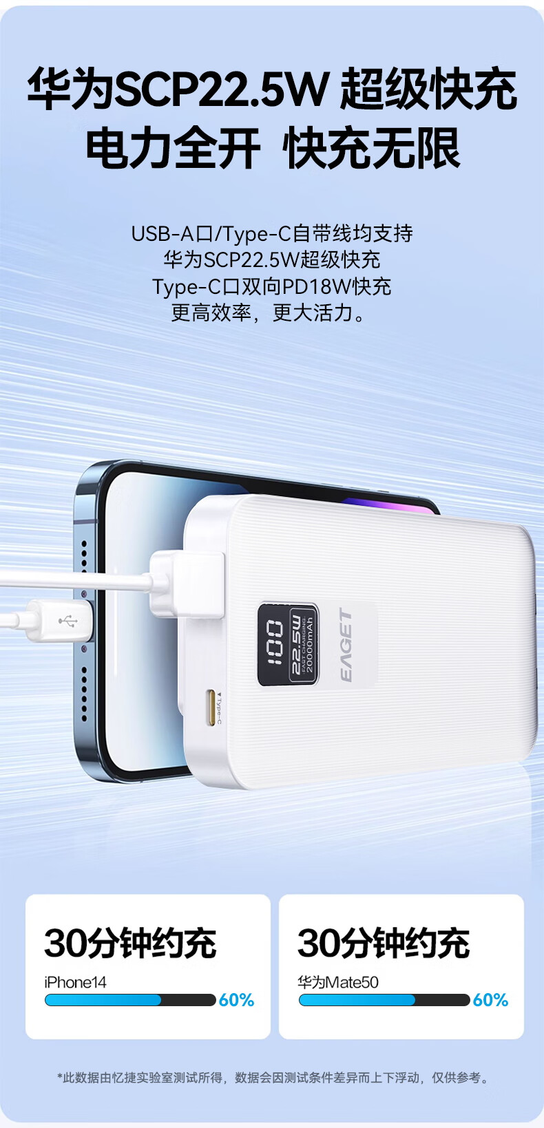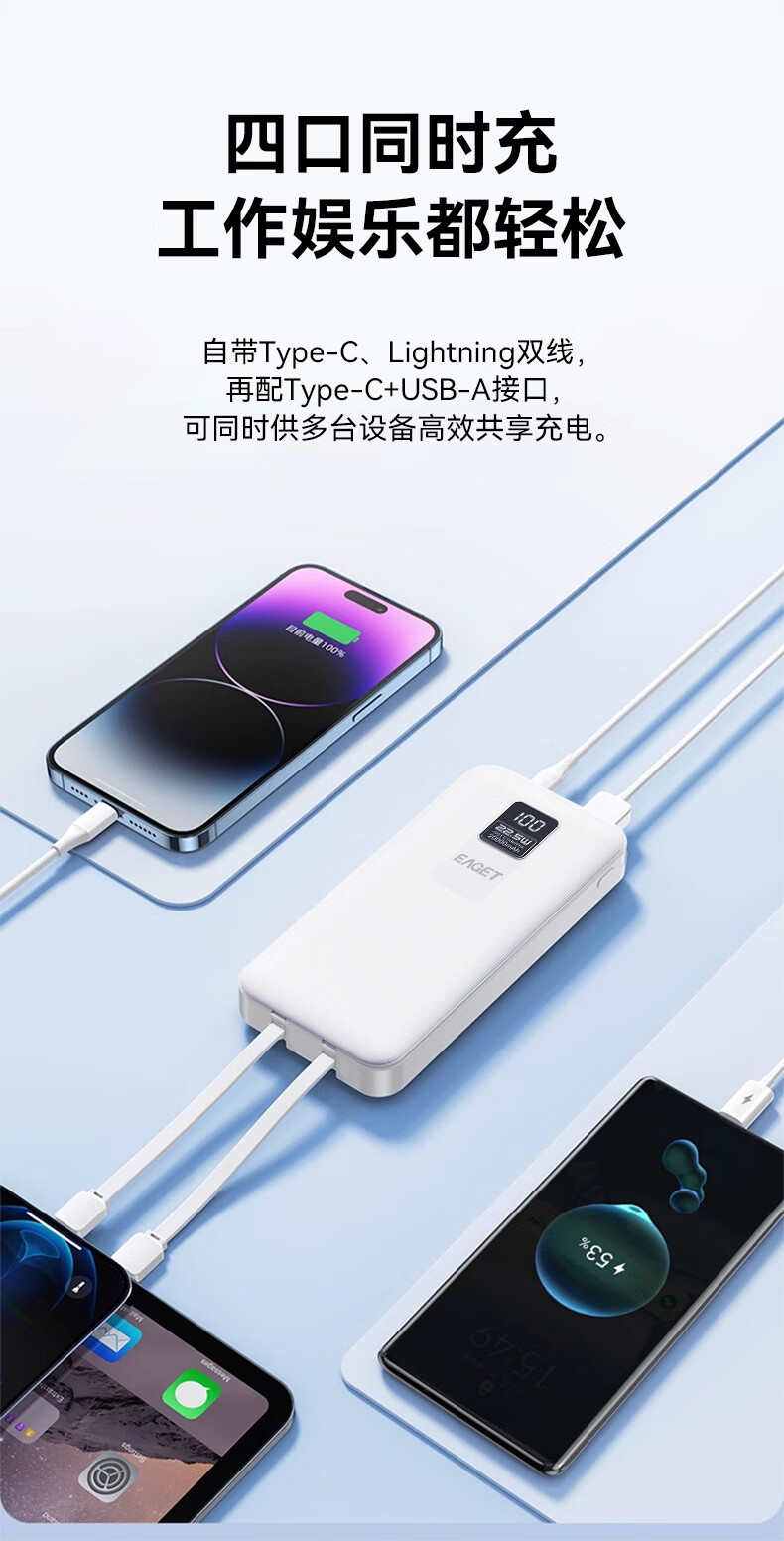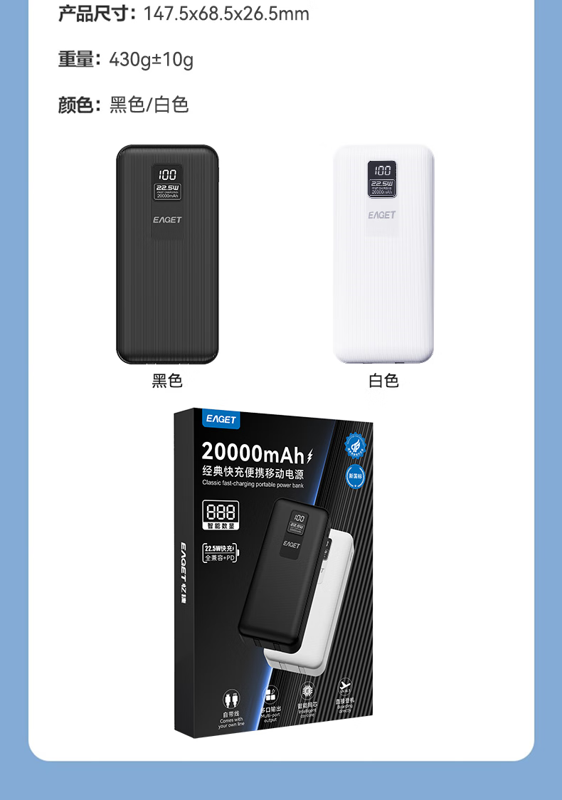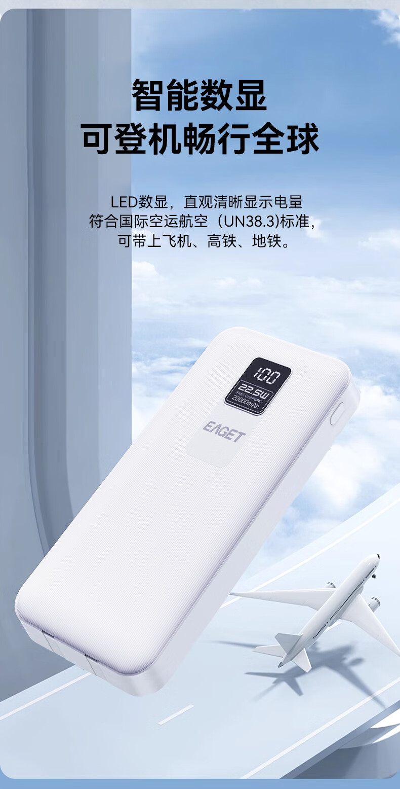智能数显 可登机畅行全球;自带双线,便捷充电;20000mAh大容量出行刚刚好
