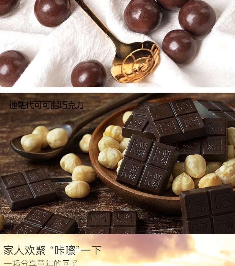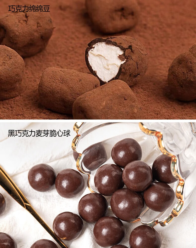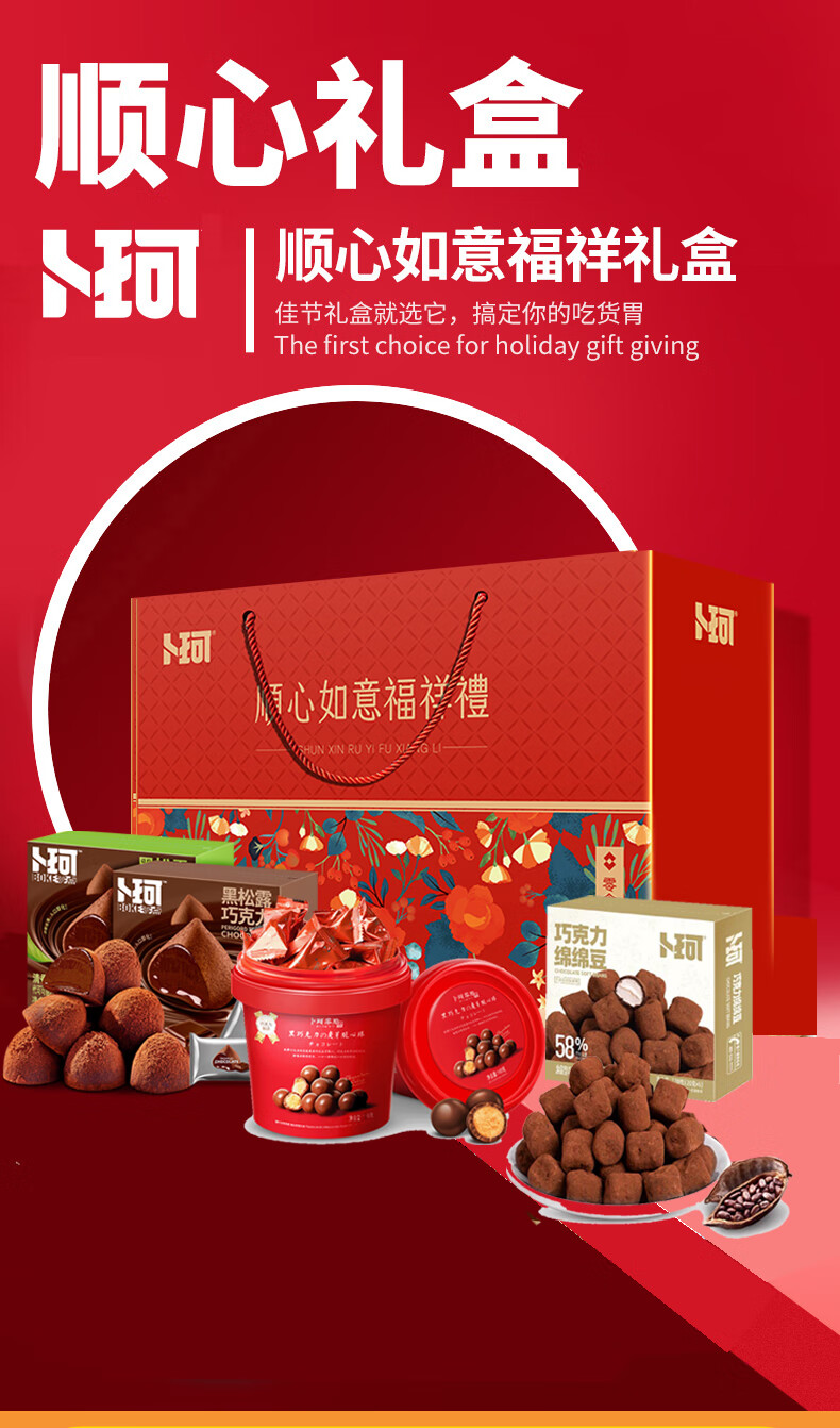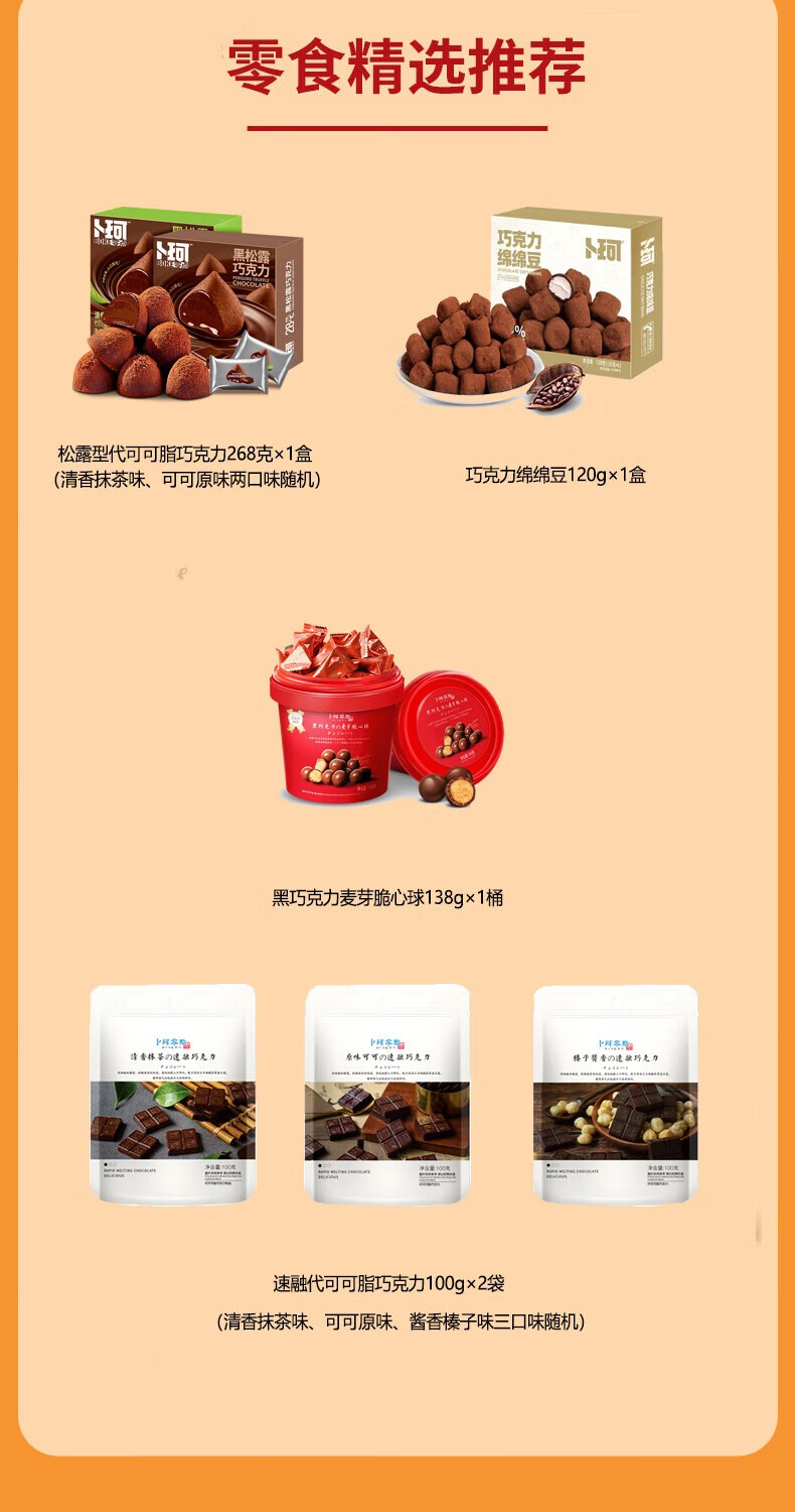 配置:1、松露型代可可脂巧克力268克×1盒(清香抹茶味、可可原味两口味随机) 2、卜珂巧克力绵绵豆120g×1盒 3、卜珂黑巧克力麦芽脆心球138g×1桶 4、卜珂零點速融代可可脂巧克力100g×2袋(清香抹茶味、可可原味、酱香榛子味三口味随机)