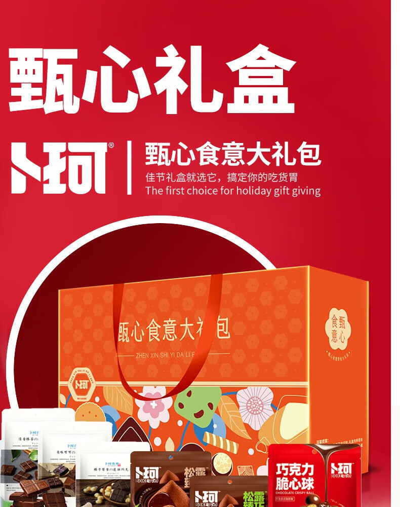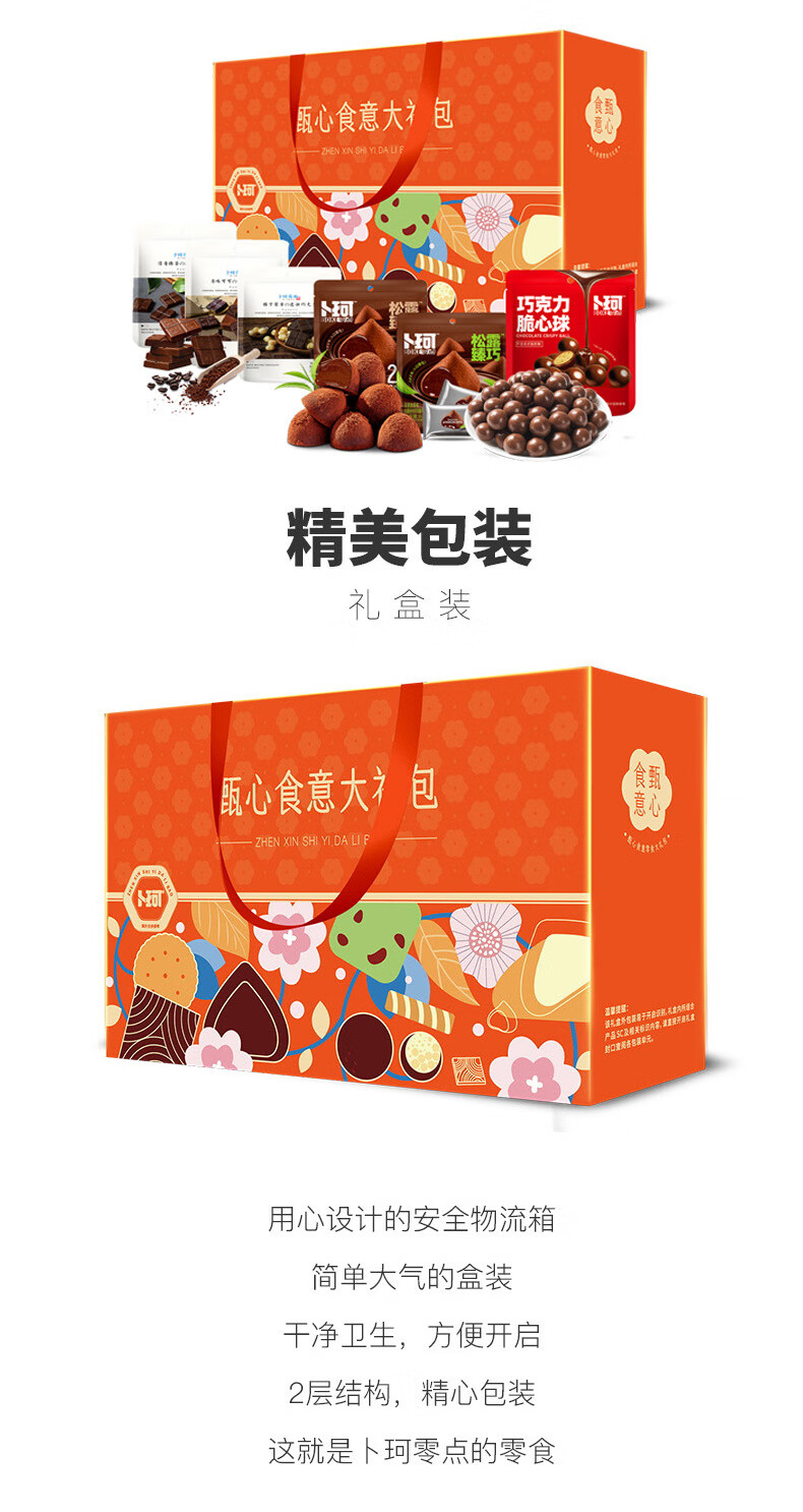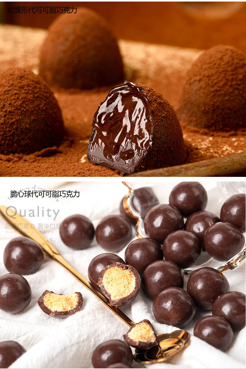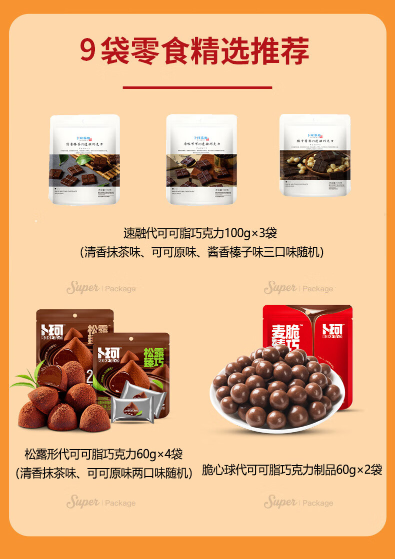 配置:1、卜珂零點速融代可可脂巧克力100g×3袋(清香抹茶味、可可原味、酱香榛子味三口味随机) 2、卜珂零点松露形代可可脂巧克力60g×4袋(清香抹茶味、可可原味两口味随机) 3、卜珂零点脆心球代可可脂巧克力制品60g×2袋