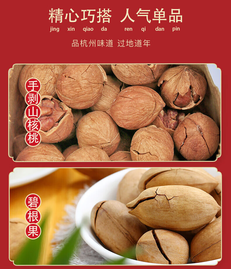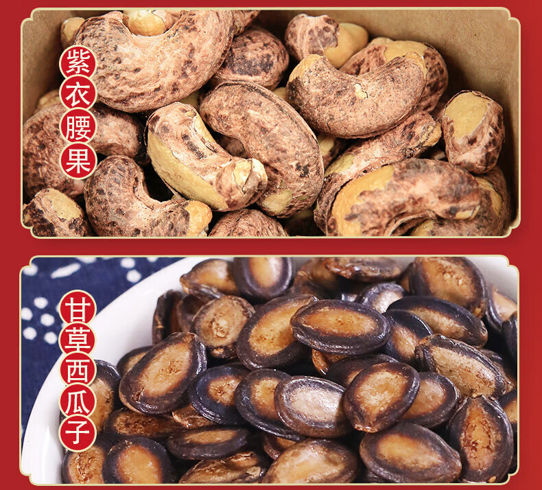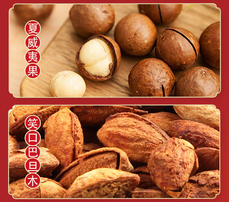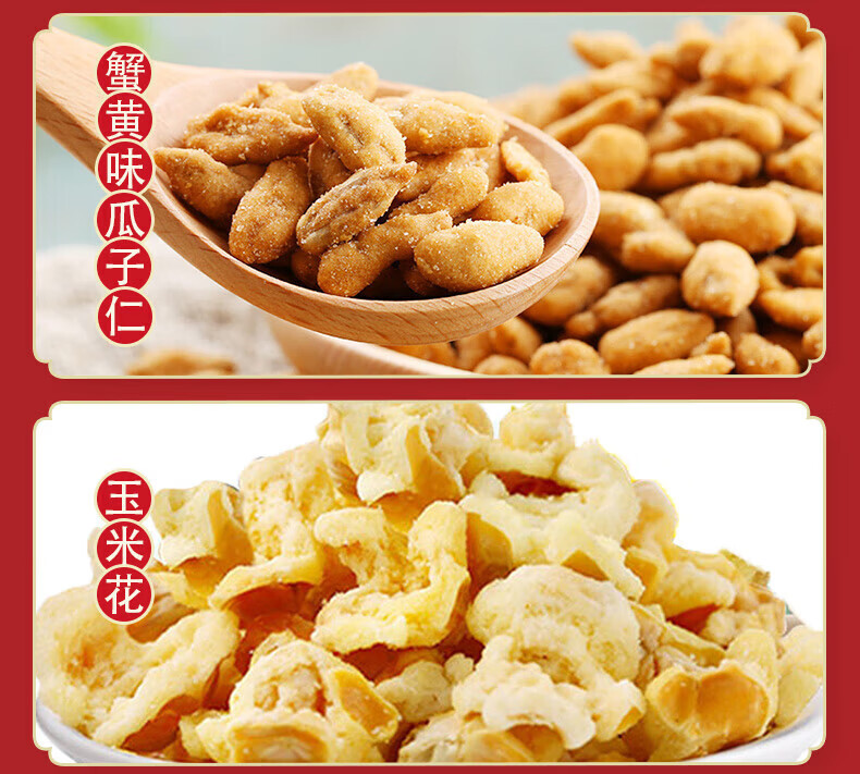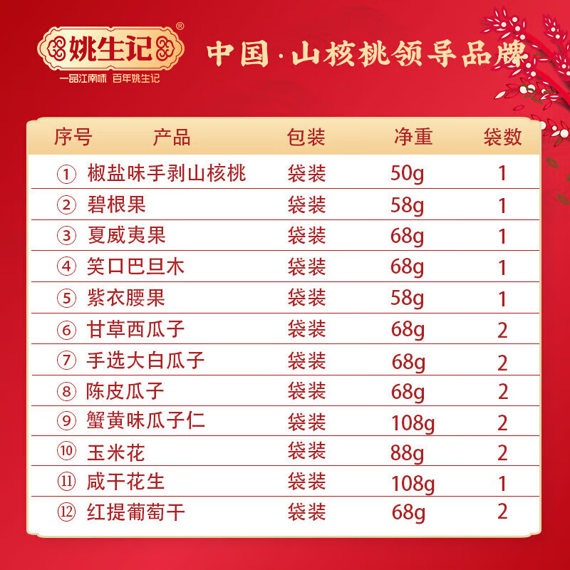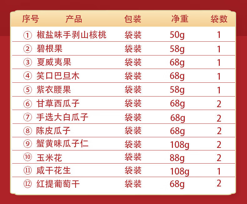 配置清单:50克临安椒盐味手剥山核桃*1 58克南非碧根果*1 68克澳洲夏威夷果*1 68克加州NP笑口巴旦木*1 58克越南紫衣腰果*1 68克新疆甘草西瓜子*2 68克内蒙古手选大白瓜子*2 68克内蒙古陈皮瓜子*2 108克内蒙古蟹黄味瓜子仁*2 88克新疆玉米花*2 108克河南咸干花生*1 108克新疆红提葡萄干*2