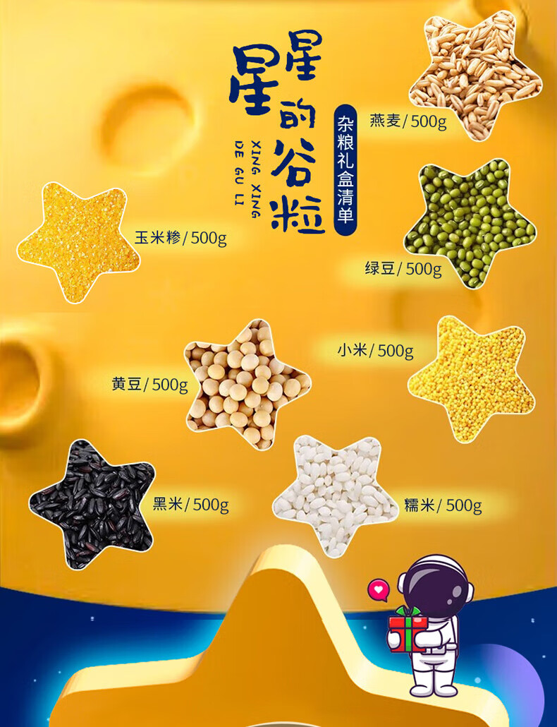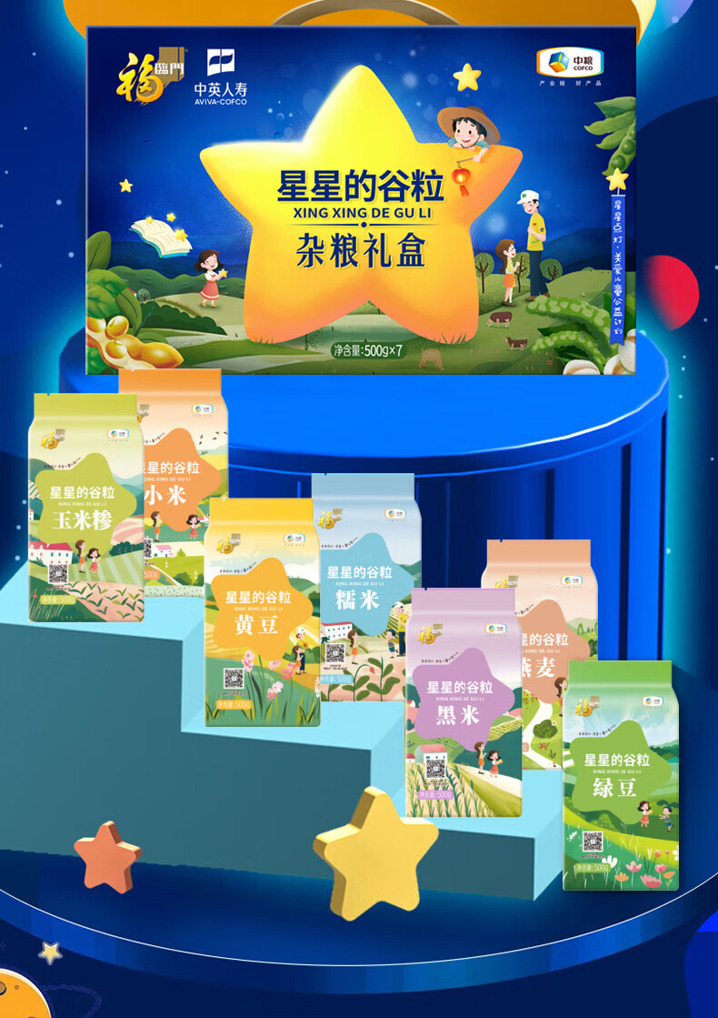 配置:中粮福临门星星的谷粒玉米糁500g 中粮福临门星星的谷粒糯米500g 中粮福临门星星的谷粒黑米500g 中粮福临门星星的谷粒黄豆500g 中粮福临门星星的谷粒小米500g 中粮福临门星星的谷粒燕麦米500g 中粮福临门星星的谷粒绿豆500g