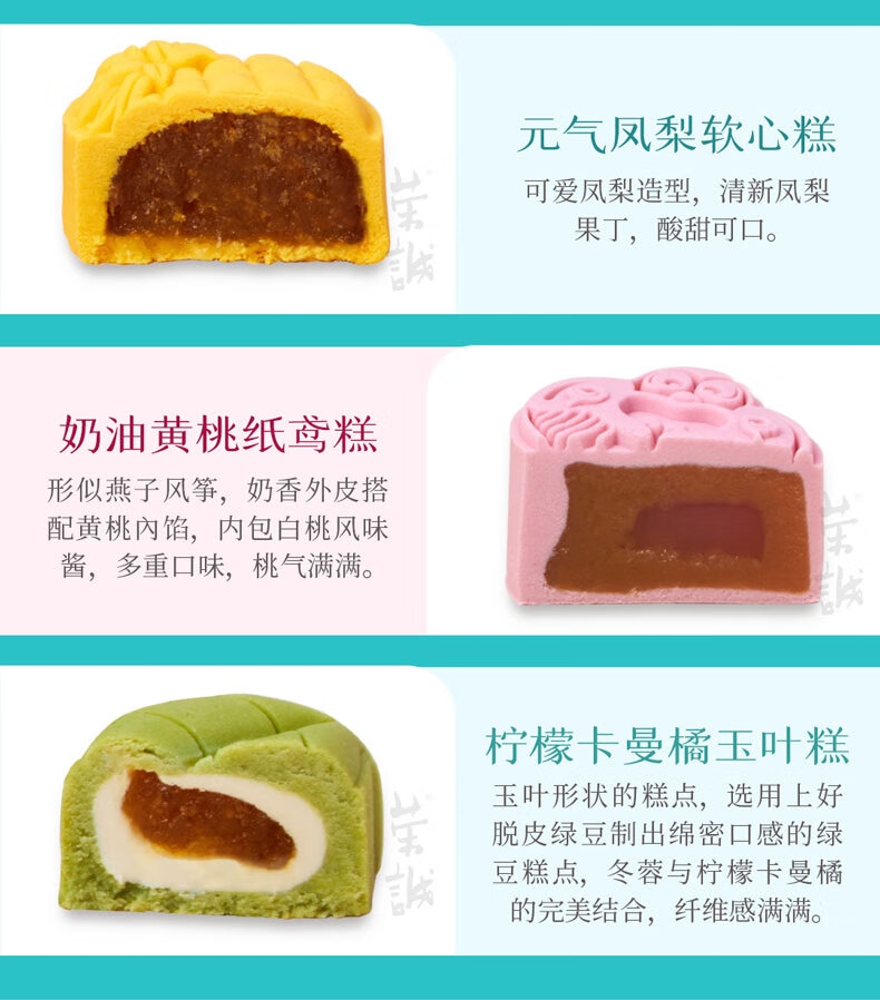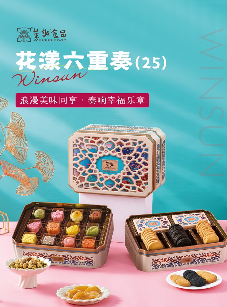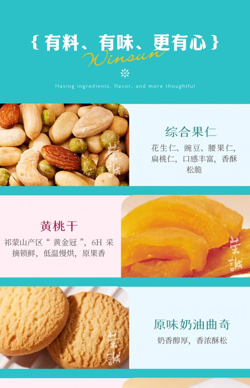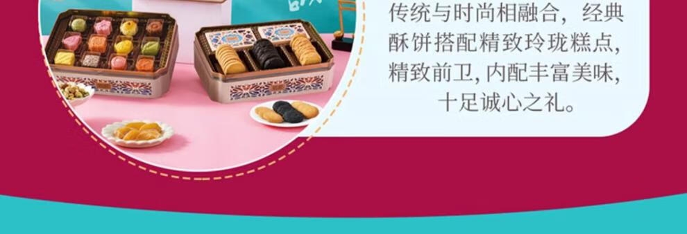 - 配置:100g综合果仁x1 70g黄桃干x1 8g原味奶油曲奇x8 10g椰蓉奶酥x8 10g香焙黑芝麻酥x8 25g柠檬卡曼橘玉叶糕x1 25g元气凤梨软心糕x1 25g奶油黄桃纸鸢糕x1 30g橙香咖啡小点x1 30g幸运芝士糕x1 25g榛仁椰丝黑巧方x1 25g椰椰芒果酥x1 20g蔓越莓红壳桃x1 25g古早蛋黄酥x1 23g杏仁椰皇蓝莓糕x1 35g椒盐牛肉卷云糕x1 30g牛乳芒果酥x1
