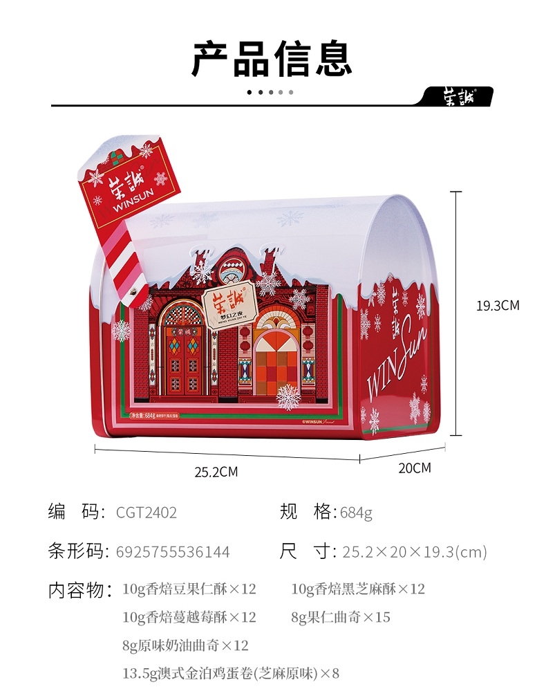配置:13.5g澳式金泊鸡蛋卷(芝麻原味)x8 10g香焙豆果仁酥x12 10g香焙黑芝麻酥x12 10g香焙蔓越莓酥x12 8g原味奶油曲奇x12 8g果仁曲奇x15
