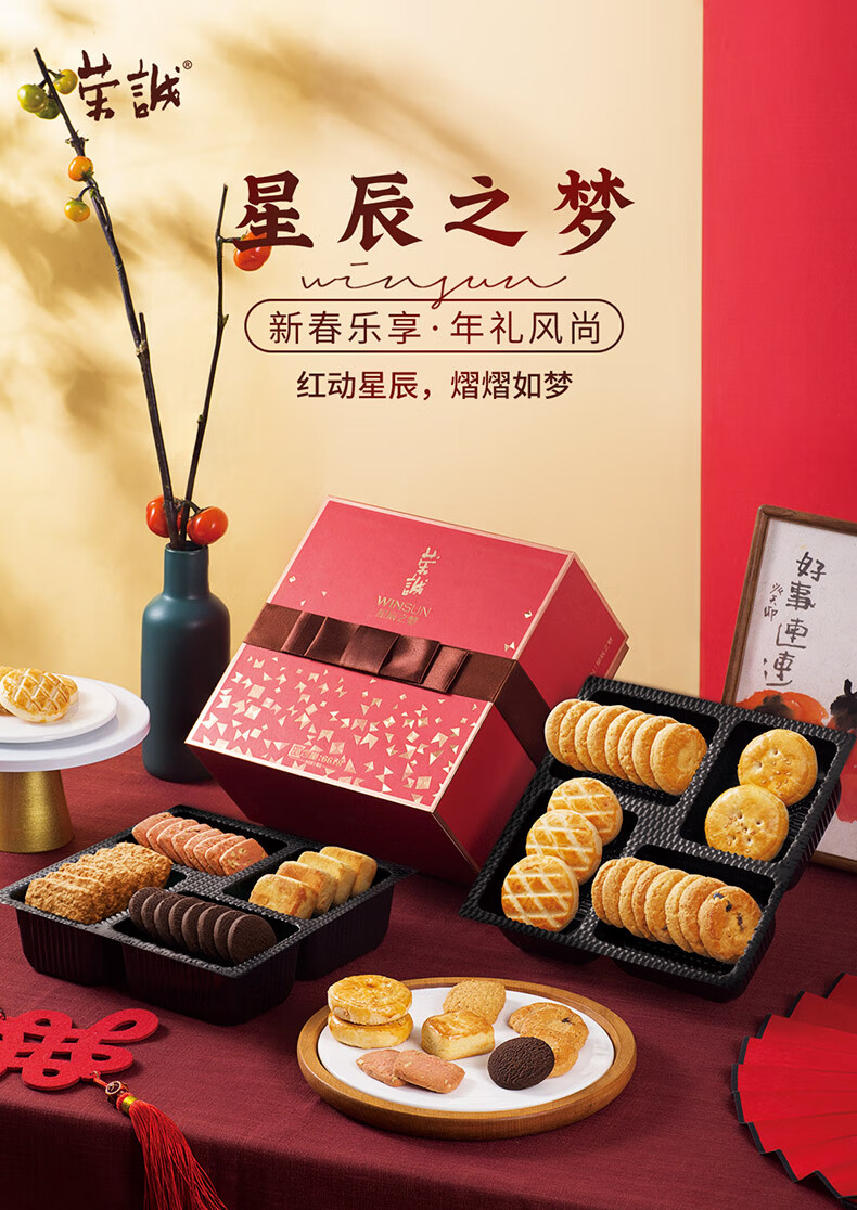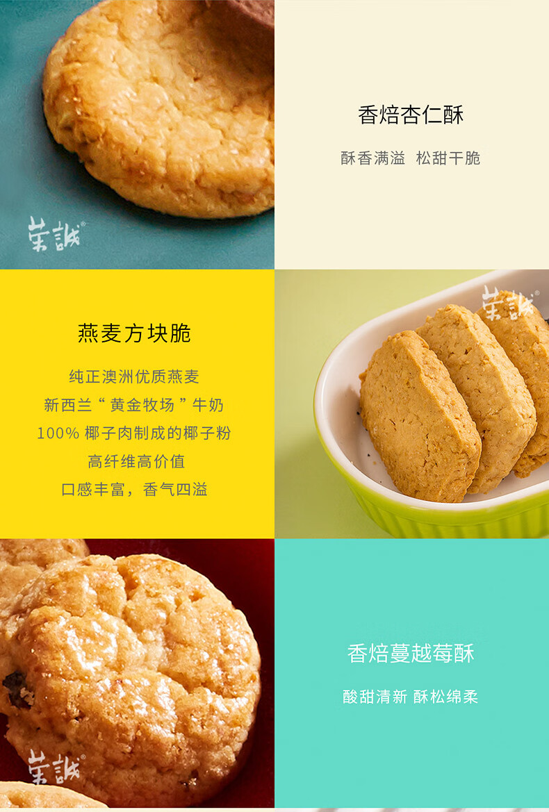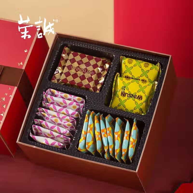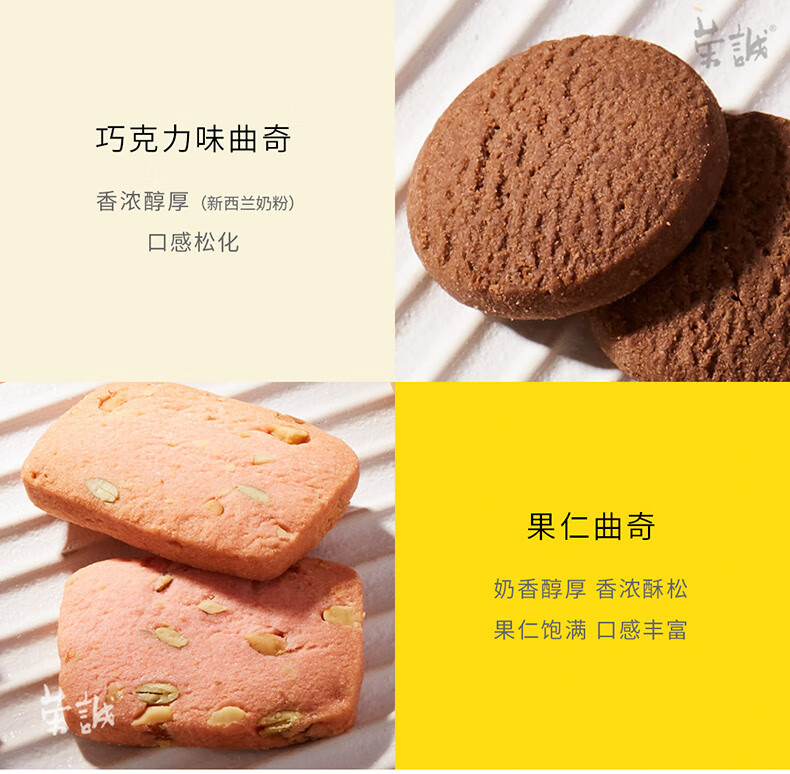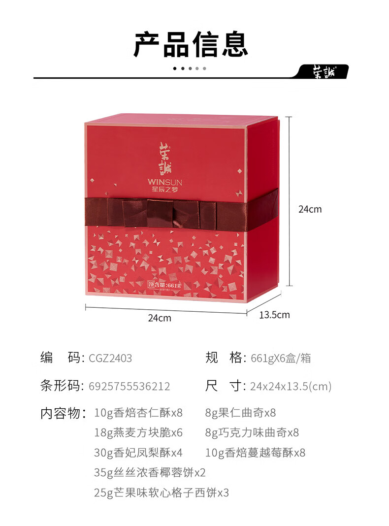 配置:35g丝丝浓香椰蓉饼x2 25g芒果味软心格子西饼x3 30g香妃凤梨酥x4 18g燕麦方块脆x6 10g香焙杏仁酥x8 10g香焙蔓越莓酥x8 8g巧克力味曲奇x8 8g果仁曲奇x8