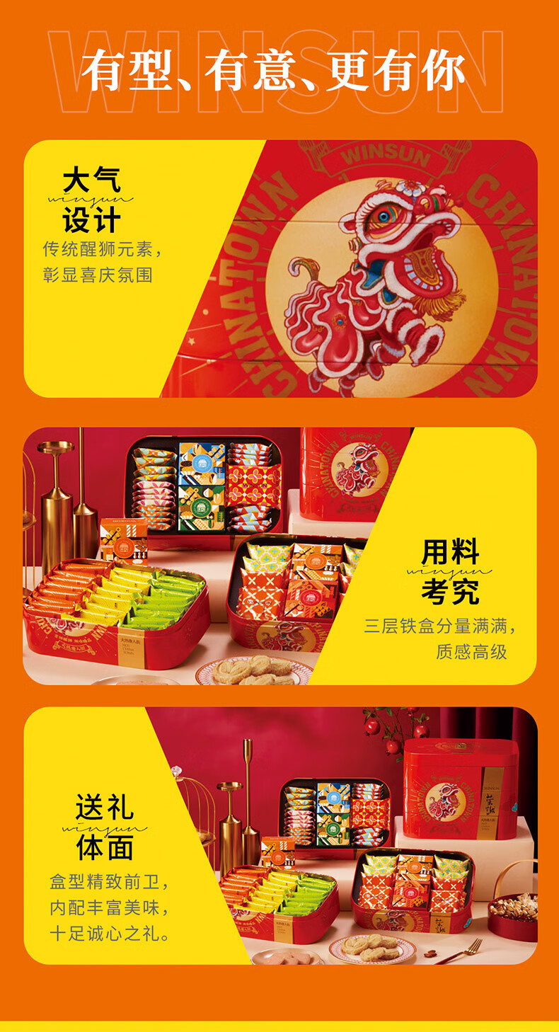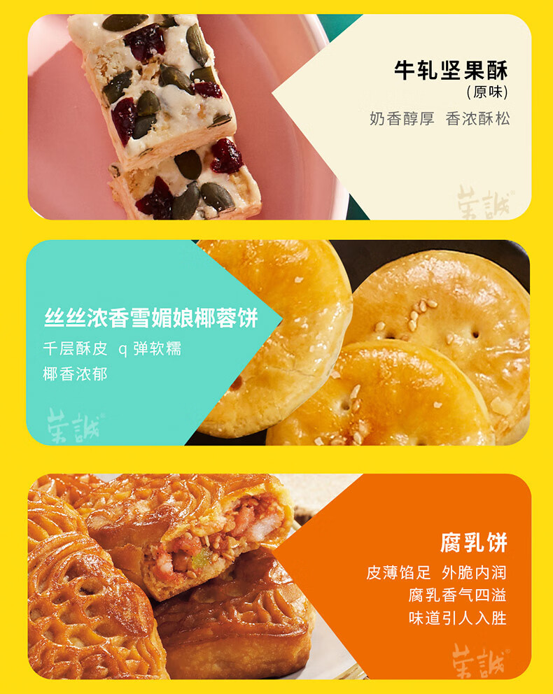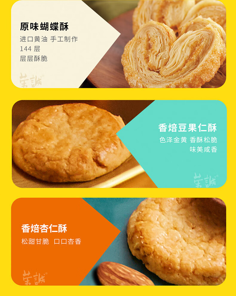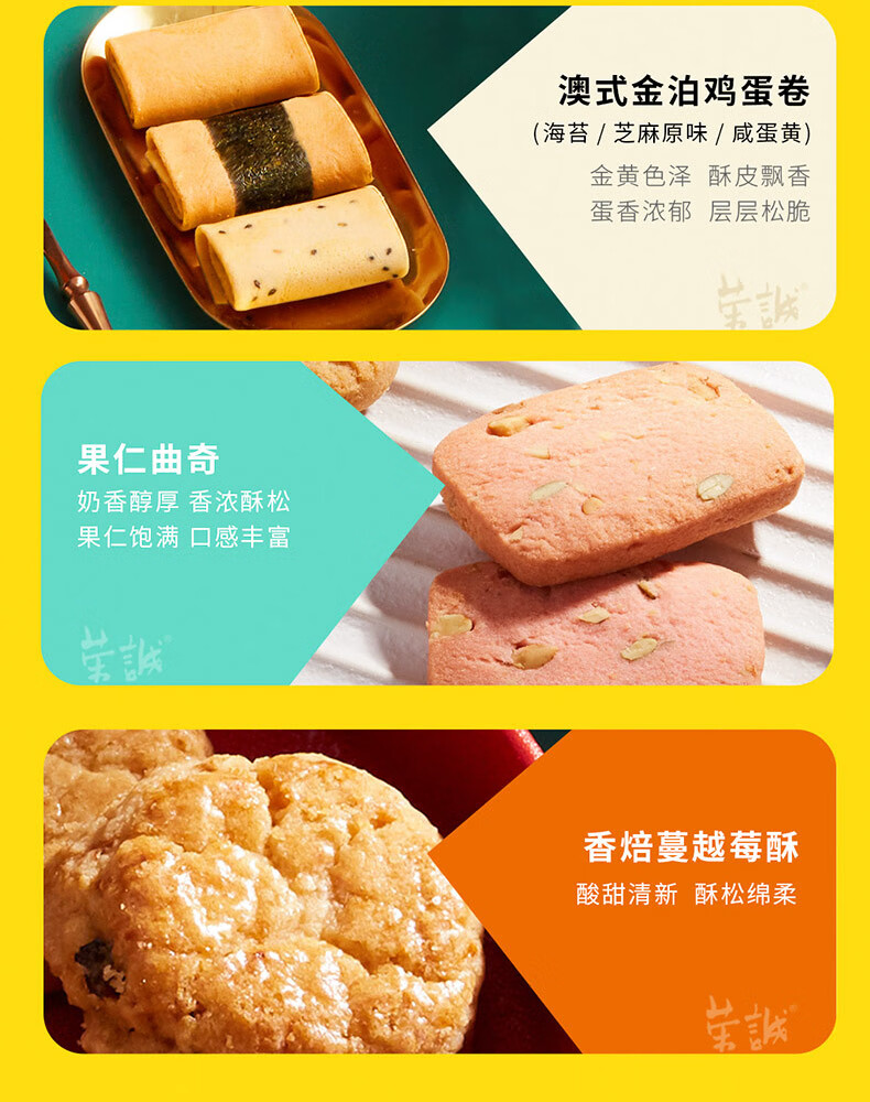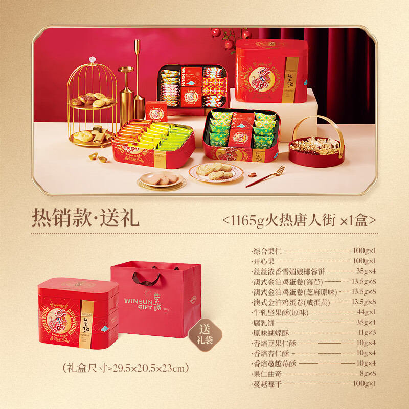 - 配置:100g综合果仁x1 100g开心果x1 100g蔓越莓干x1 44g牛轧坚果酥(原味)x1 35g丝丝浓香雪媚娘椰蓉饼x4 35g特色果仁腐乳饼x4 11g原味蝴蝶酥x3 10g香焙豆果仁酥x4 10g香焙杏仁酥x4 10g香焙蔓越莓酥x4 8g果仁曲奇x8 13.5g澳式金泊鸡蛋卷(海苔)x8 13.5g澳式金泊鸡蛋卷(芝麻原味)x8 13.5g澳式金泊鸡蛋卷(咸蛋黄)x8