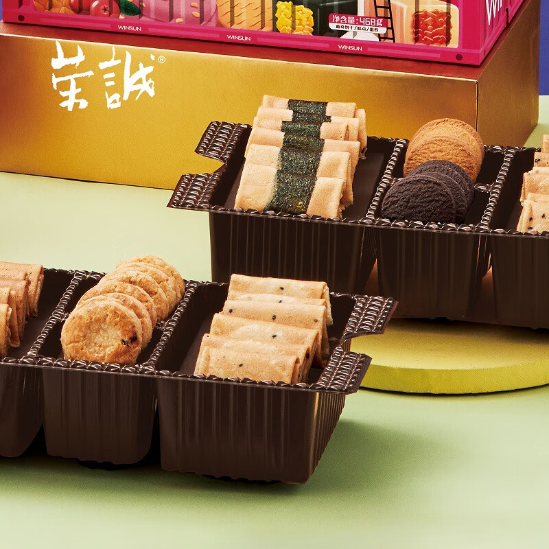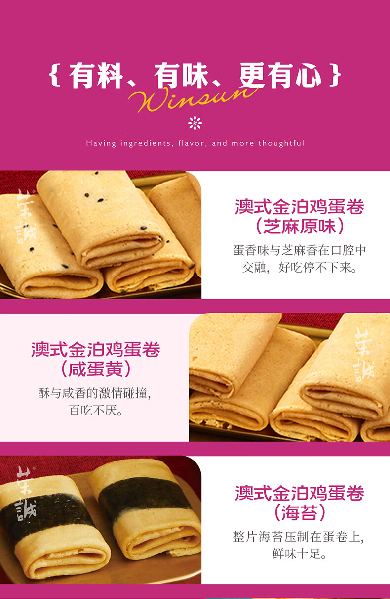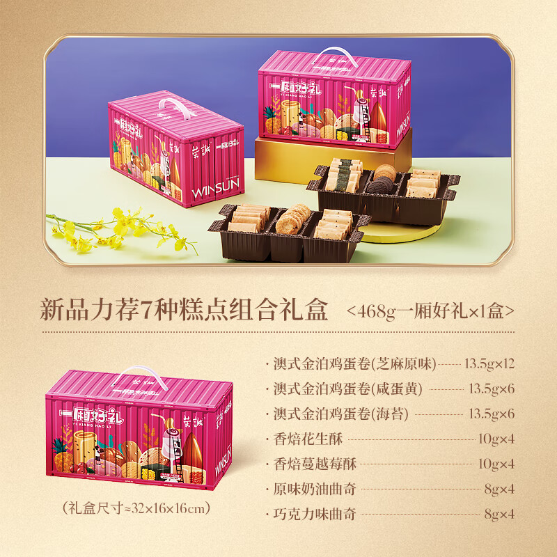 配置:13.5g澳式金泊鸡蛋卷(芝麻原味)x12 13.5g澳式金泊鸡蛋卷(咸蛋黄)x6 13.5g澳式金泊鸡蛋卷(海苔)x6 10g香焙花生酥x4 10g香焙蔓越莓酥x4 8g原味奶油曲奇x4 8g巧克力味曲奇x4
