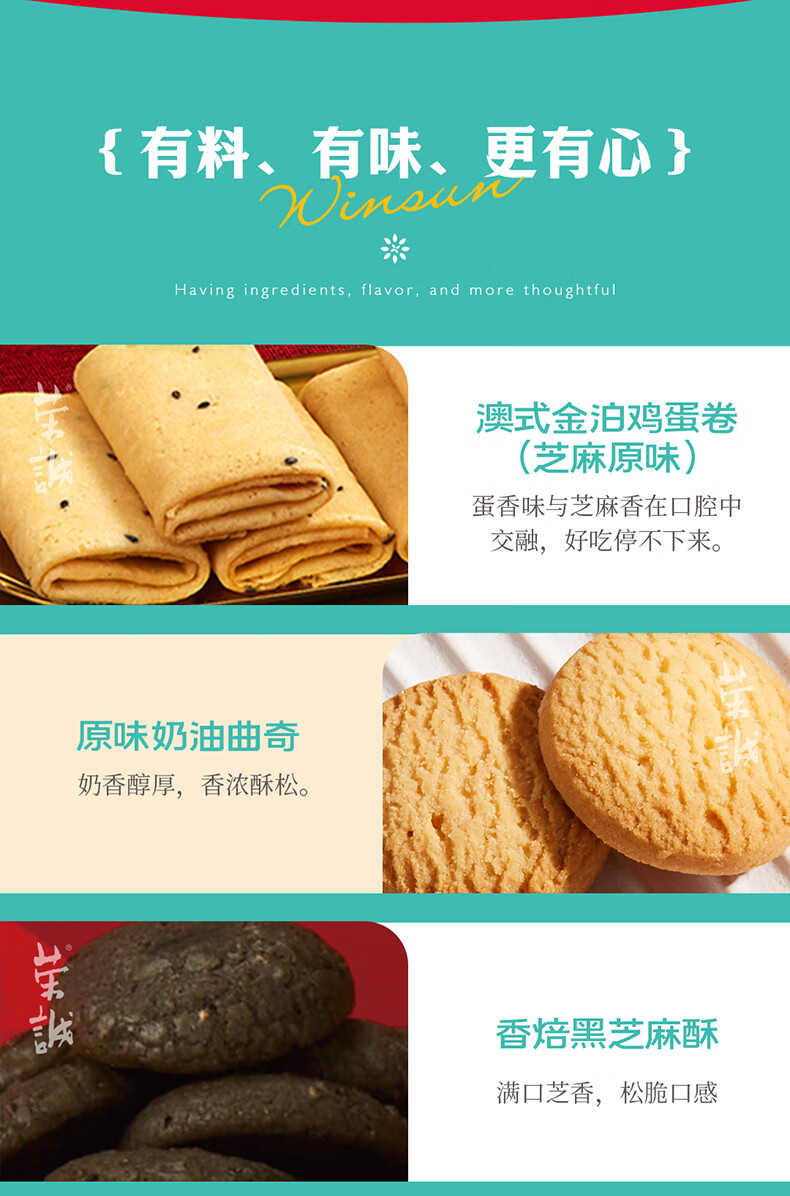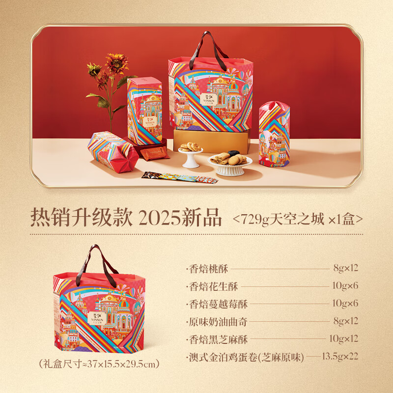 配置:13.5g澳式金泊鸡蛋卷(芝麻原味)x22 8g原味奶油曲奇x12 10g香焙黑芝麻酥x12 8g香焙桃酥x12 10g香焙花生酥x6 10g香焙蔓越莓酥x6