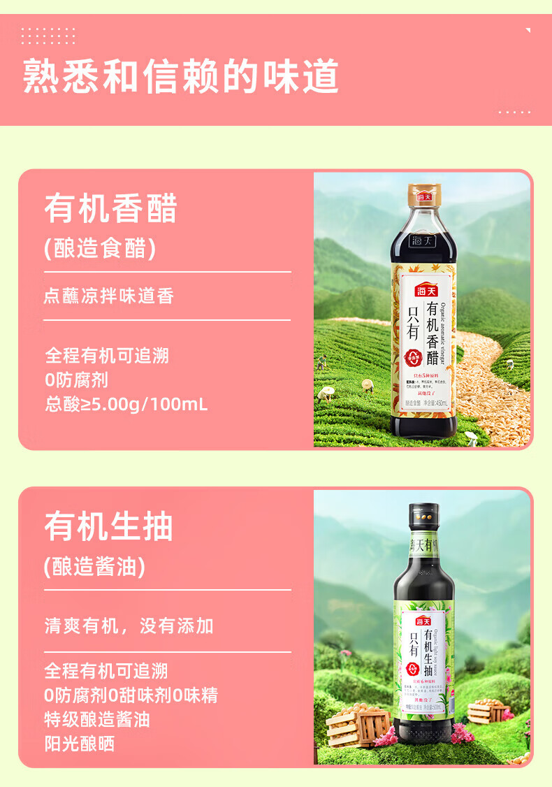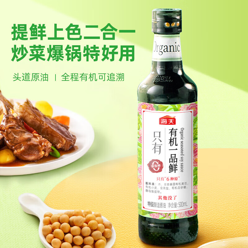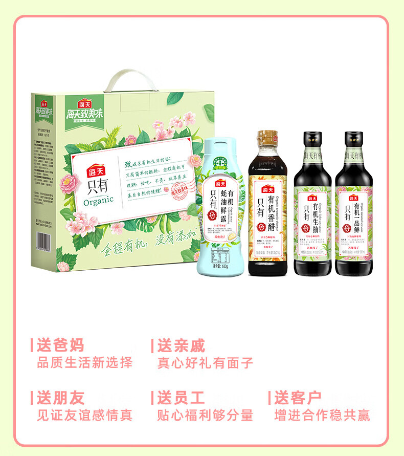 配置:有机蚝油鲜露600g*1 有机香醋450ml*1 有机生抽500ml*1 有机一品鲜500ml*1