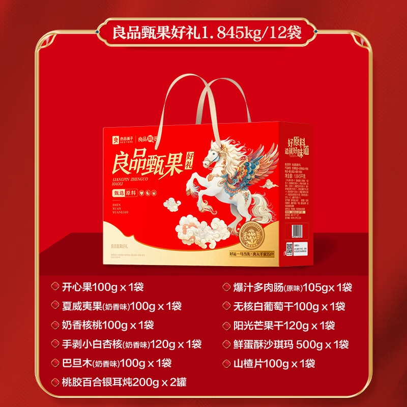 配置:开心果100g 奶香夏威夷果100g 奶香核桃100g 手剥小白杏核(奶香味)120g 奶香巴旦木100g 爆汁多肉肠(原味)105g 无核白葡萄干100g 阳光芒果干120g 鲜蛋酥沙琪玛500g 山楂片100g 桃胶百合银耳炖200g*2