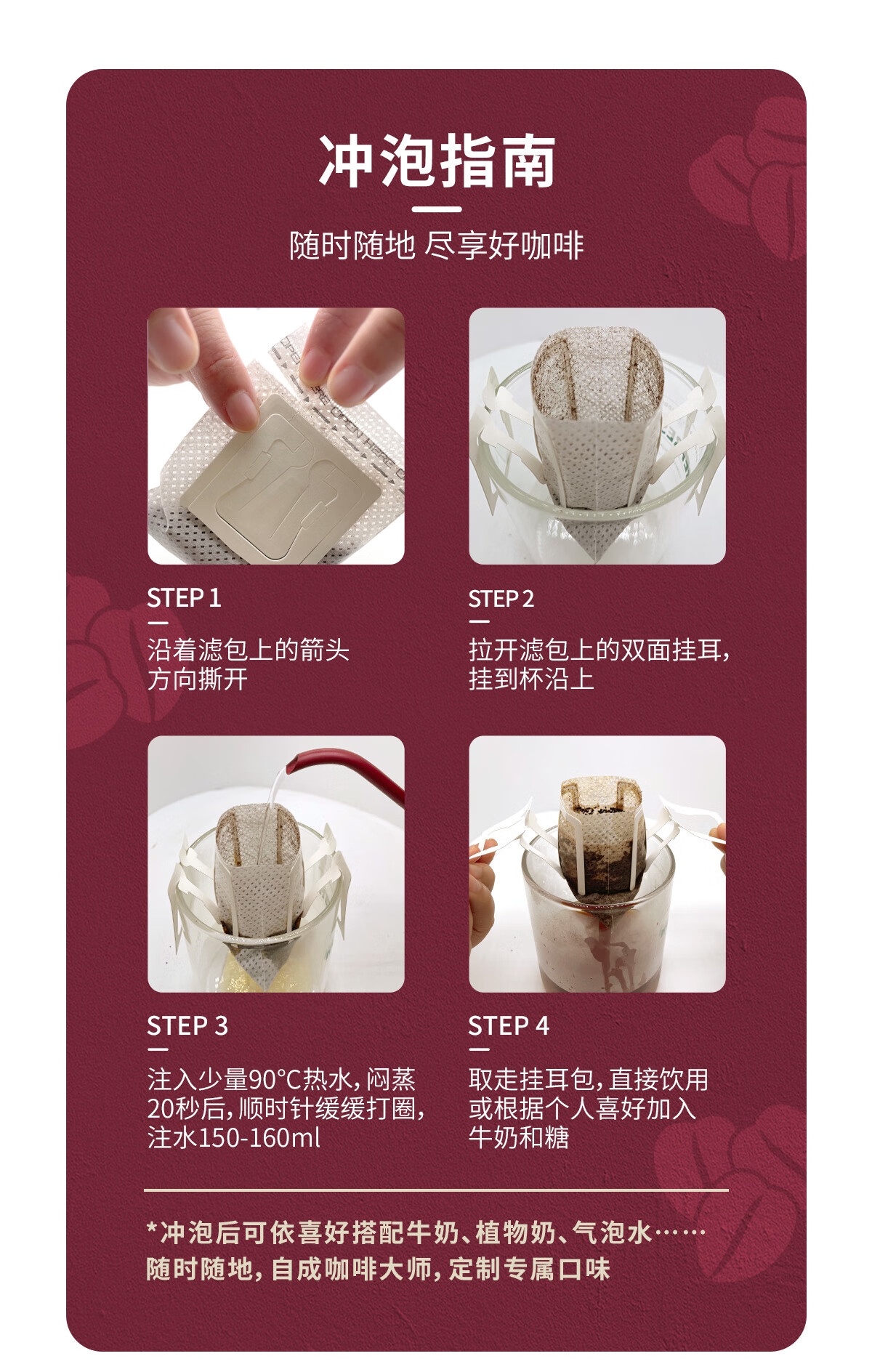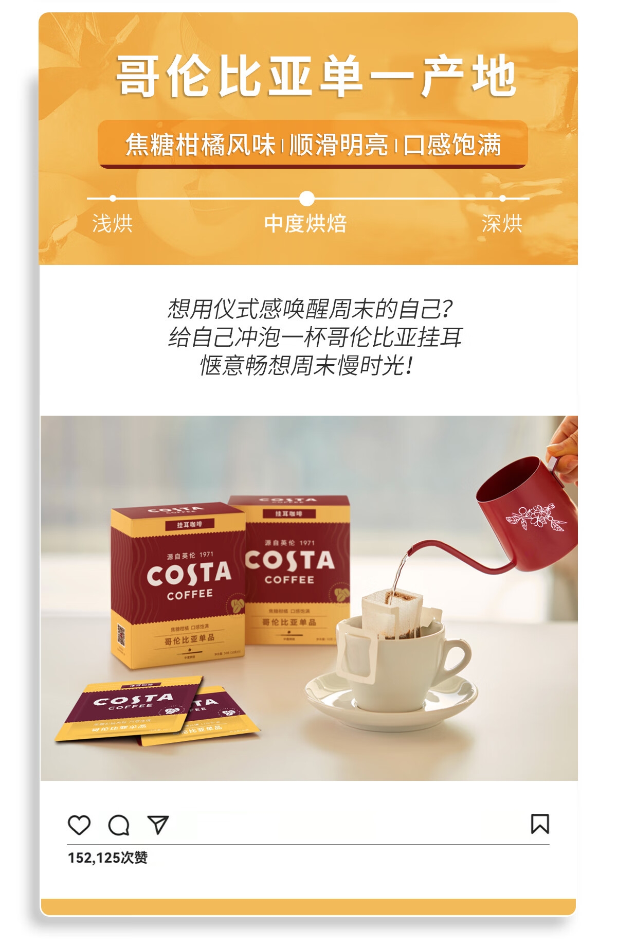 哥伦比亚挂耳咖啡酸度明亮,满足手冲爱好者的风味探索;单包咖啡粉量提升,冲泡更浓郁;手冲壶冲泡后,咖啡可倒入保温杯随身携带