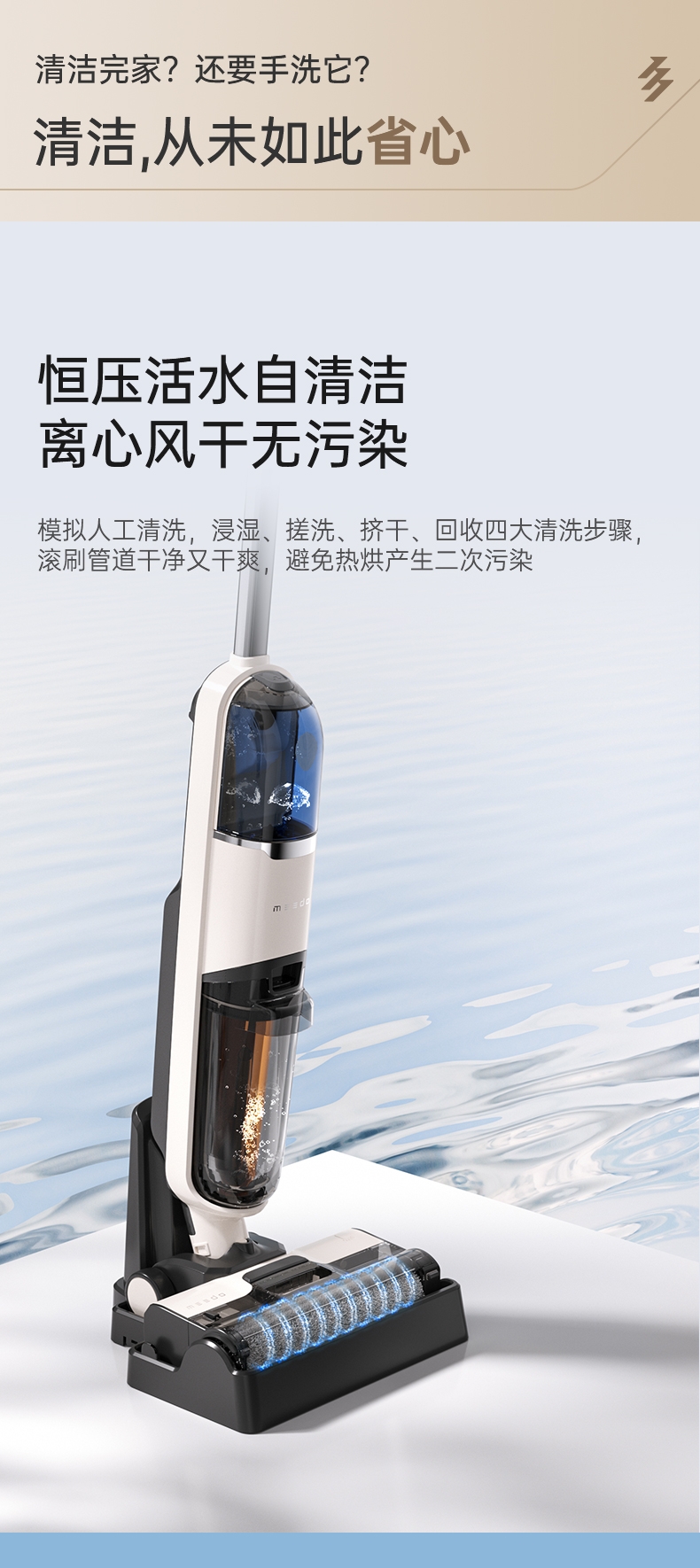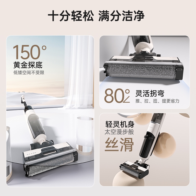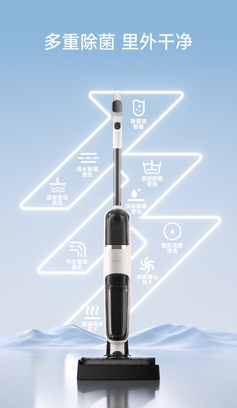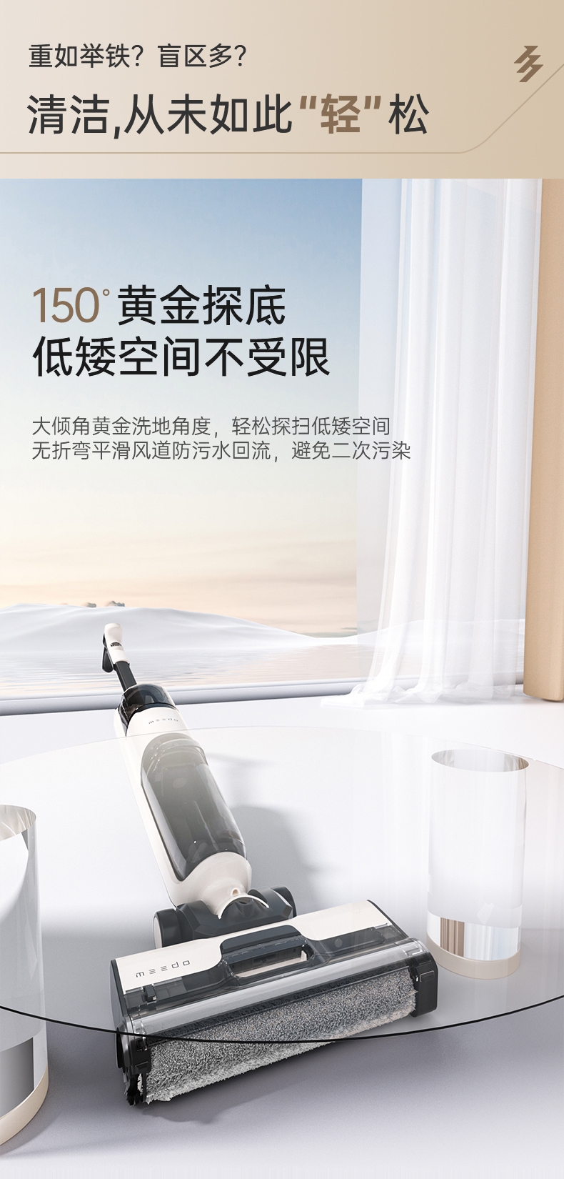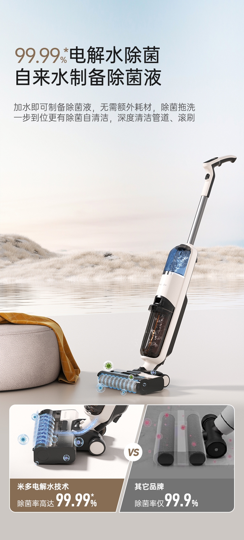 150°黄金探底,低矮空间不受限 轻灵机身;99.99%电解水除菌,自来水制备除菌液 干吸湿拖;离水风干无污染 多重除菌,里外干净