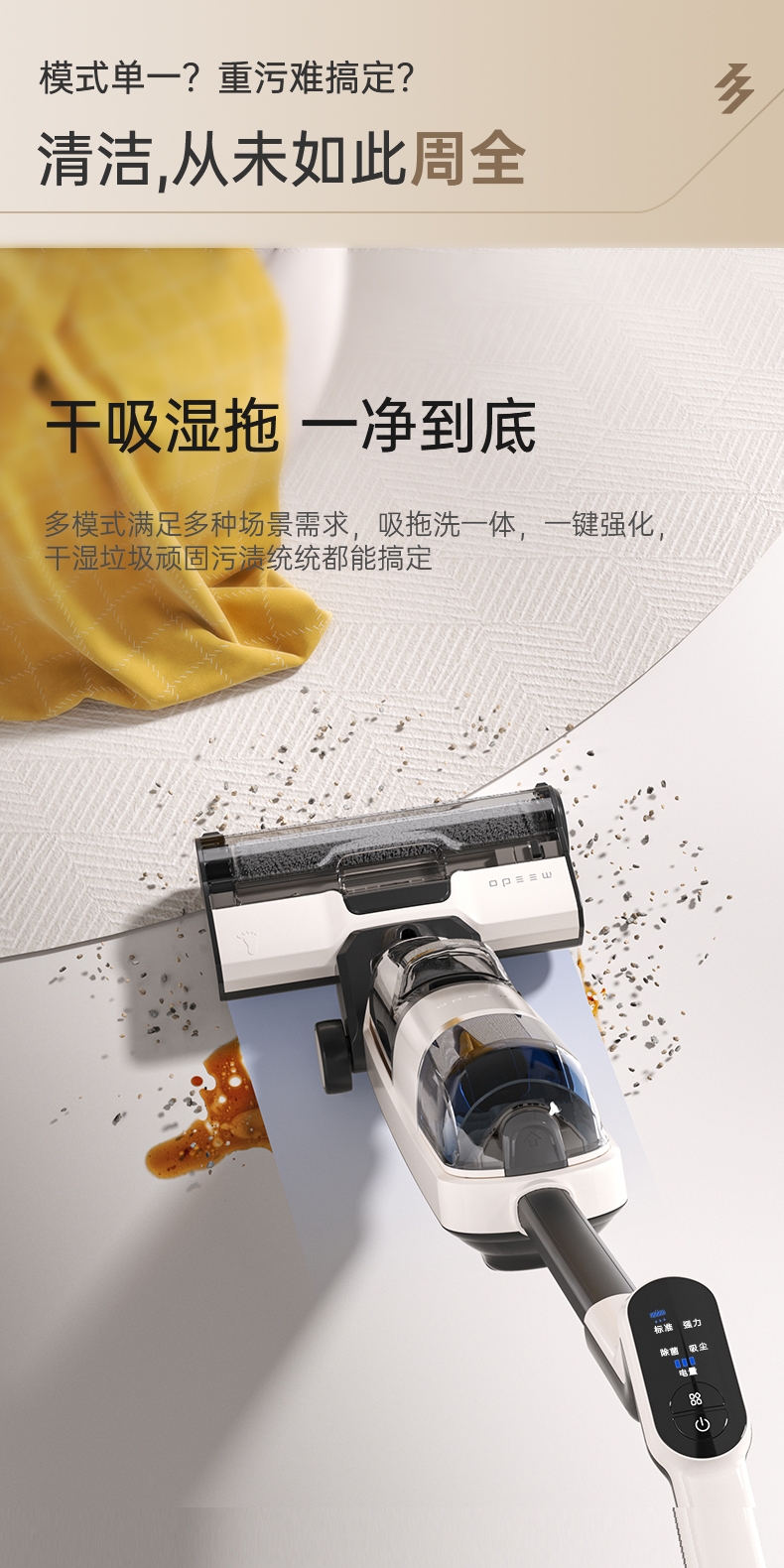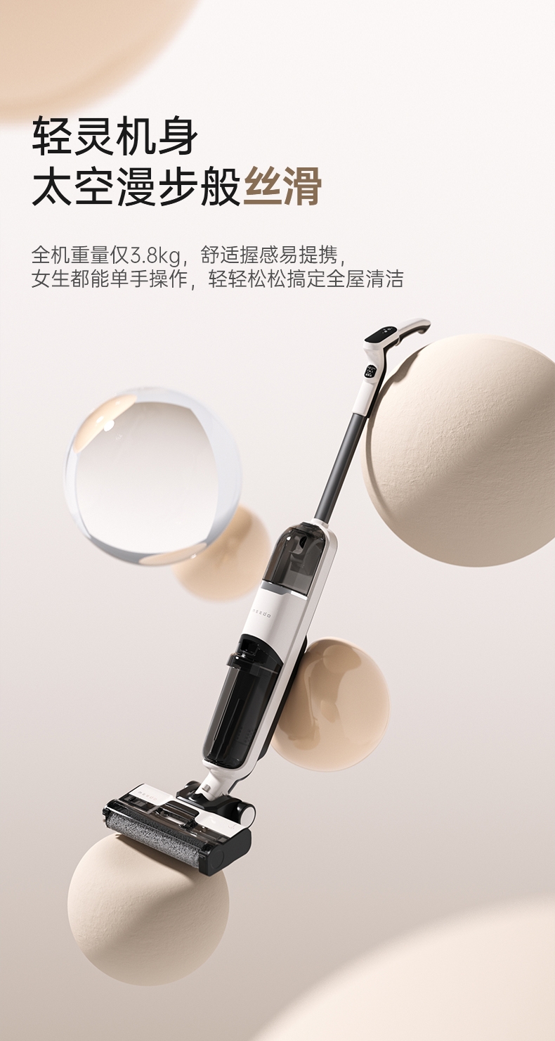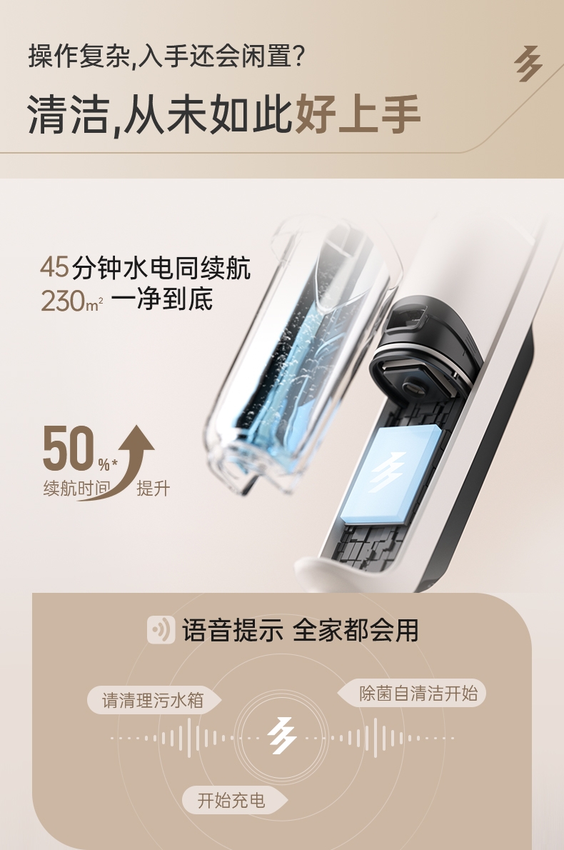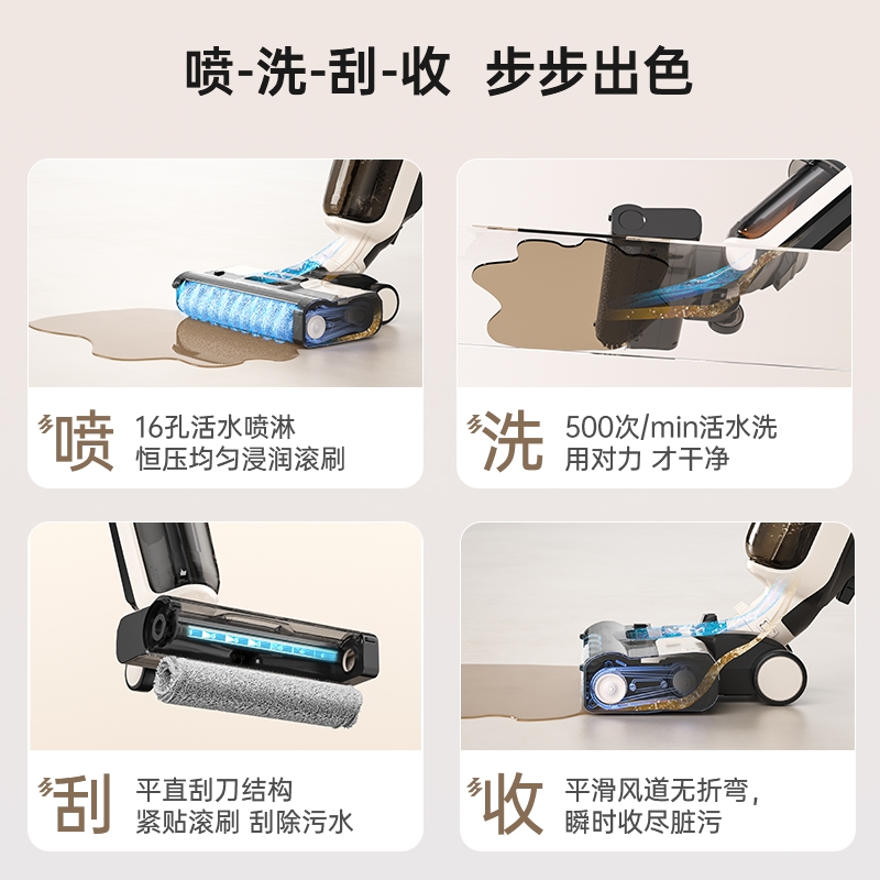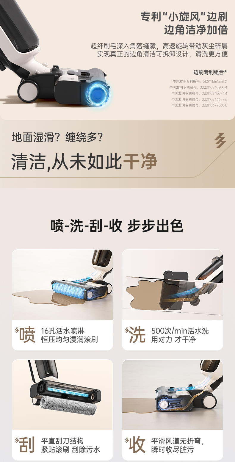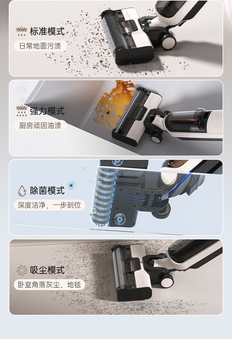 150°黄金探底,低矮空间不受限 轻灵机身;99.99%电解水除菌,自来水制备除菌液 干吸湿拖;离水风干无污染 多重除菌,里外干净
