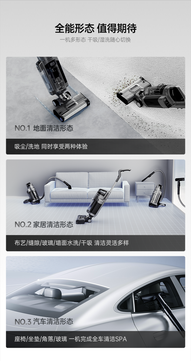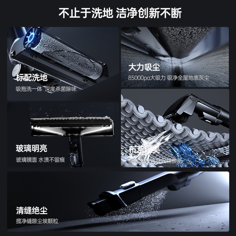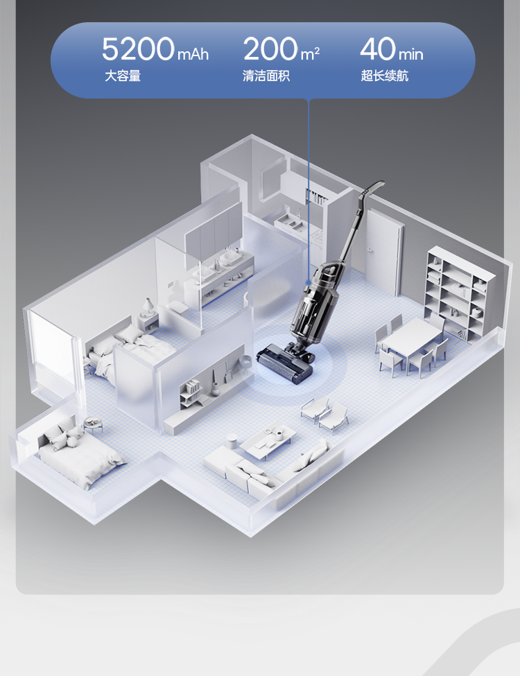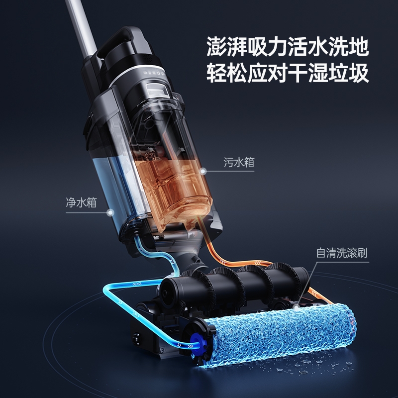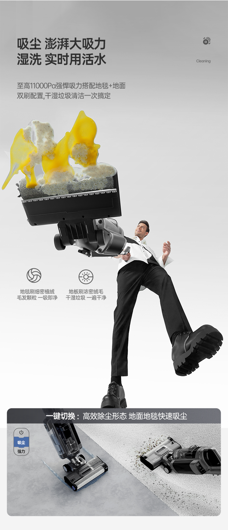 鸿蒙智联,远程控制 一机全能,全域水洗;12KPa高性能大吸力,200W大功率飓风吸力。;40分钟长续航,清扫整屋不断电;自清洁免手洗,4档自清洁模式。
