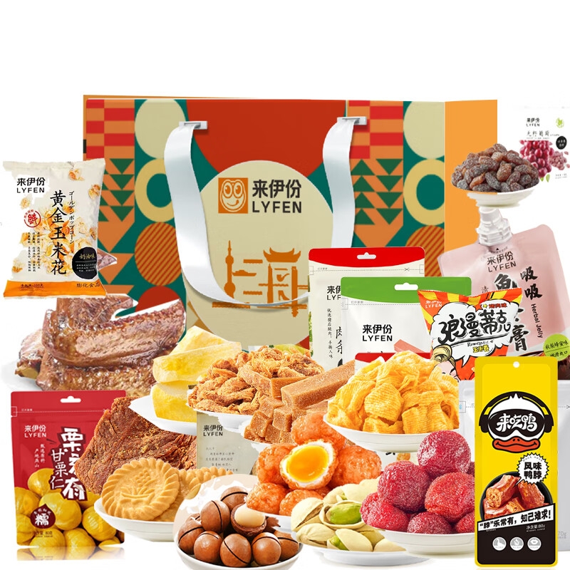 配置:鲜奶味话梅108g*1 虎皮鹌鹑蛋125g*1 风味鸭脖80g*1 黄金玉米花(奶油味)100g*1 夏威夷果100g*1 栗刻有甘栗仁80g*1 山楂棒130g*1 70g鸭翅*1 无籽葡萄118g*1 苏打饼干(奶盐味)360g*1 呼吸龟苓膏253g*1