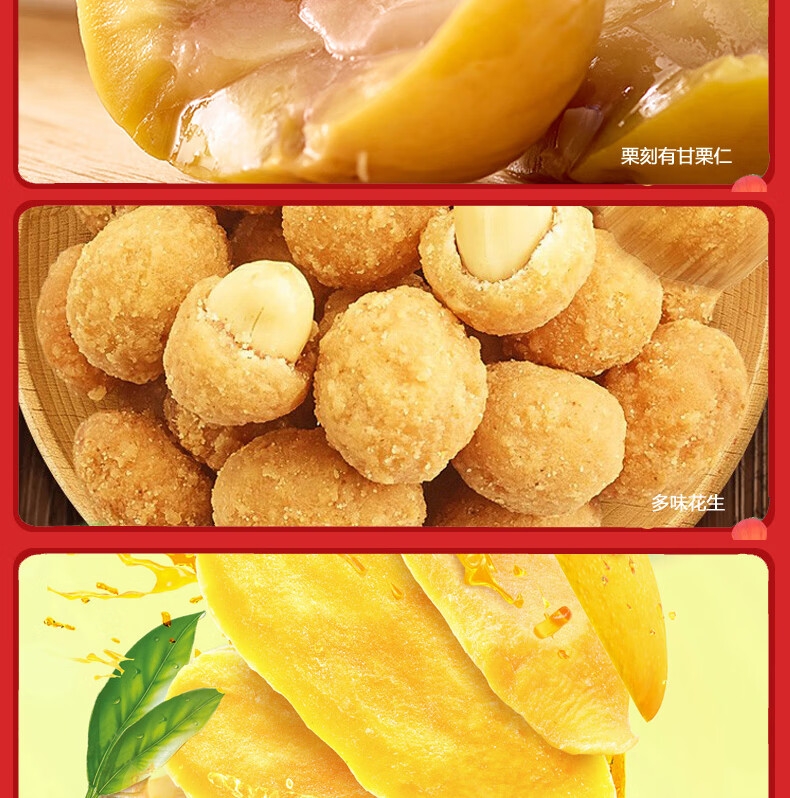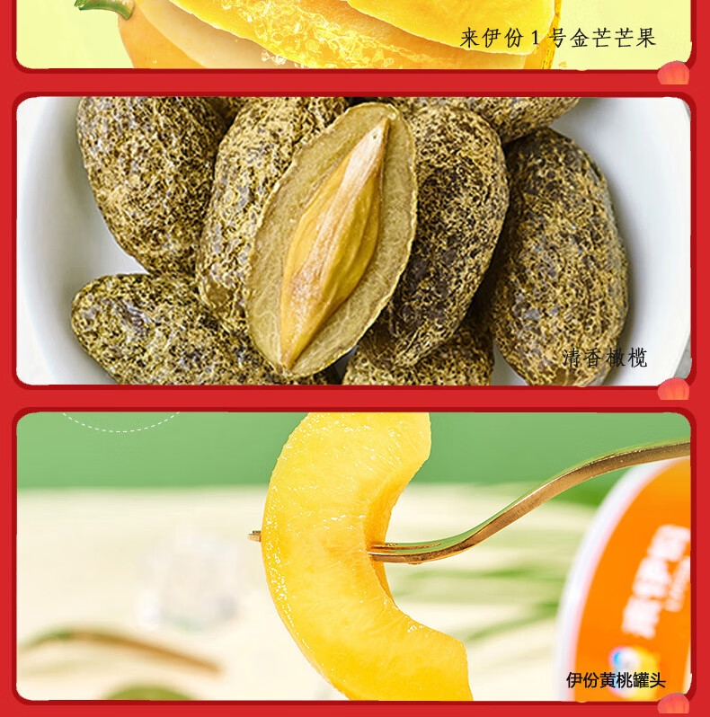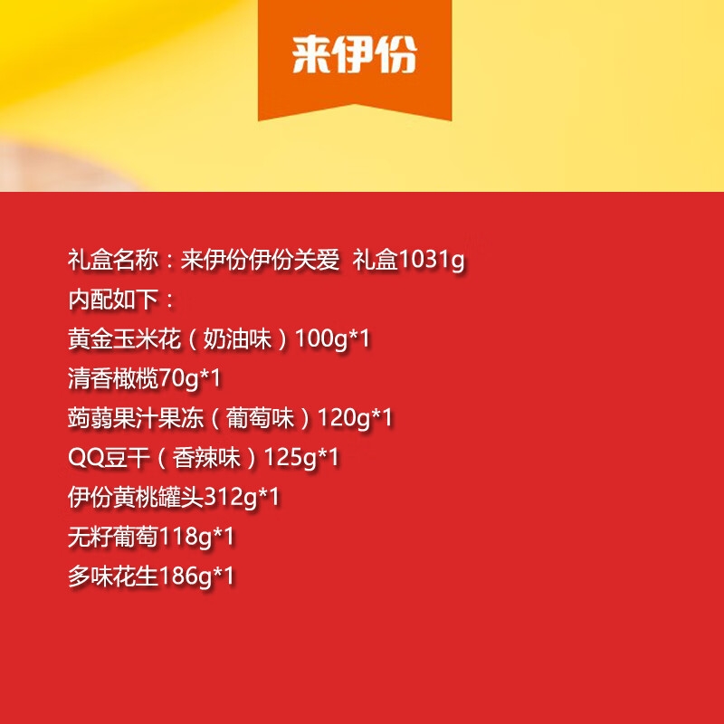 配置:黄金玉米花(奶油味)100g*1 清香橄榄70g*1 蒟蒻果汁果冻(葡萄味)120g*1 QQ豆干(香辣味)125g*1 伊份黄桃罐头312g*1 无籽葡萄118g*1 多味花生186g*1