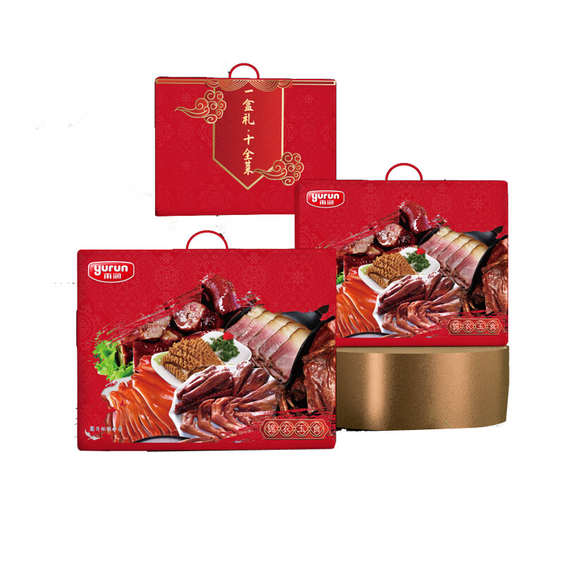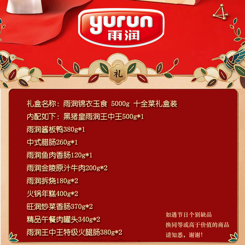 配置:黑猪皇雨润王中王500g*1 雨润酱板鸭380g*1 中式腊肠260g*1 雨润鱼肉香肠120g*1 雨润金陵原汁牛肉200g*2 雨润拆烧180g*2 火锅年糕400g*2 旺润炒菜香肠370g*2 精品午餐肉罐头340g*2 雨润王中王特级火腿肠380g*2