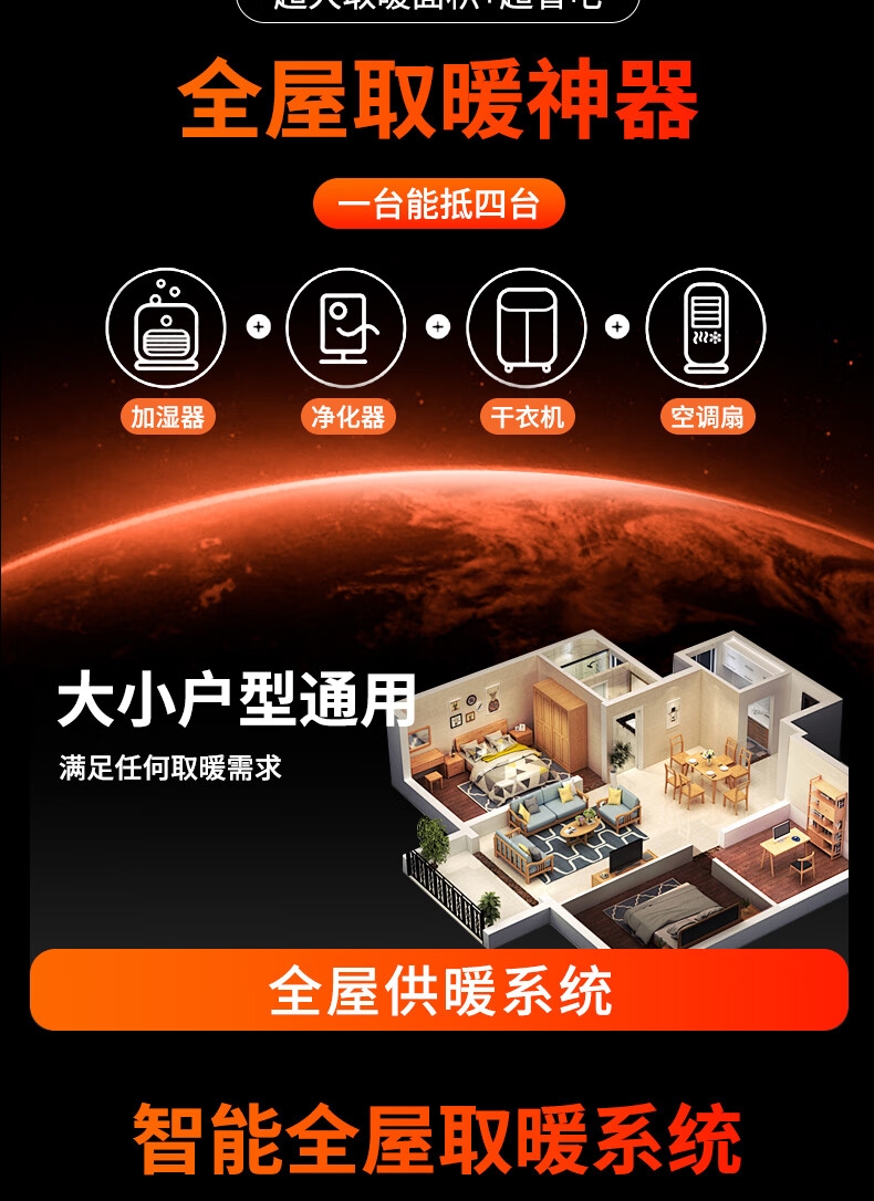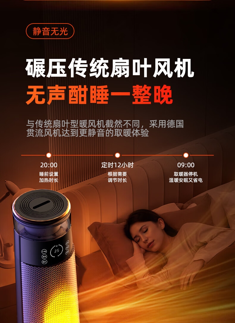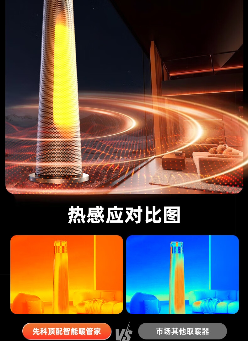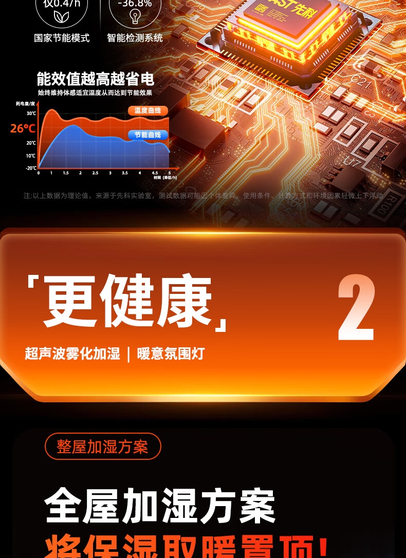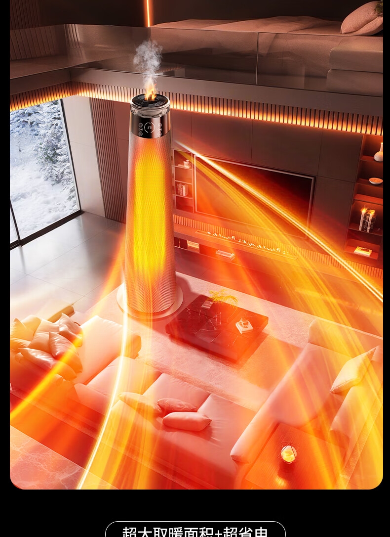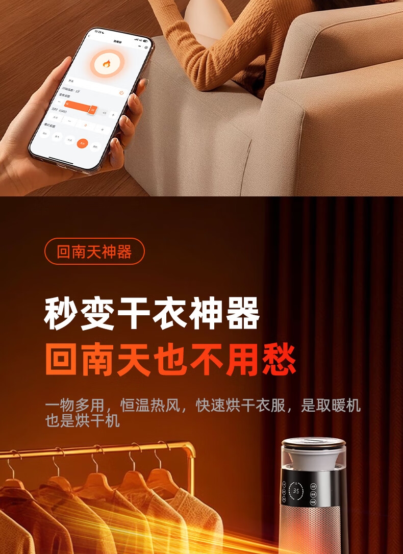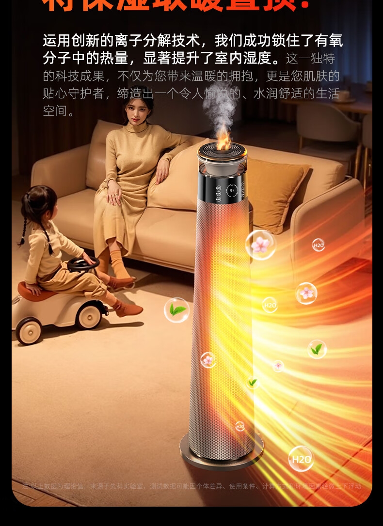 智能语音操控 APP远程操作;陶瓷PTC加热体 内超广角环绕出风;智能变频节能 超声波雾化加湿