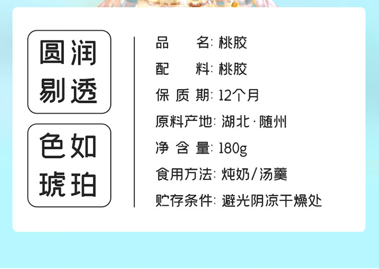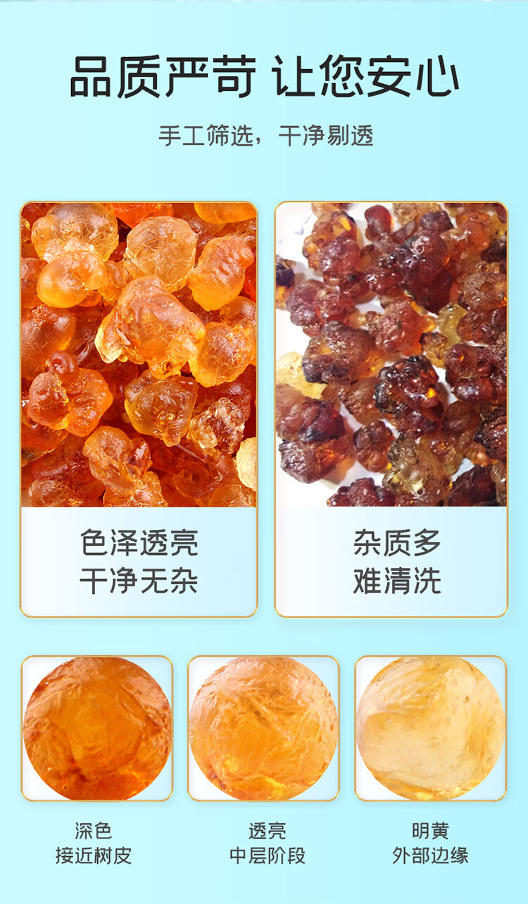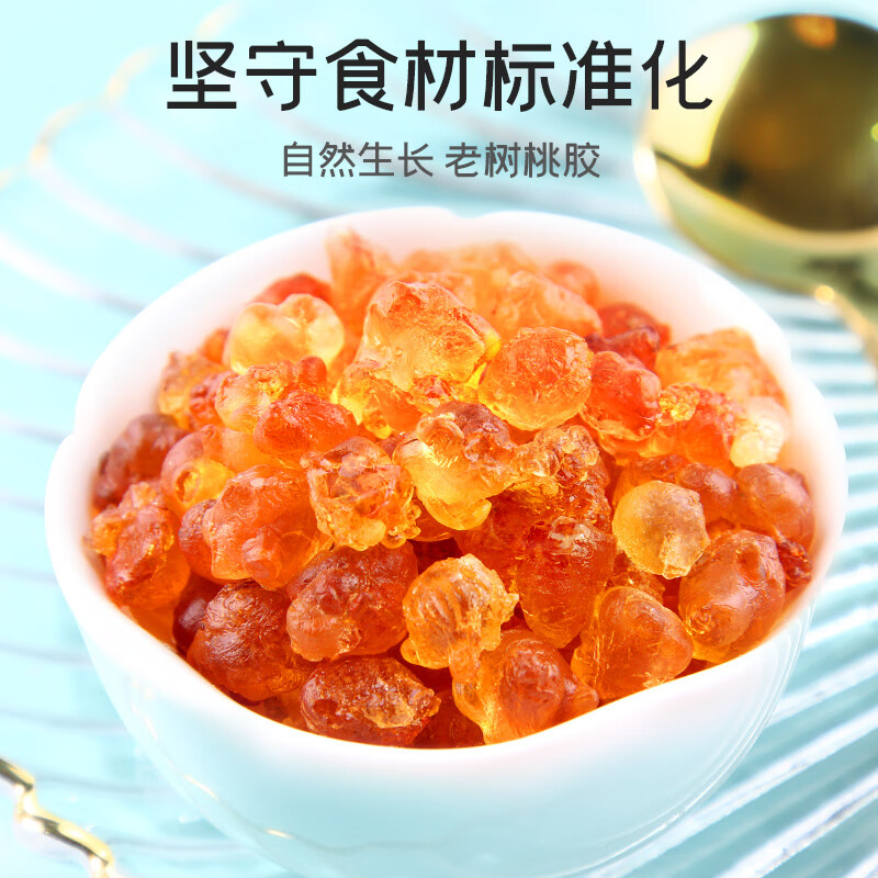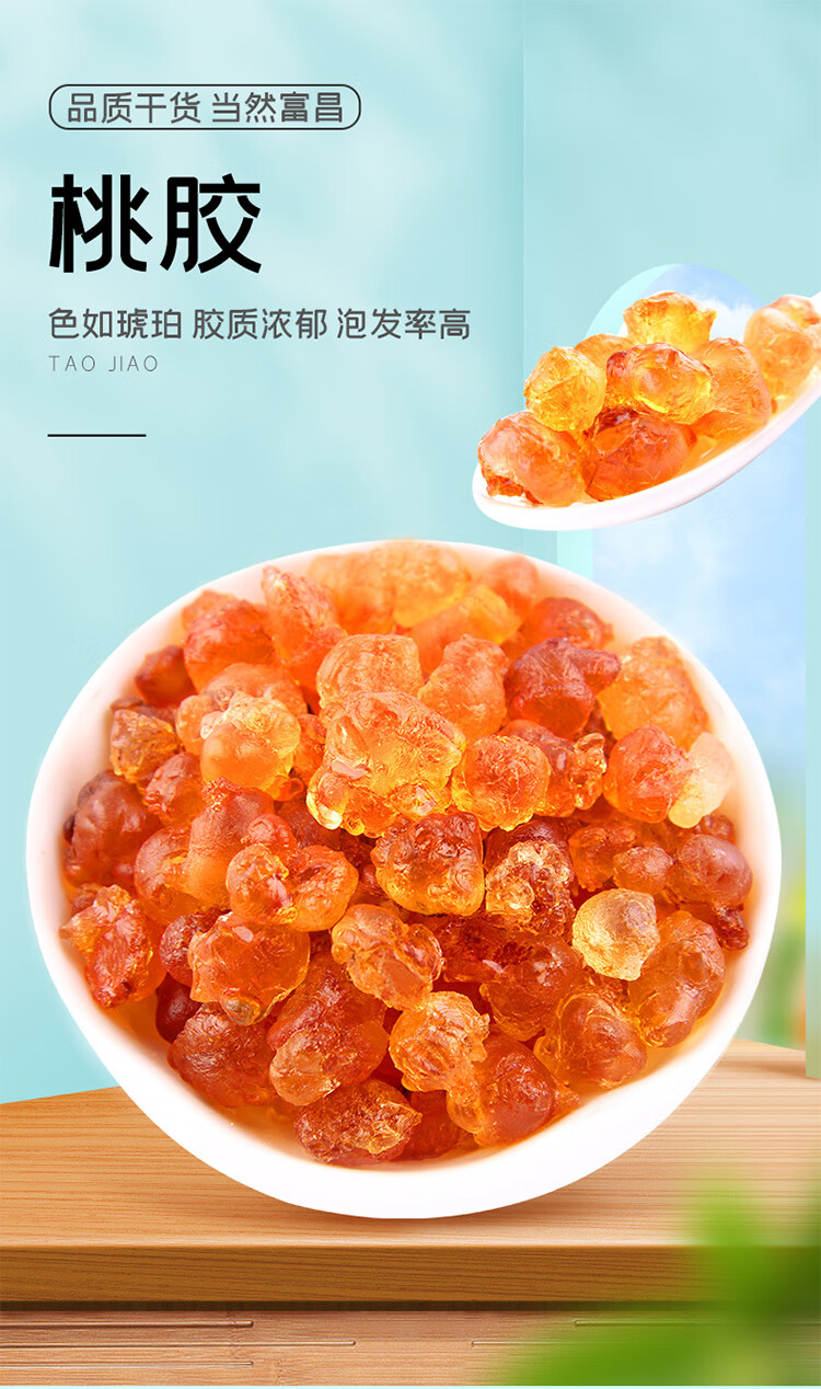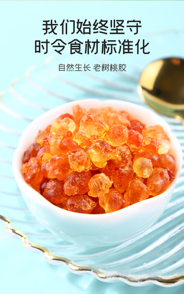 自然生长 老树桃胶;高泡发率,泡发后晶莹透亮;果粒饱满,胶质丰富