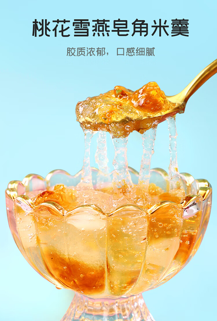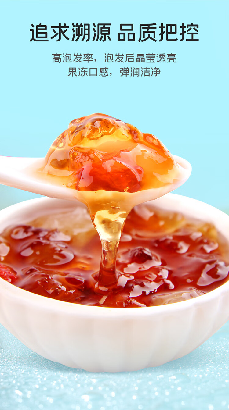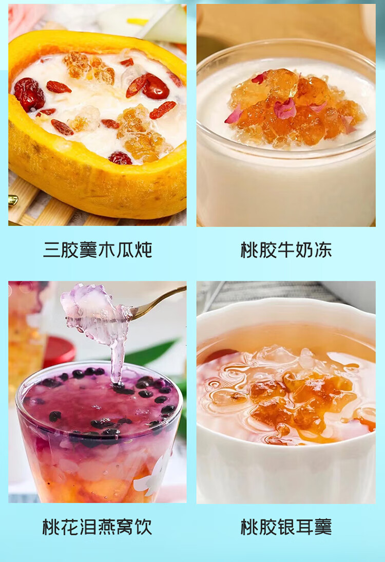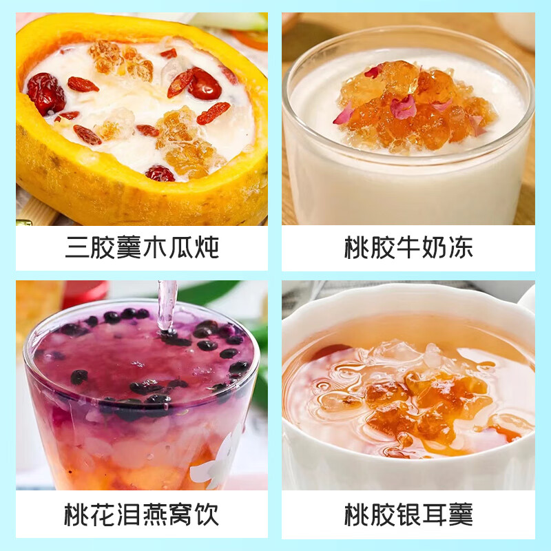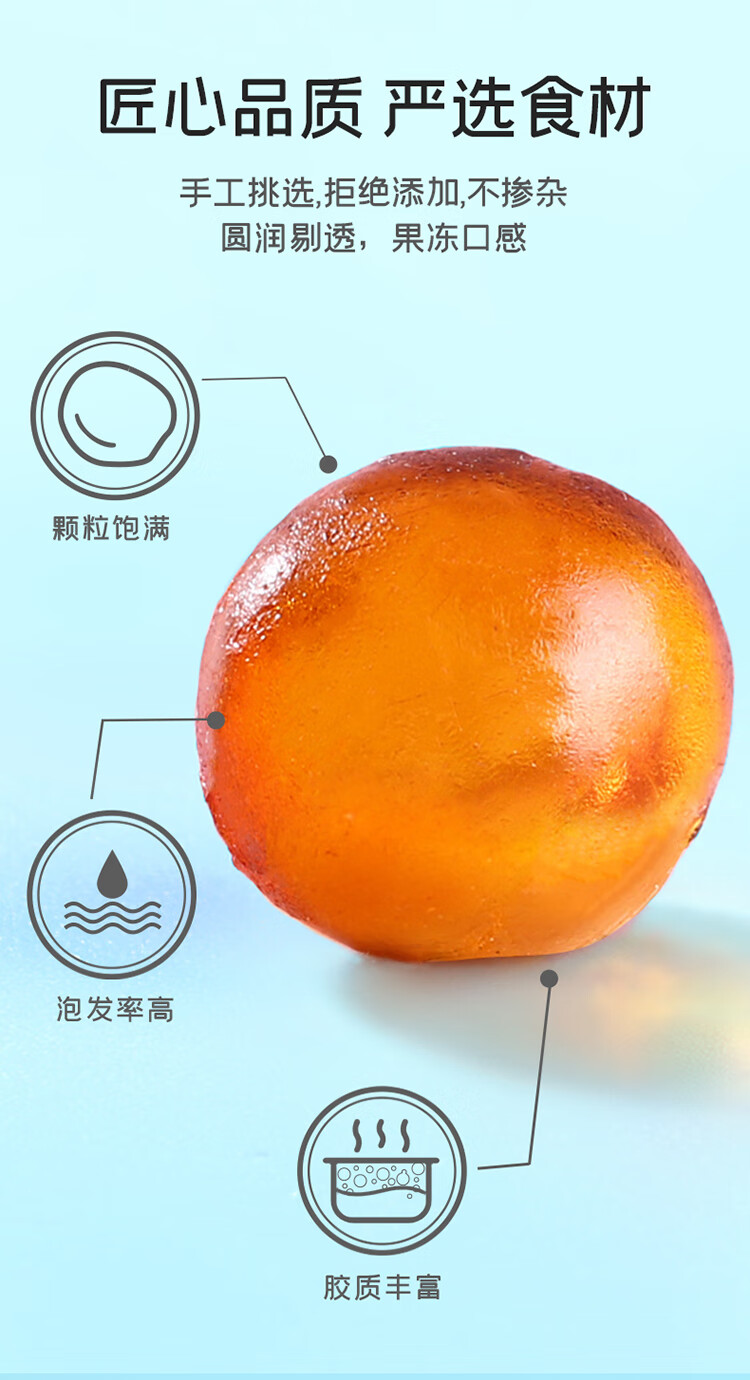 自然生长 老树桃胶;高泡发率,泡发后晶莹透亮;果粒饱满,胶质丰富