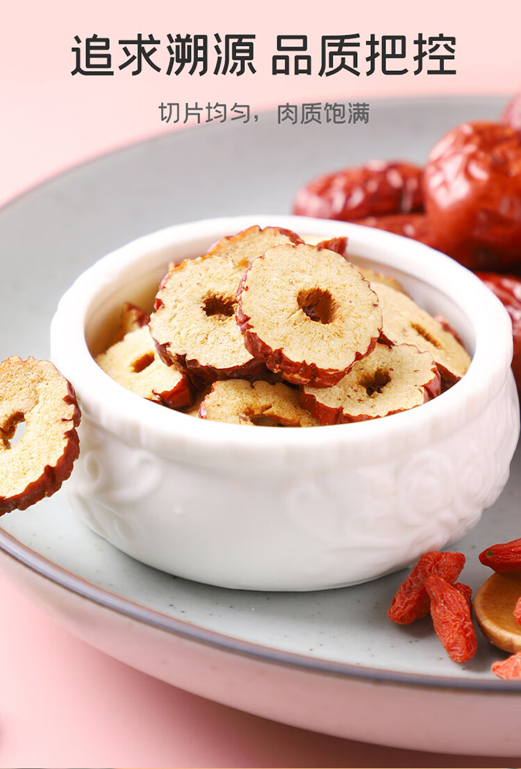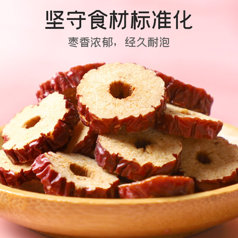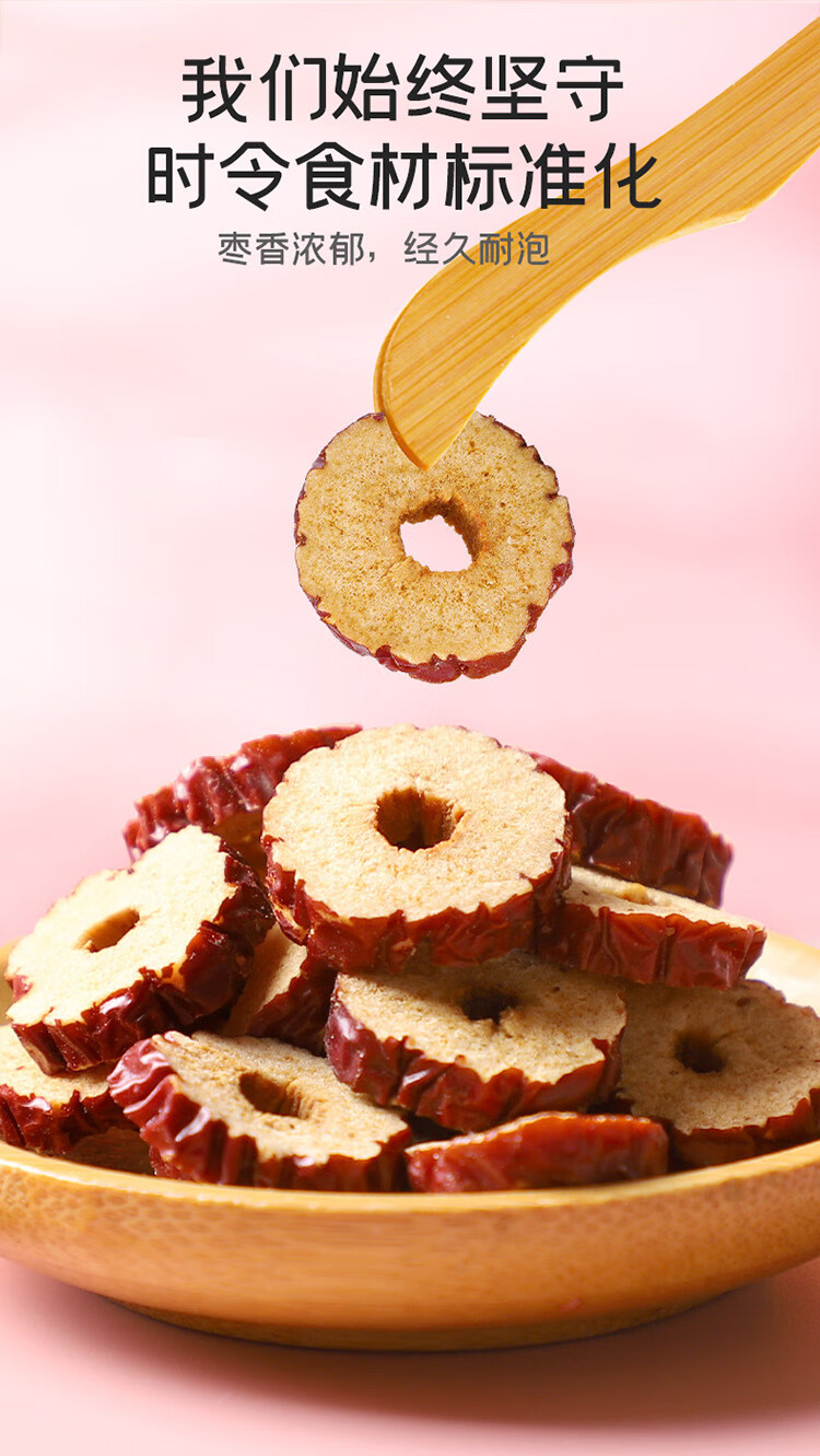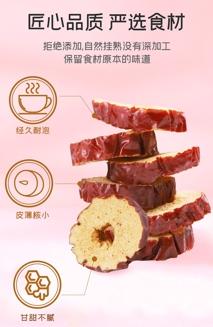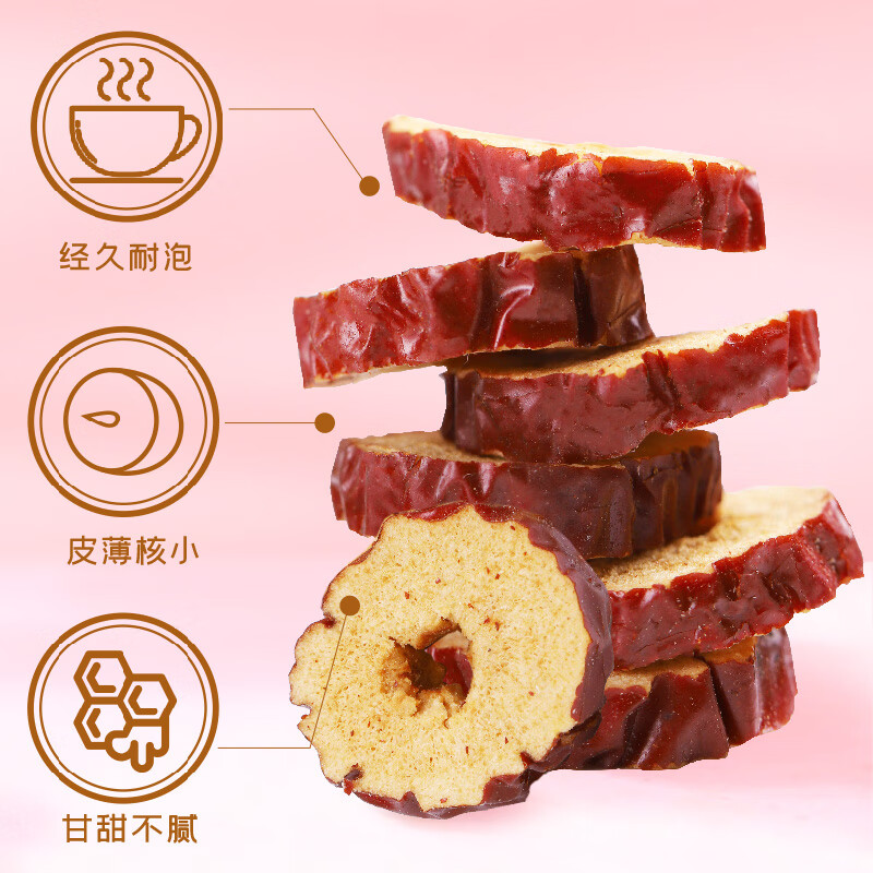 切片均匀,肉质饱满;口感清甜, 馥郁芬芳;枣香浓郁,经久耐泡