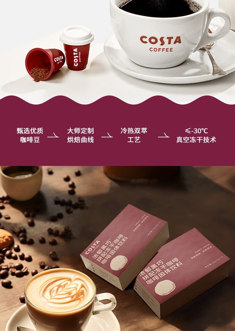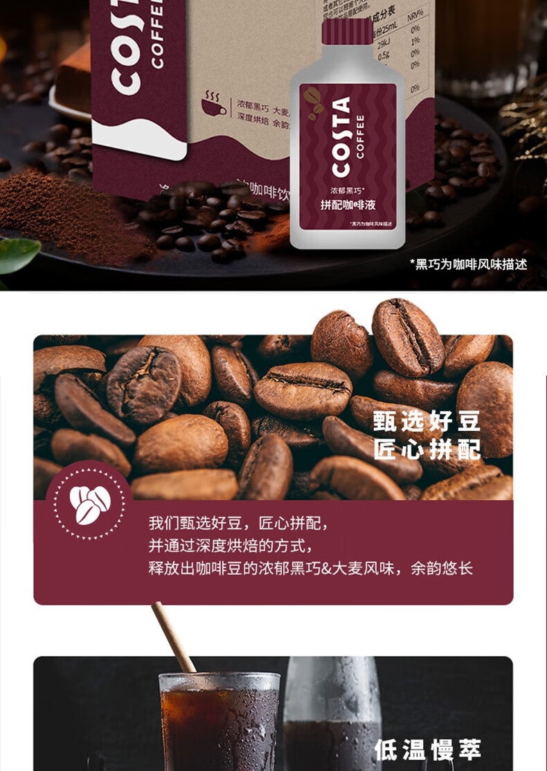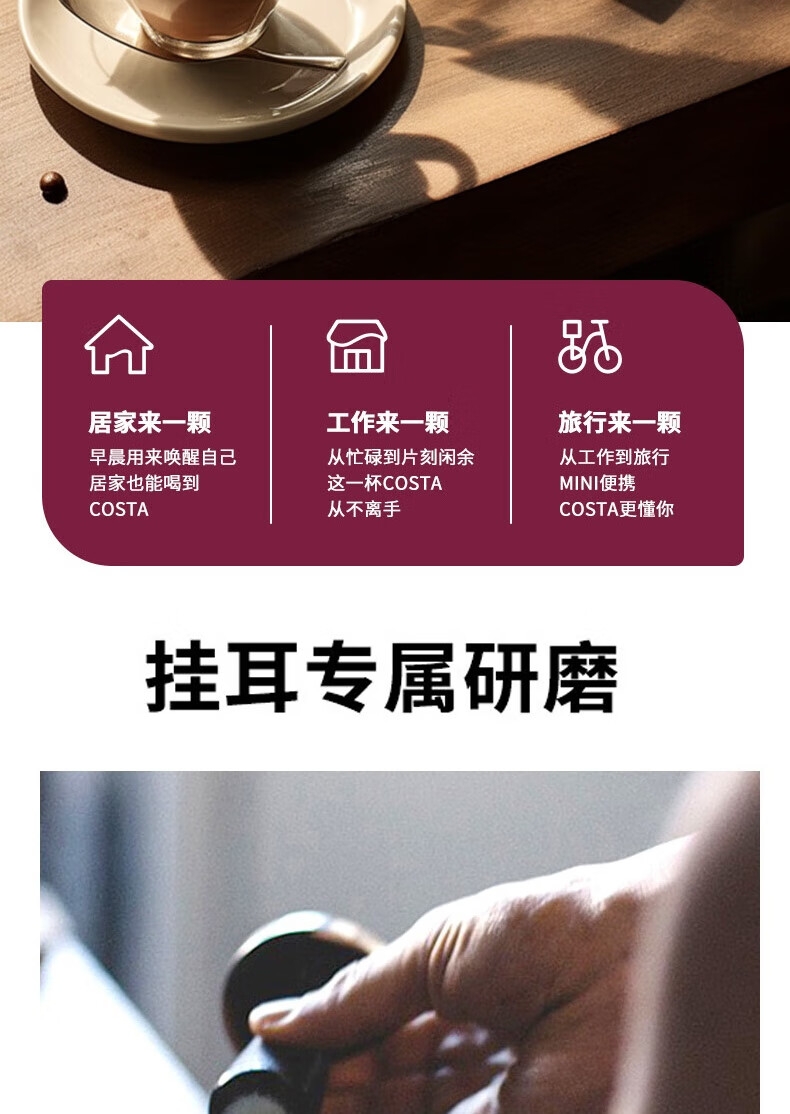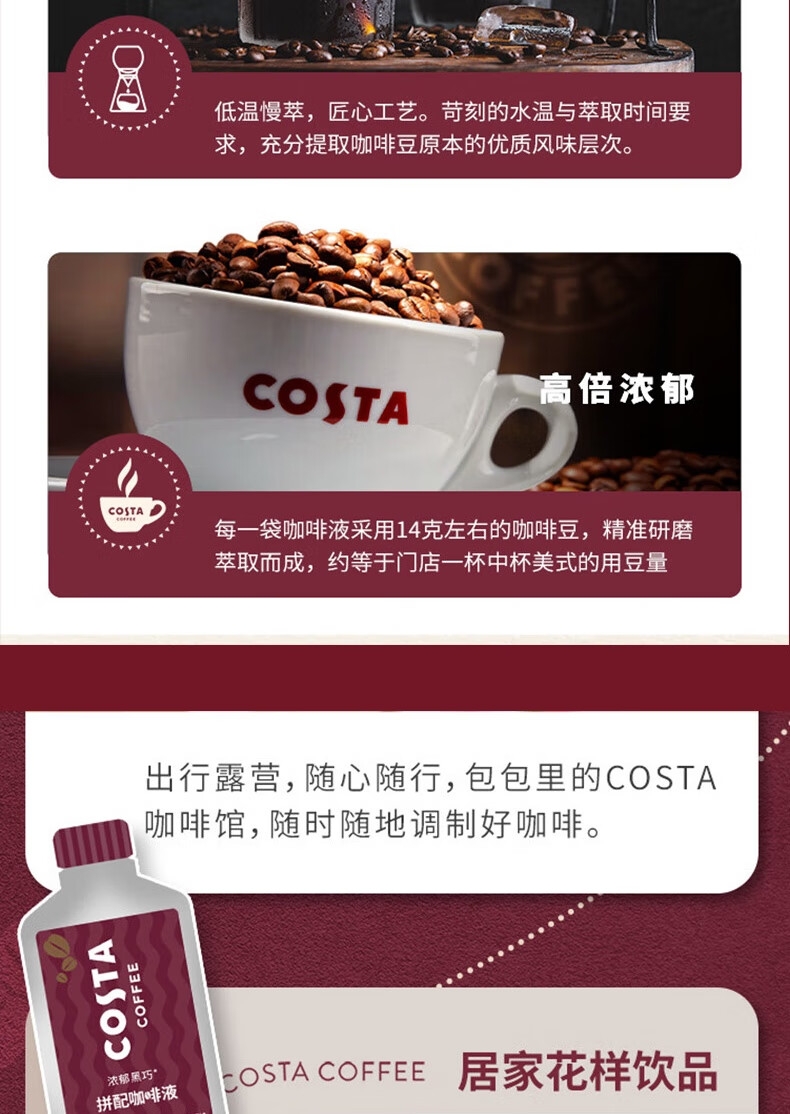 甄选好豆,匠心拼配,通过深度烘焙,释放咖啡豆的风味;出行露营,包包里的COSTA咖啡馆,随时随地调配;不同风味不同选择,搭配不同咖啡好伴侣