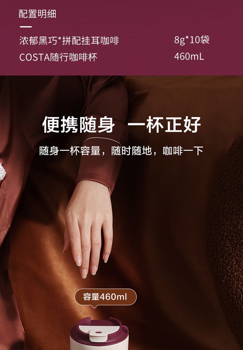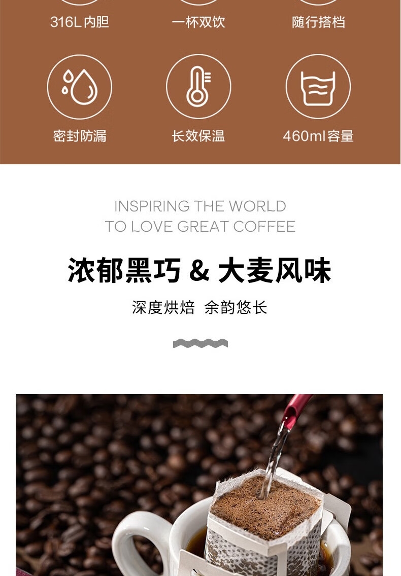 随身一杯容量,随时随地,咖啡一下;一杯双饮 感受大不同;挂耳专属研磨,释放咖啡豆风味