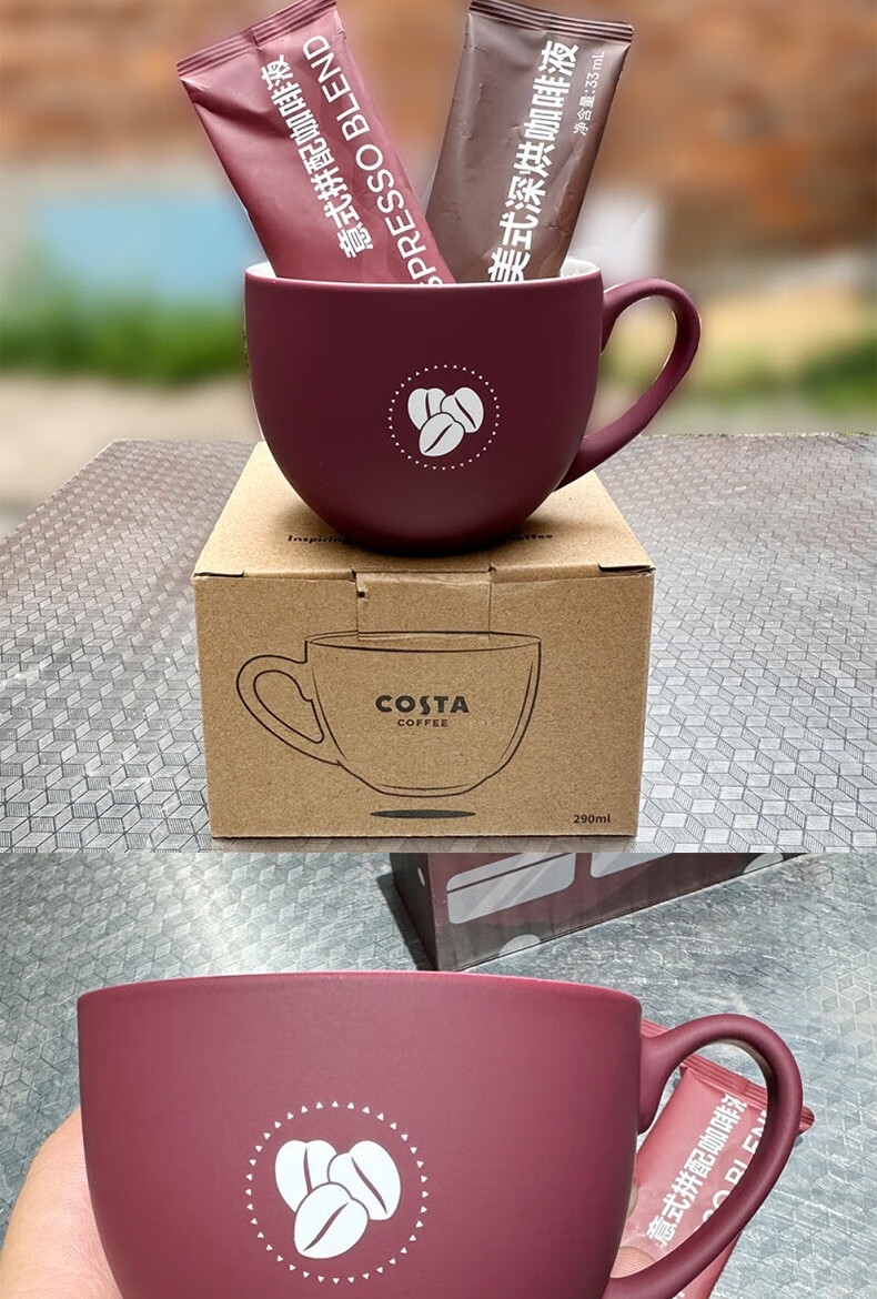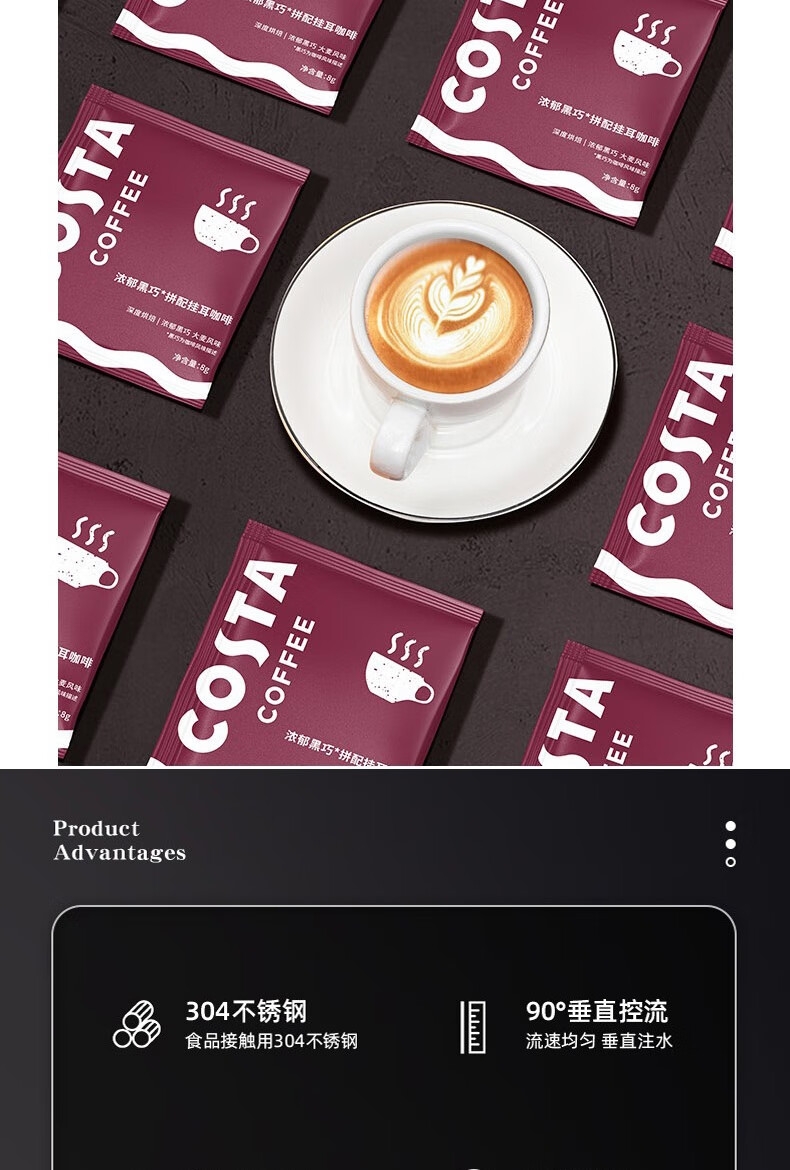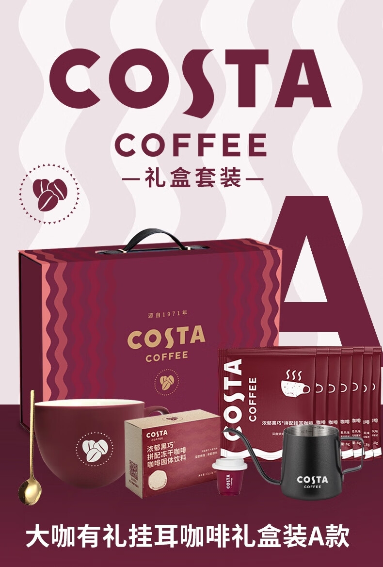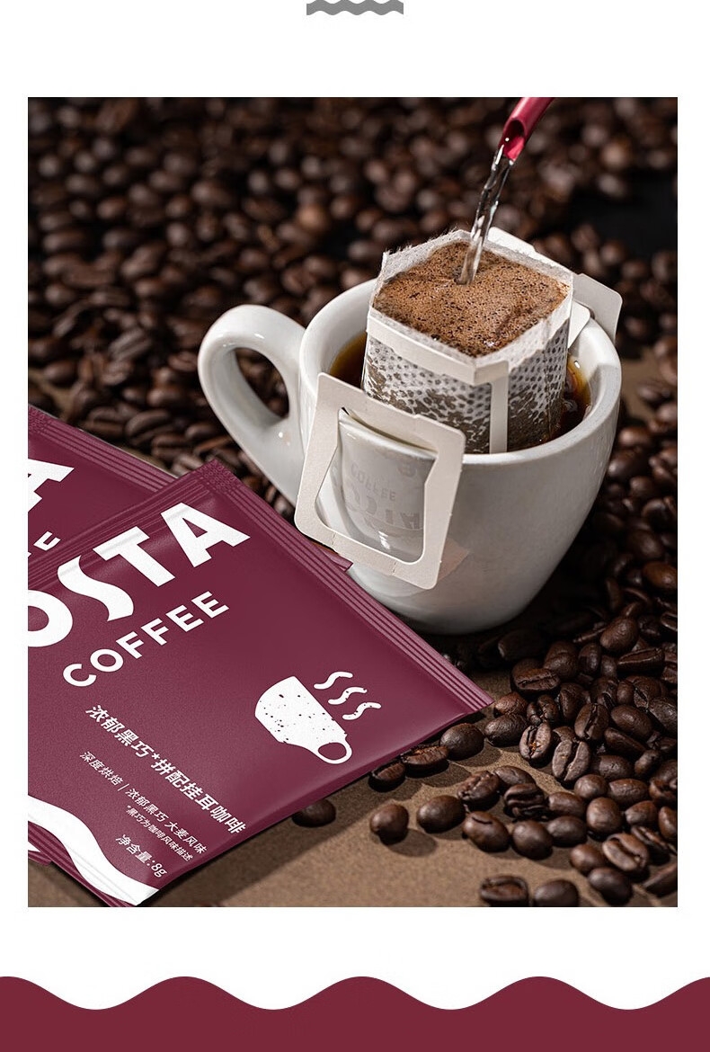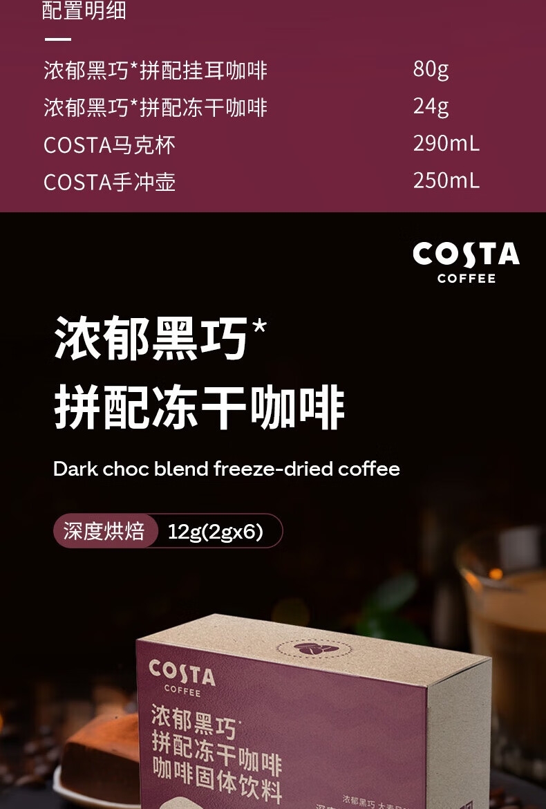 配置清单:COSTA浓郁黑巧挂耳咖啡80g、COSTA浓郁黑巧拼配冻干24g、COSTA鸿运杯、咖啡手冲壶